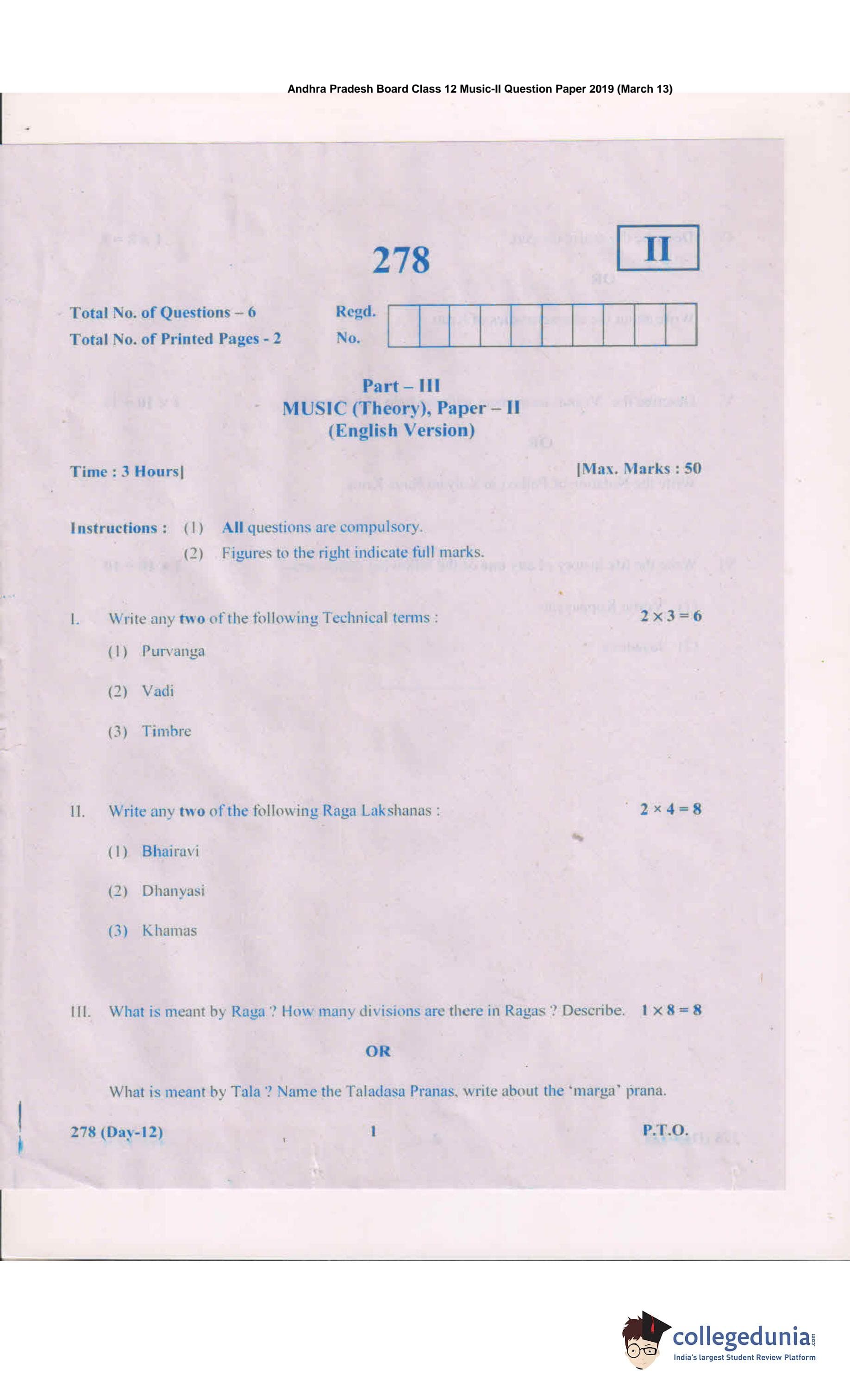 AP Intermediate 2nd year Music Question Paper 2019 with Answer Key 278 is available for download. The exam was conducted by the Andhra Pradesh Board of Intermediate Education (APBIE) on March 13, 2019 in the Morning Session 9 AM to 12 PM. The medium of paper was English.The question paper comprised a total of 6 questions.