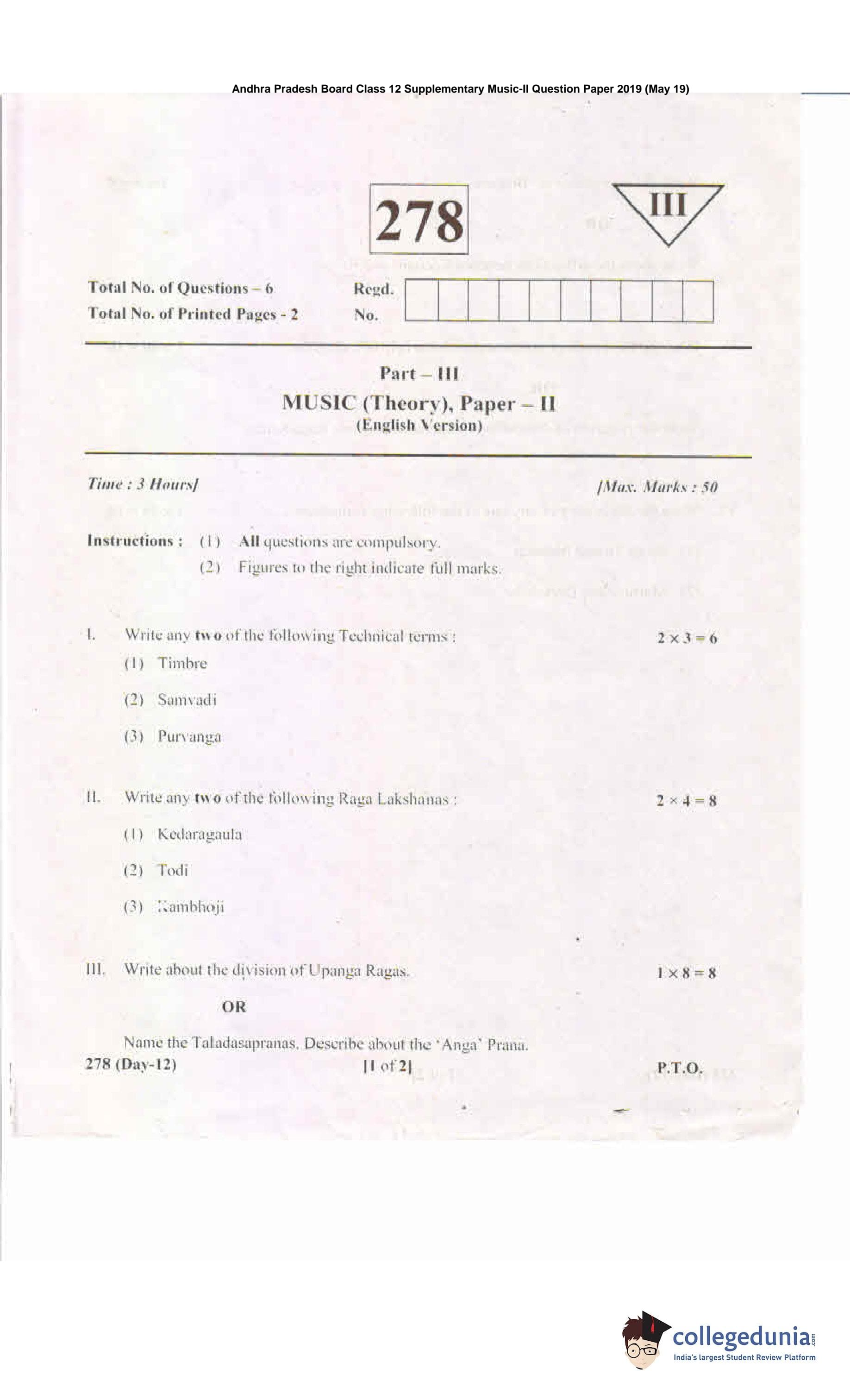 AP Intermediate 2nd year Music Supplementary Question Paper 2019 with Answer Key 278 is available for download. The exam was conducted by the Andhra Pradesh Board of Intermediate Education (APBIE) on May 19, 2019 in the Afternoon Session 2.30 PM to 5.30 PM. The medium of paper was English. The question paper comprised a total of 6 questions.