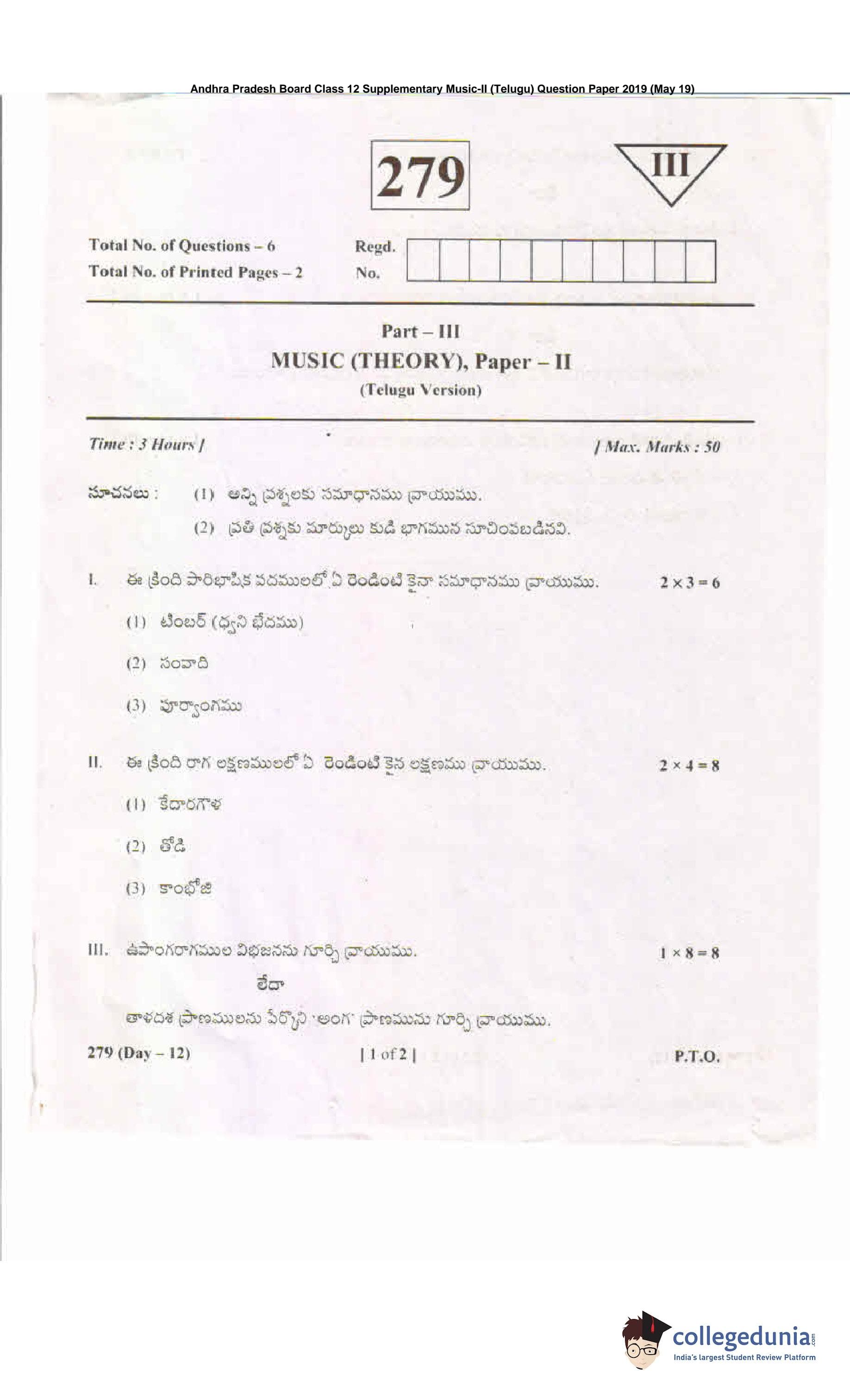 AP Intermediate 2nd year Music (Telugu) Supplementary Question Paper 2019 with Answer Key 279 is available for download. The exam was conducted by the Andhra Pradesh Board of Intermediate Education (APBIE) on May 19, 2019 in the Afternoon Session 2.30 PM to 5.30 PM. The medium of paper was Telugu. The question paper comprised a total of 6 questions.