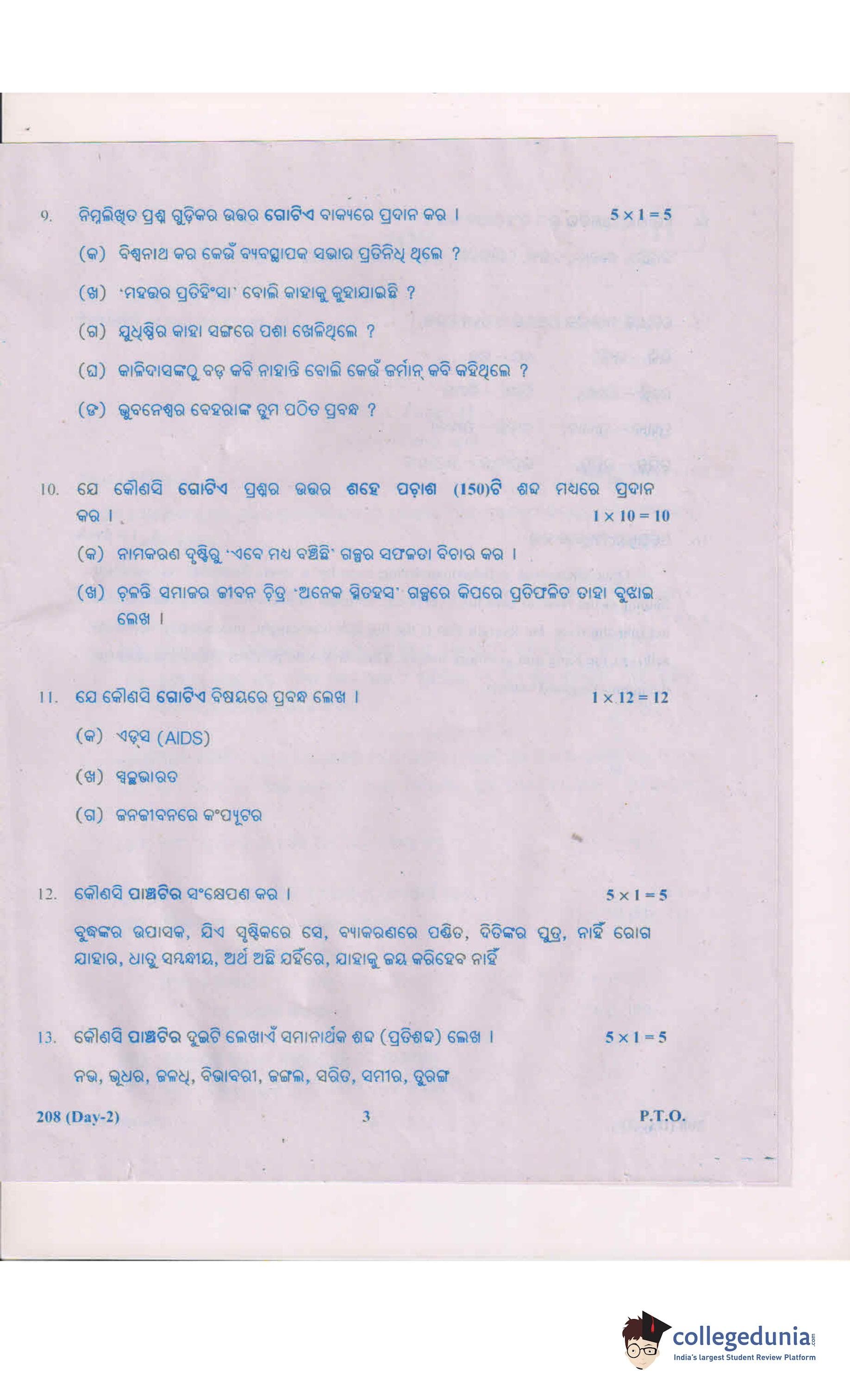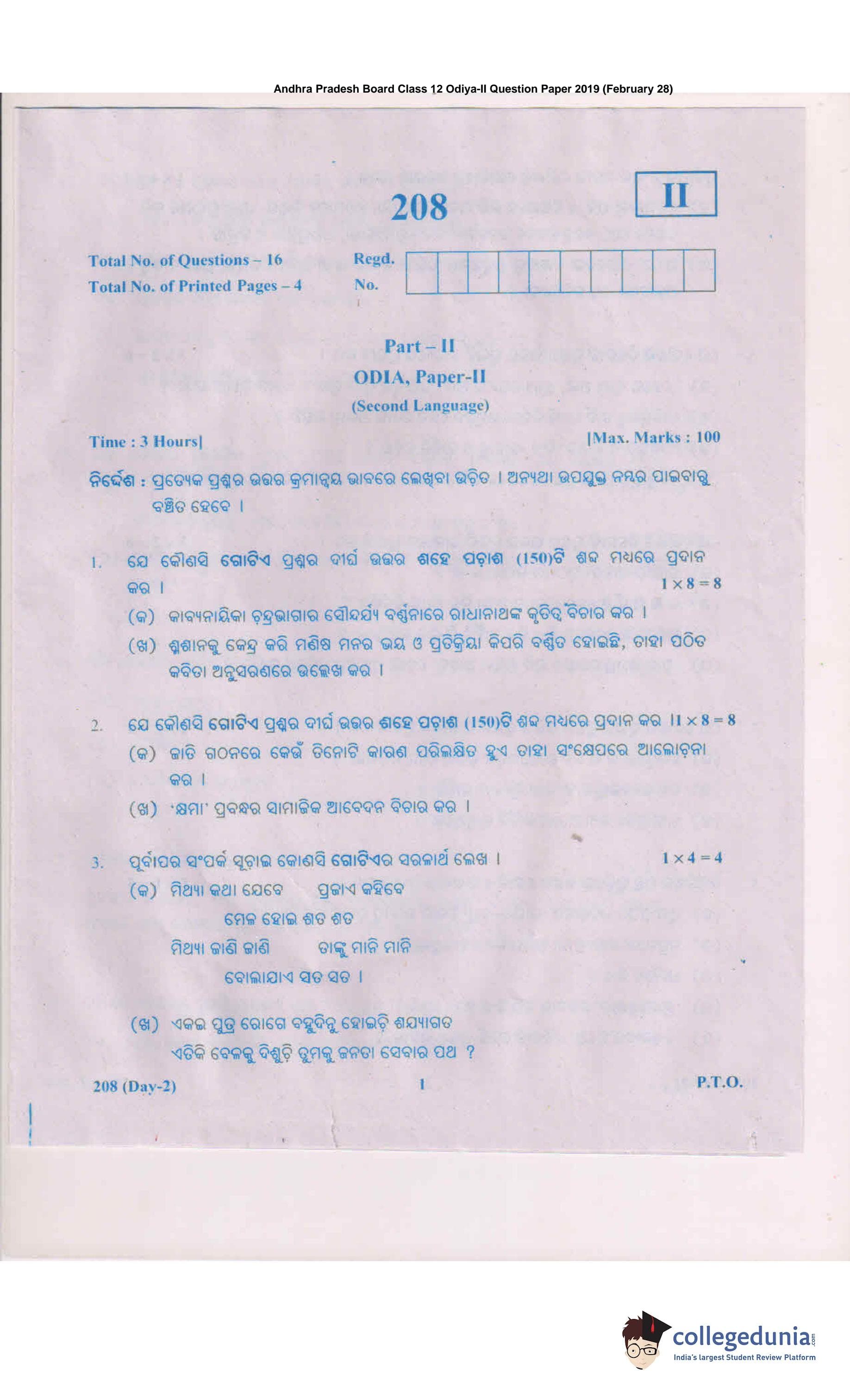 AP Intermediate 2nd year Odiya Question Paper 2019 with Answer Key 208 is available for download. The exam was conducted by the Andhra Pradesh Board of Intermediate Education (APBIE) on February 28, 2019 in the Morning Session 9 AM to 12 PM. The medium of paper was Odiya.The question paper comprised a total of 16 questions.
