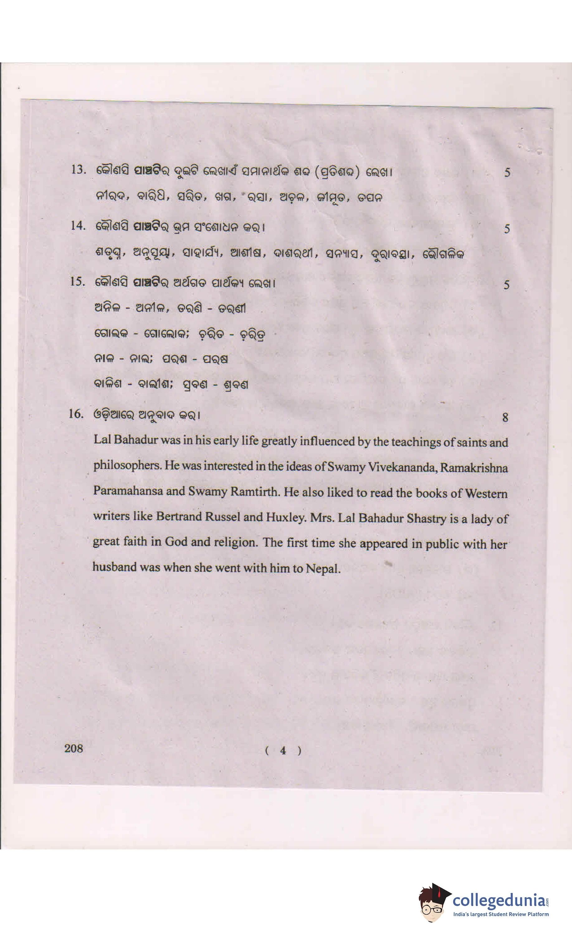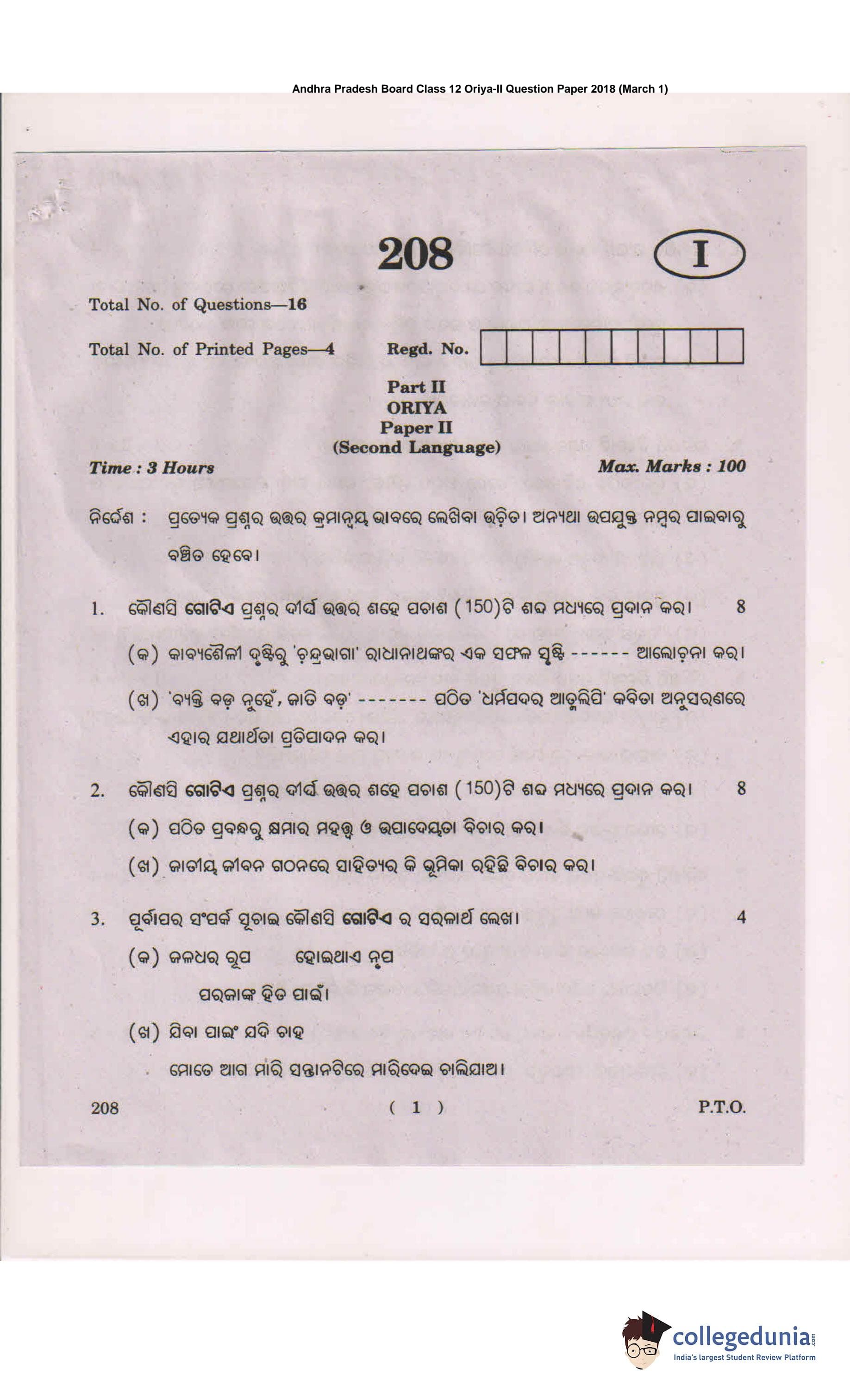 AP Intermediate 2nd year Oriya Question Paper 2018 with Answer Key (March 1)