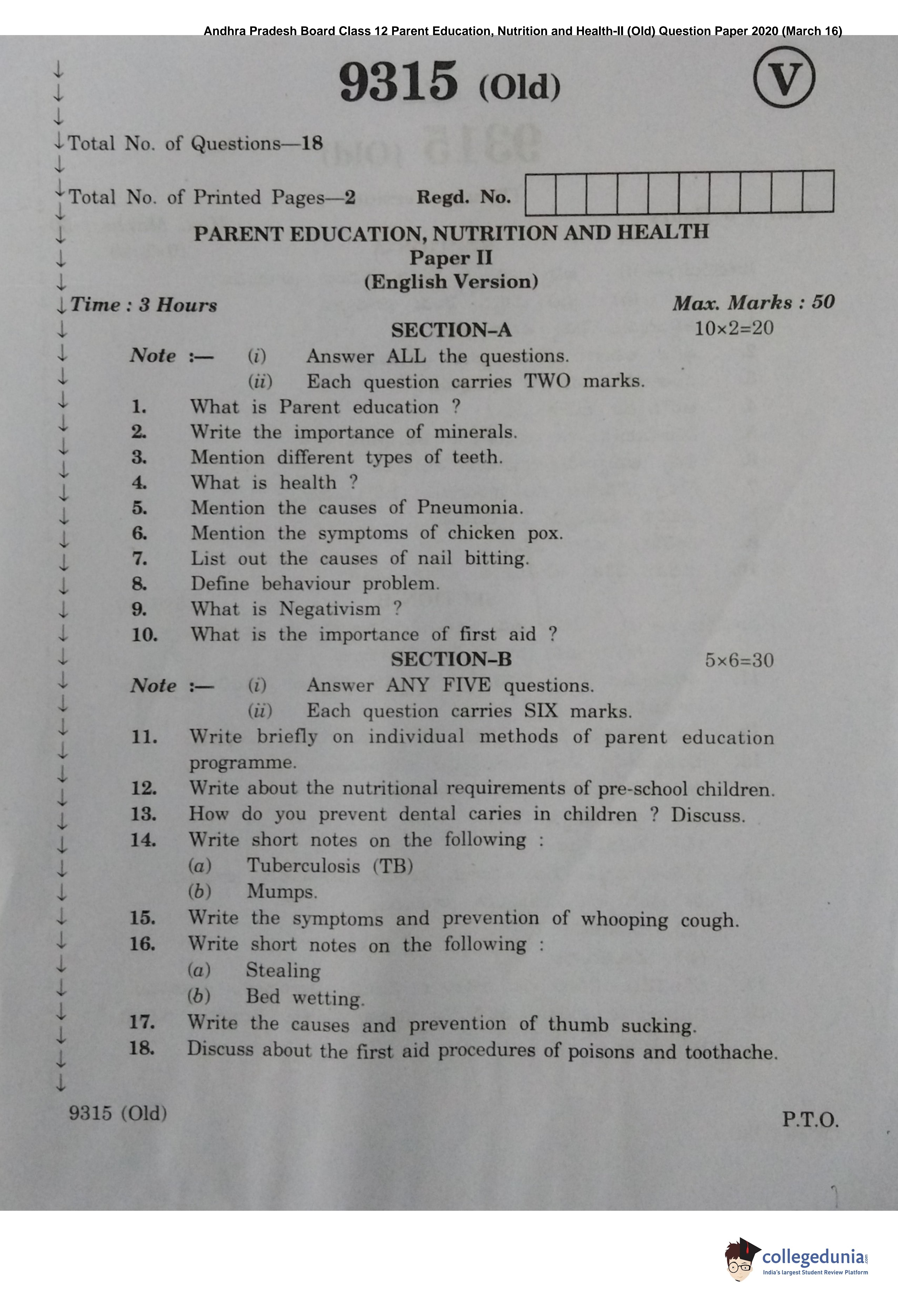 AP Intermediate 2nd year Parent Education, Nutrition and Health (Old) Question Paper 2020 with Answer Key is available for download. The exam was conducted by the Andhra Pradesh Board of Intermediate Education (APBIE) on March 16, 2020 in the Morning Session 9 AM to 12 PM. The medium of paper was English and Telugu.The question paper comprised a total of 18 questions divided among 2 sections.