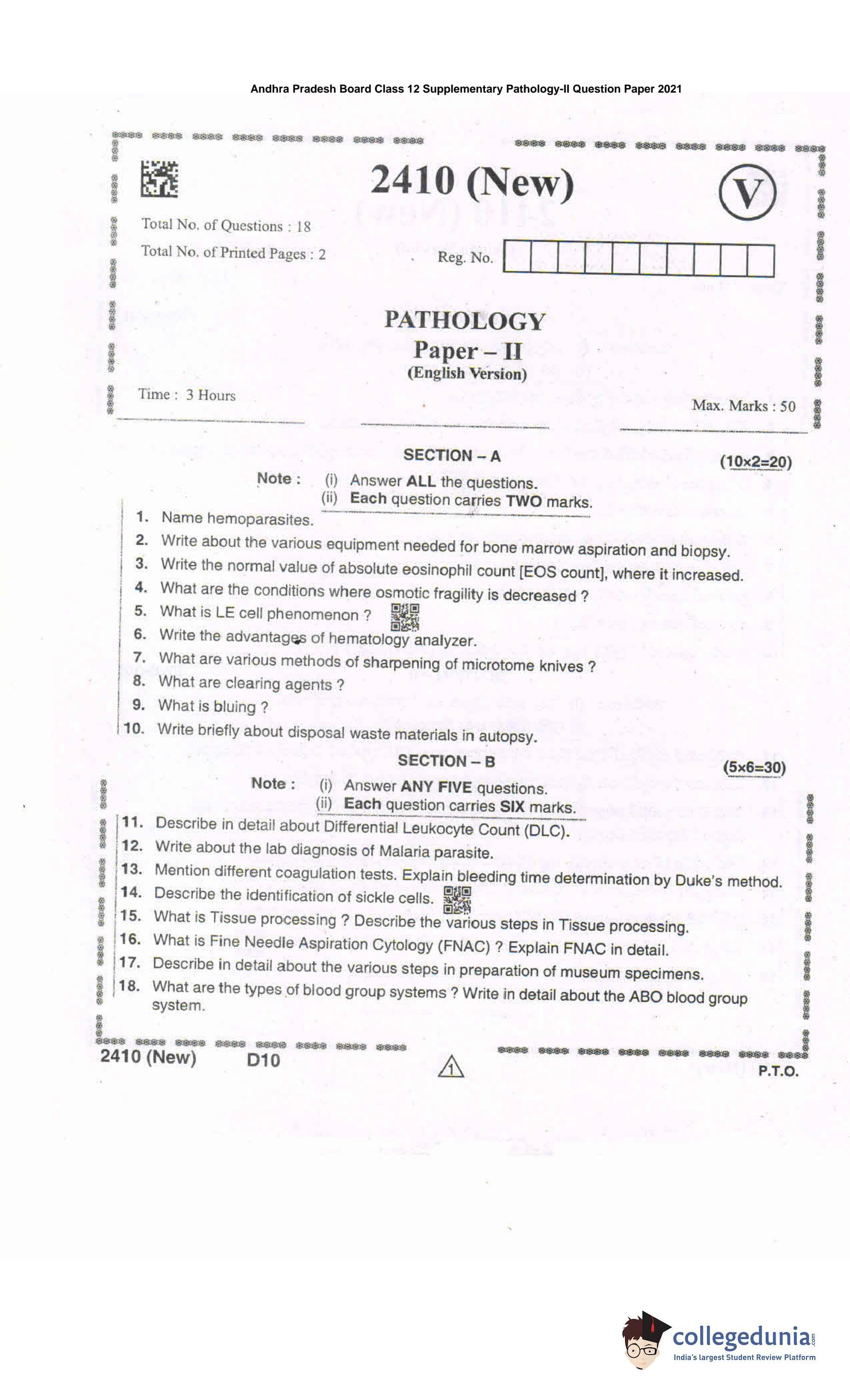 AP Intermediate 2nd year Pathology Supplementary Question Paper 2021 with Answer Key is available for download. The exam was conducted by the Andhra Pradesh Board of Intermediate Education (APBIE). The medium of paper was English and Telugu. The question paper comprised a total of 18 questions divided among 2 sections.