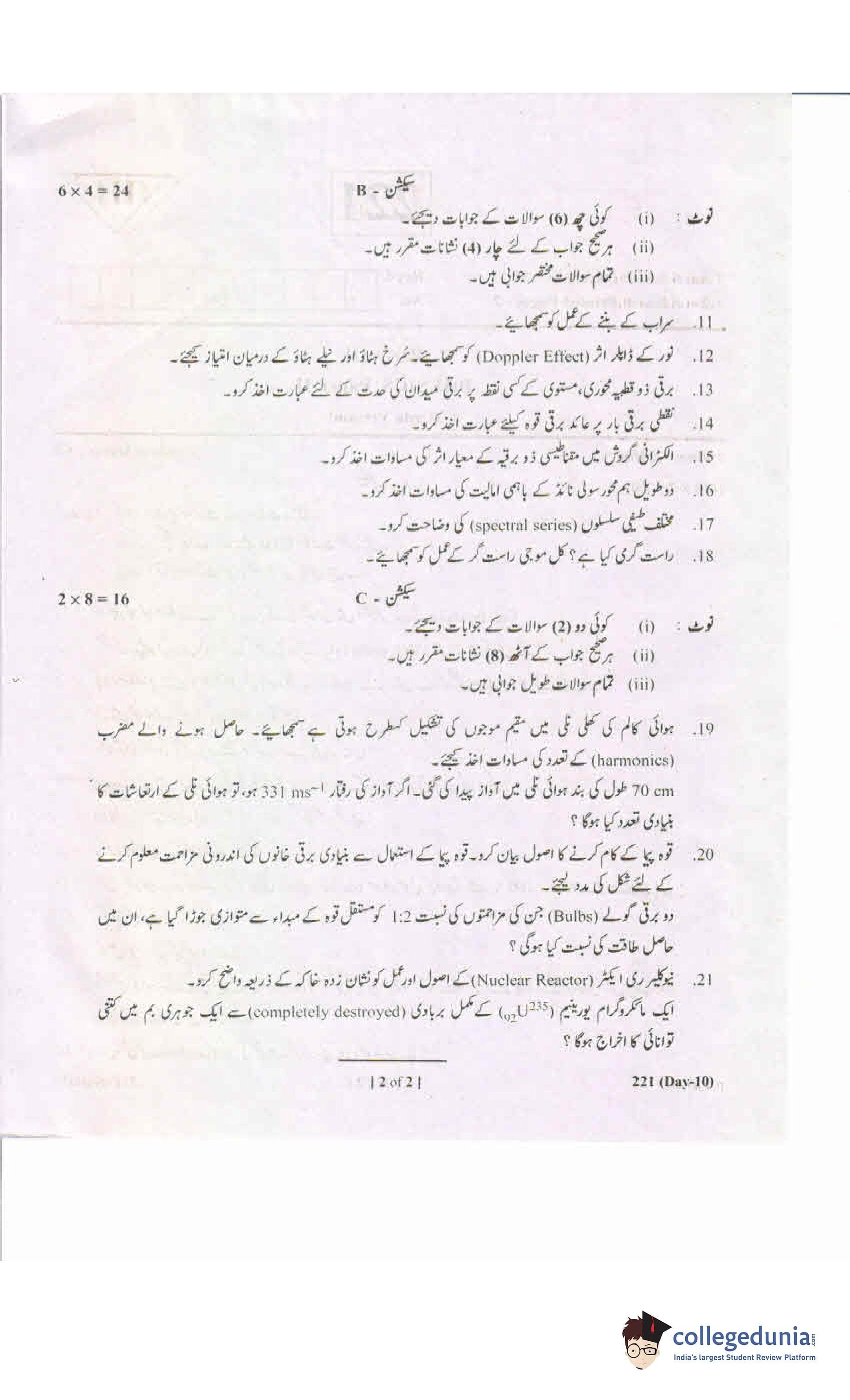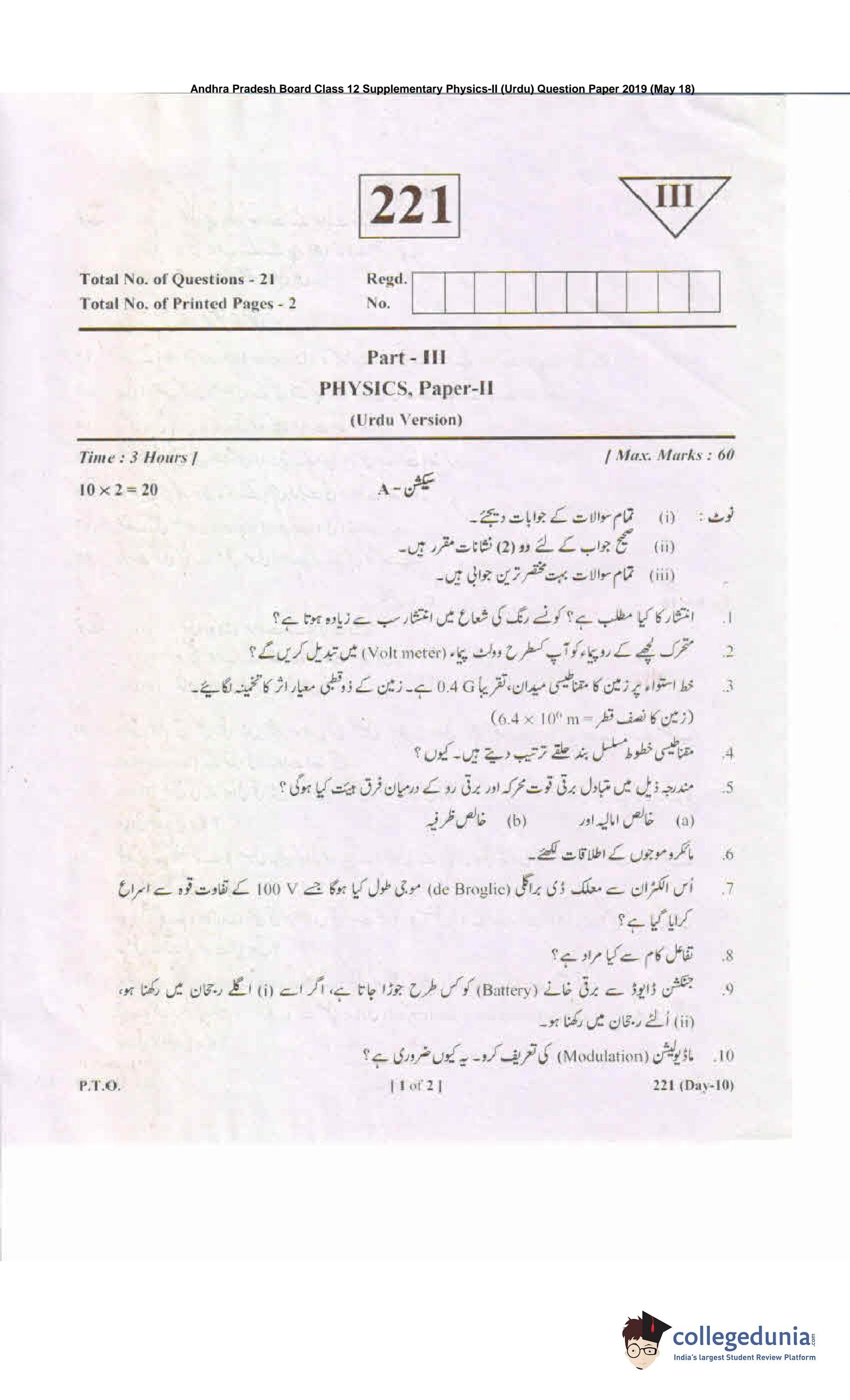 AP Intermediate 2nd year Physics (Urdu) Supplementary Question Paper 2019 with Answer Key 221 is available for download. The exam was conducted by the Andhra Pradesh Board of Intermediate Education (APBIE) on May 18, 2019 in the Afternoon Session 2.30 PM to 5.30 PM. The medium of paper was Urdu. The question paper comprised a total of 21 questions divided among 3 sections.