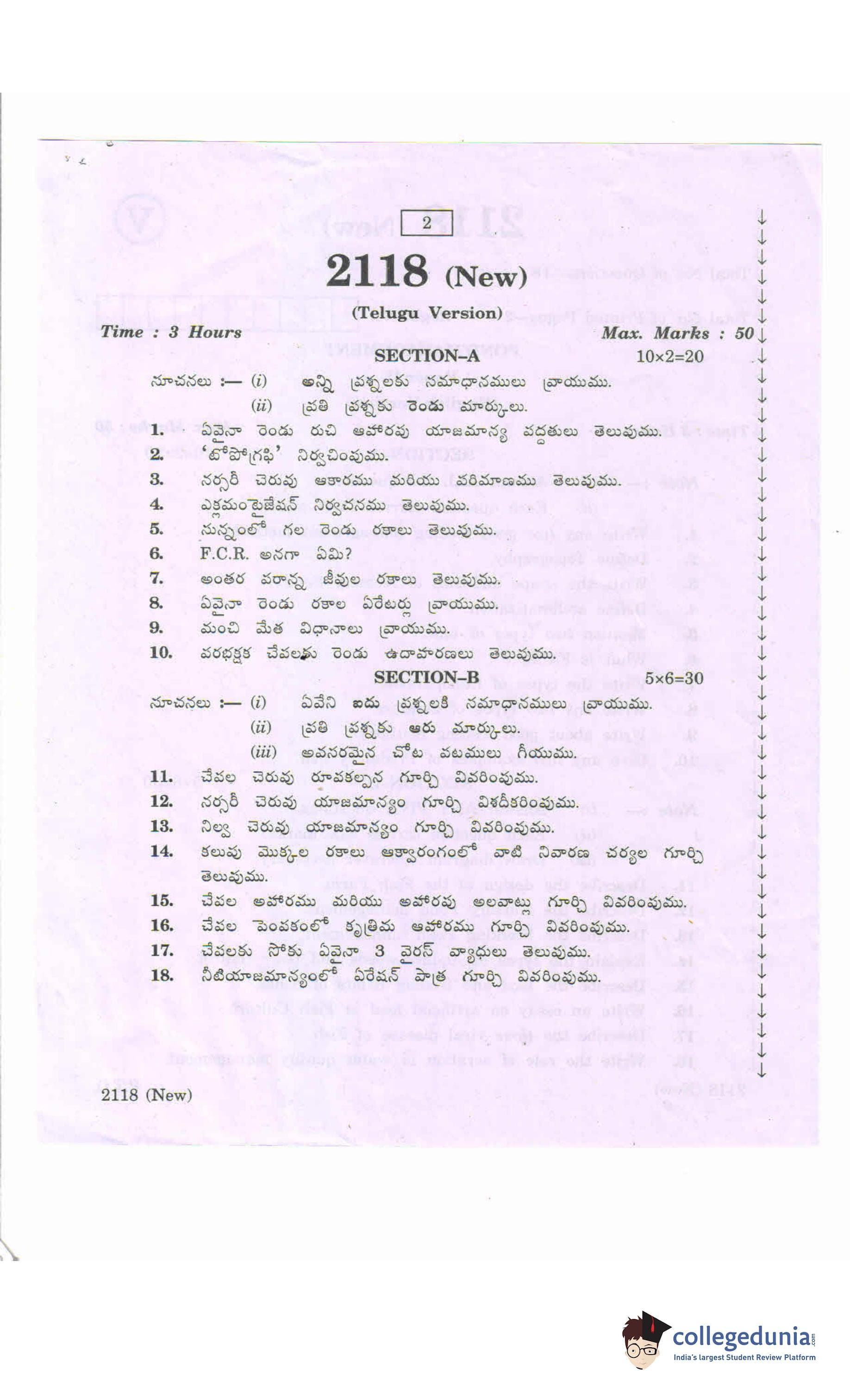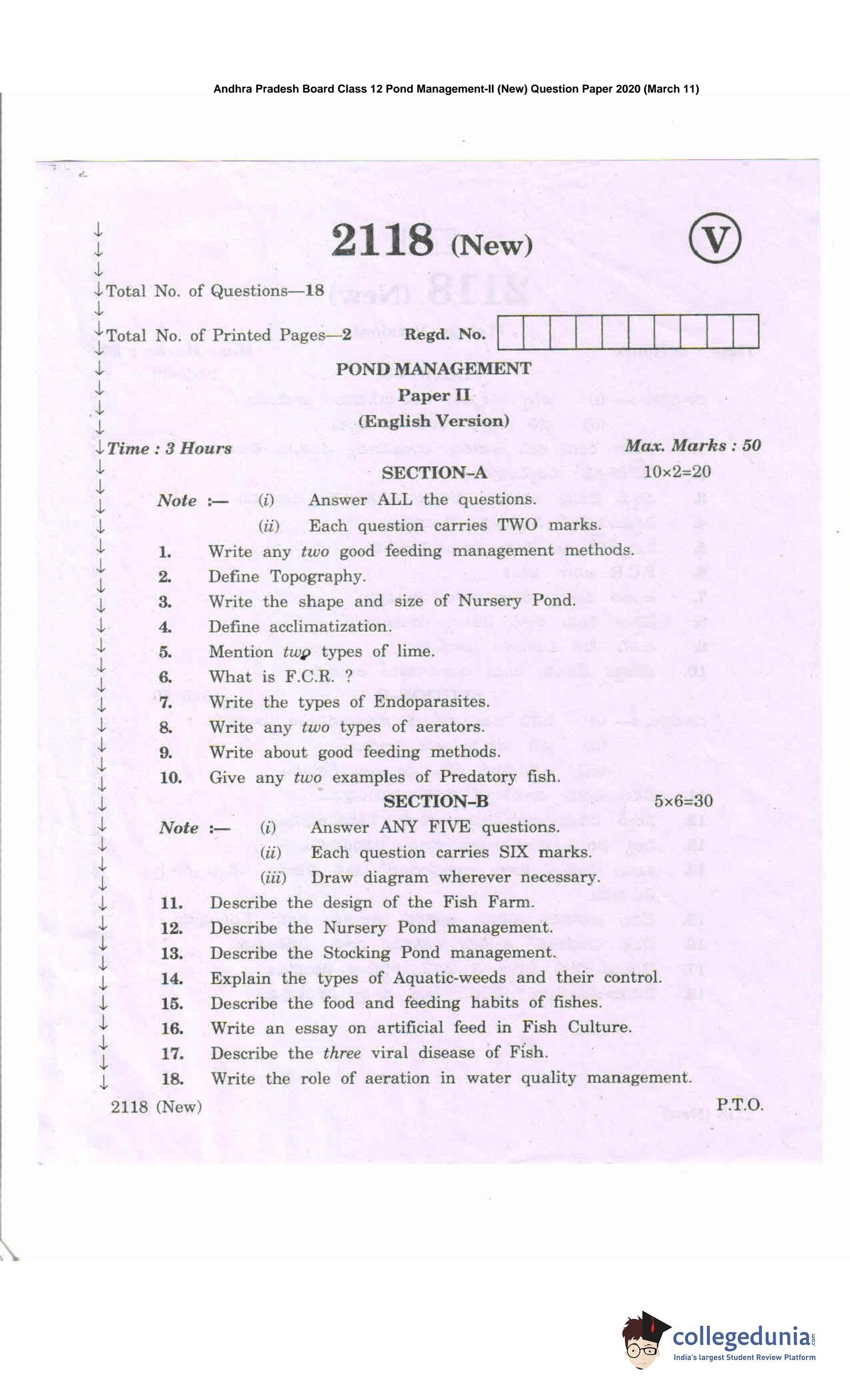 AP Intermediate 2nd year Pond Management (New) Question Paper 2020 with Answer Key (March 11)