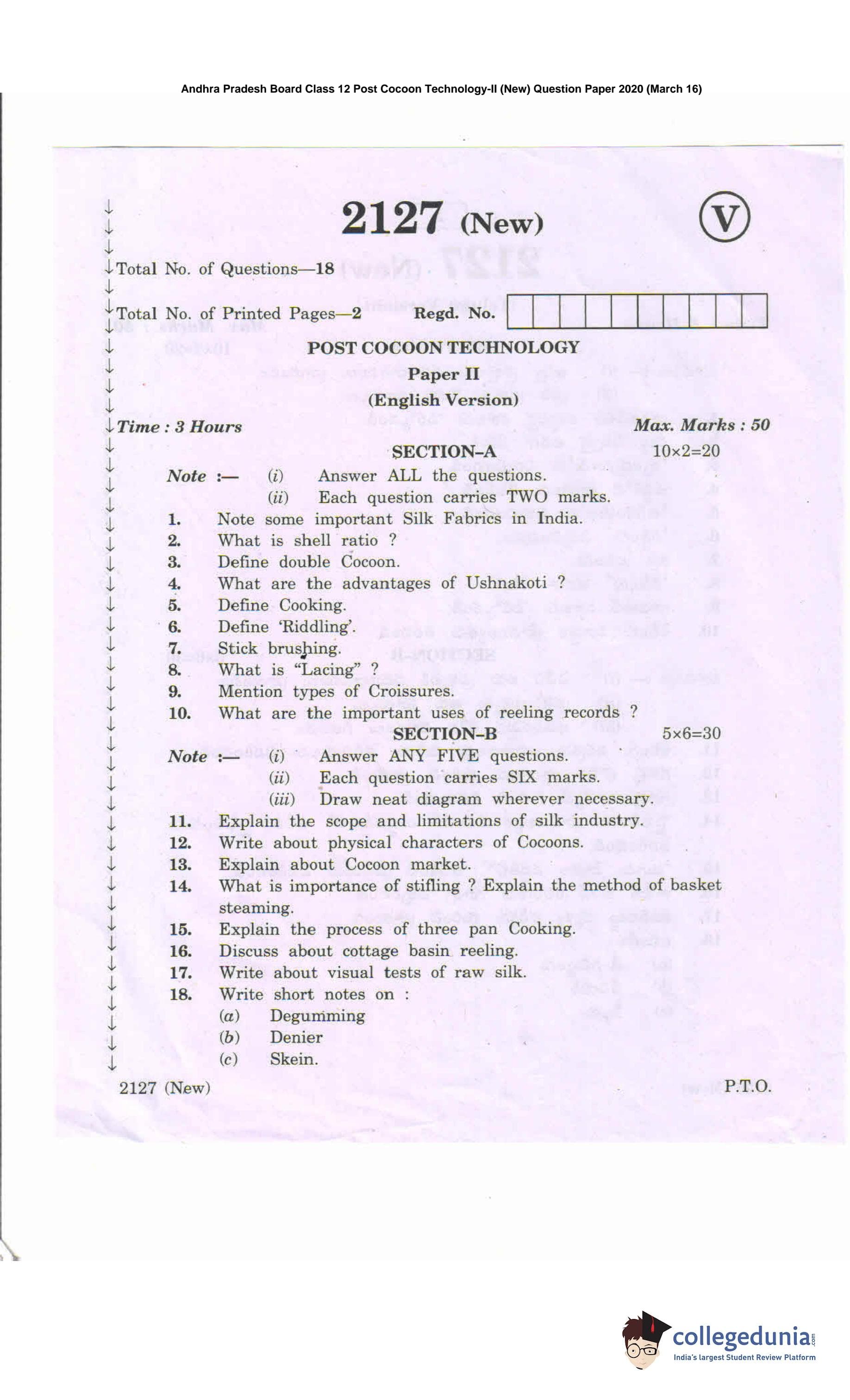 AP Intermediate 2nd year Post Cocoon Technology (New) Question Paper 2020 with Answer Key is available for download. The exam was conducted by the Andhra Pradesh Board of Intermediate Education (APBIE) on March 16, 2020 in the Morning Session 9 AM to 12 PM. The medium of paper was English and Telugu.The question paper comprised a total of 18 questions divided among 2 sections.
