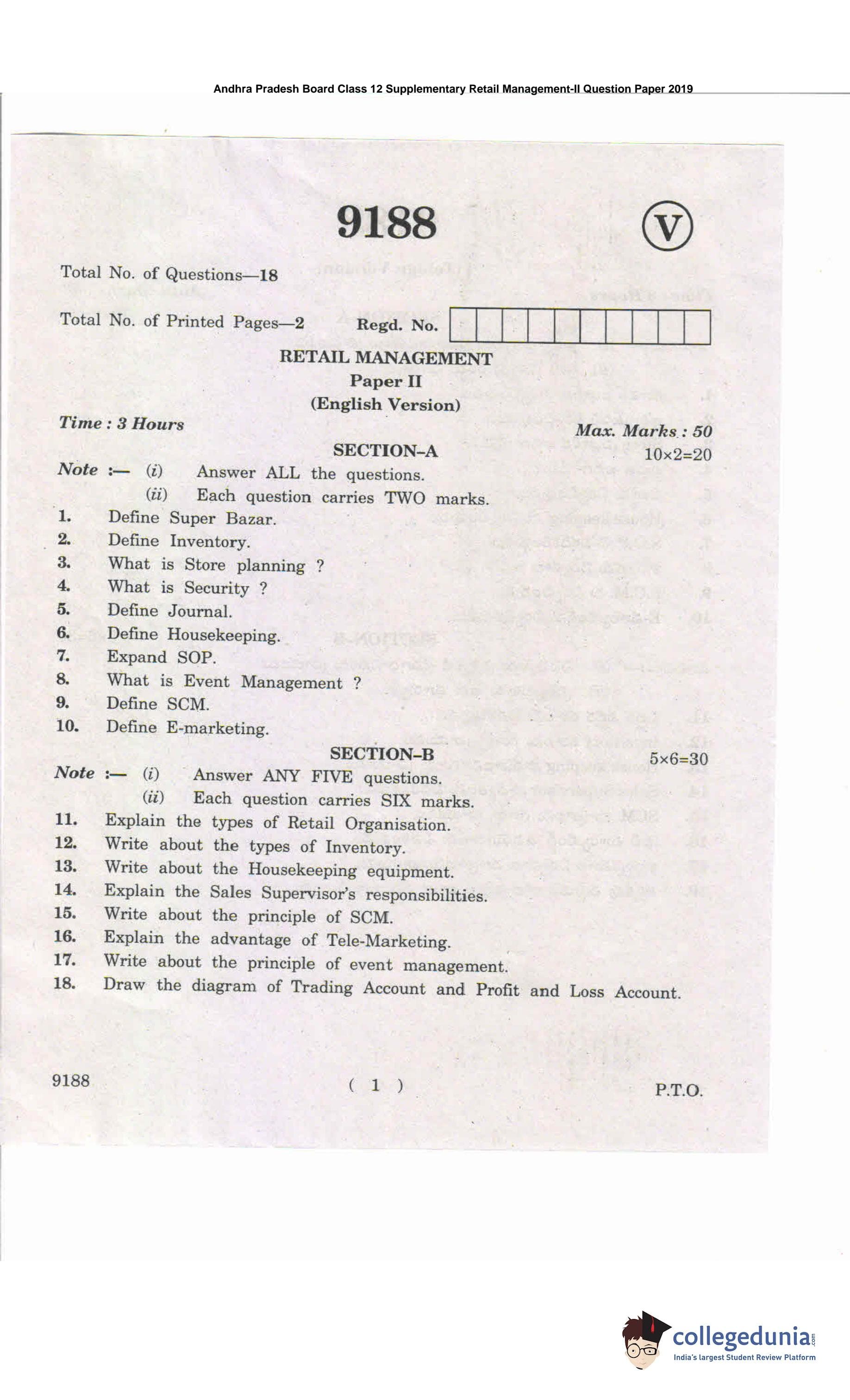 AP Intermediate 2nd year Retail Management Supplementary Question Paper 2019 with Answer Key 9188 is available for download. The exam was conducted by the Andhra Pradesh Board of Intermediate Education (APBIE). The medium of paper was English and Telugu. The question paper comprised a total of 18 questions divided among 2 sections.