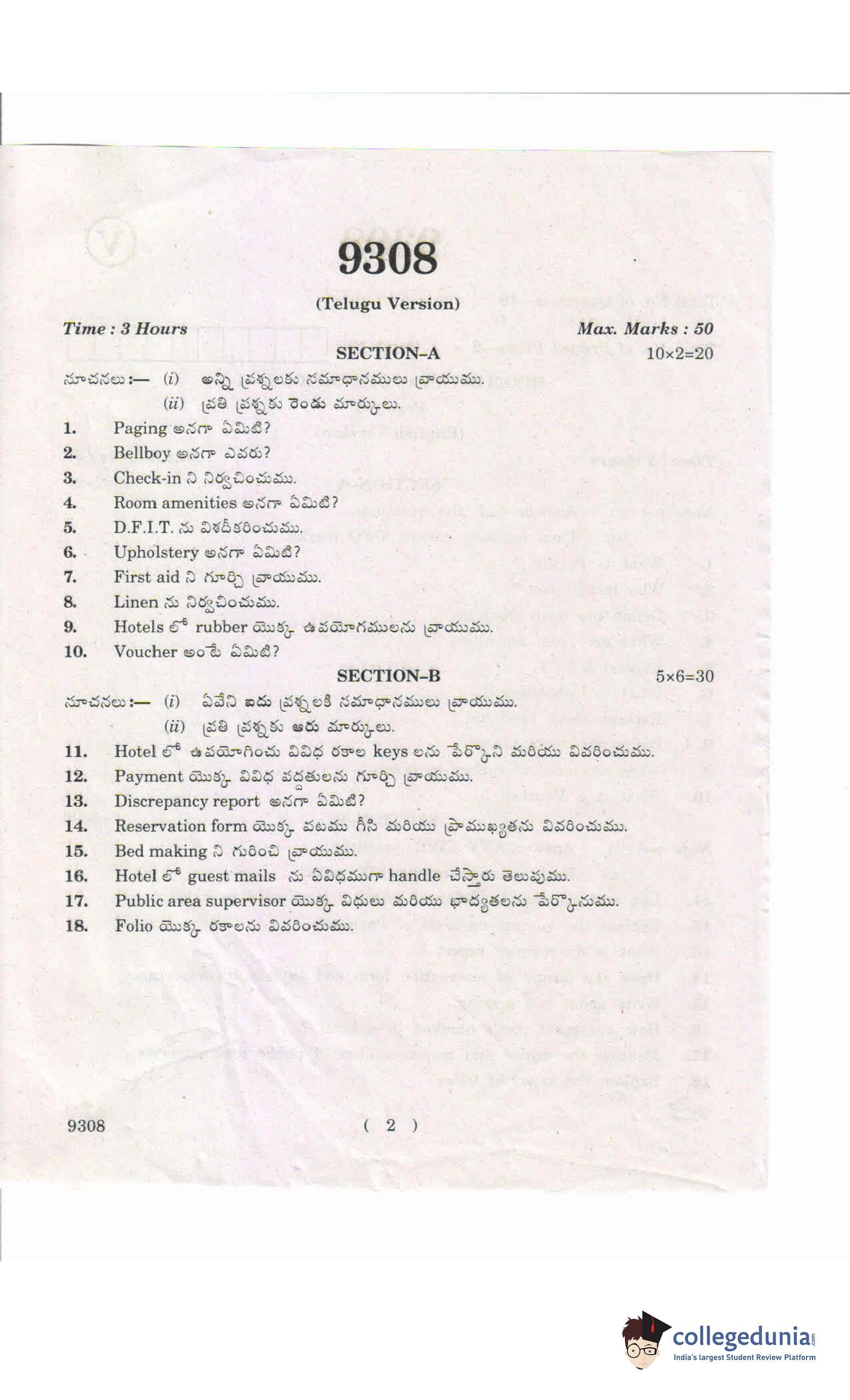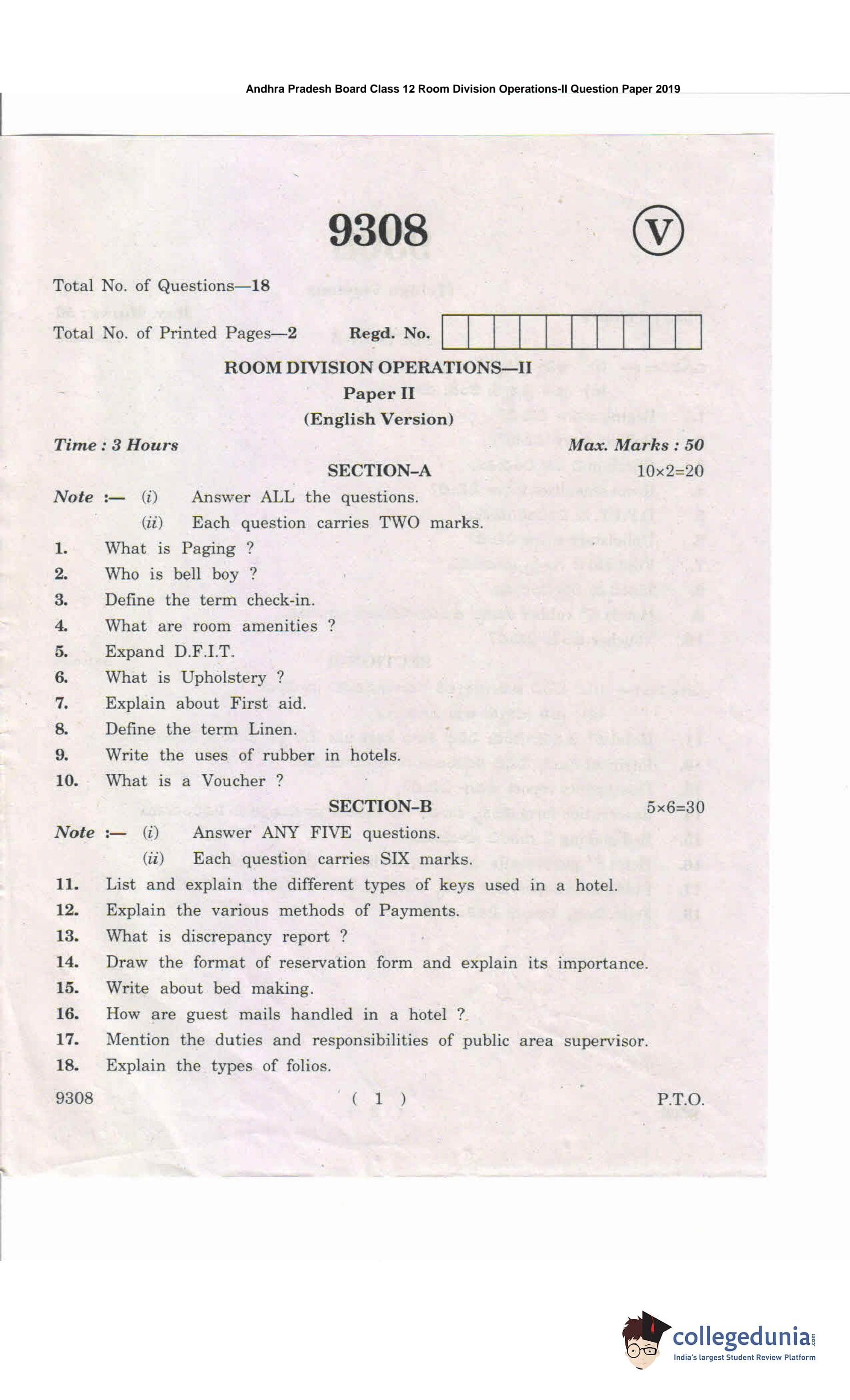 AP Intermediate 2nd year Room Division Operations Question Paper 2019 with Answer Key is available for download. The exam was conducted by the Andhra Pradesh Board of Intermediate Education (APBIE) . The medium of paper was English and Telugu.The question paper comprised a total of 18 questions divided among 2 sections.
