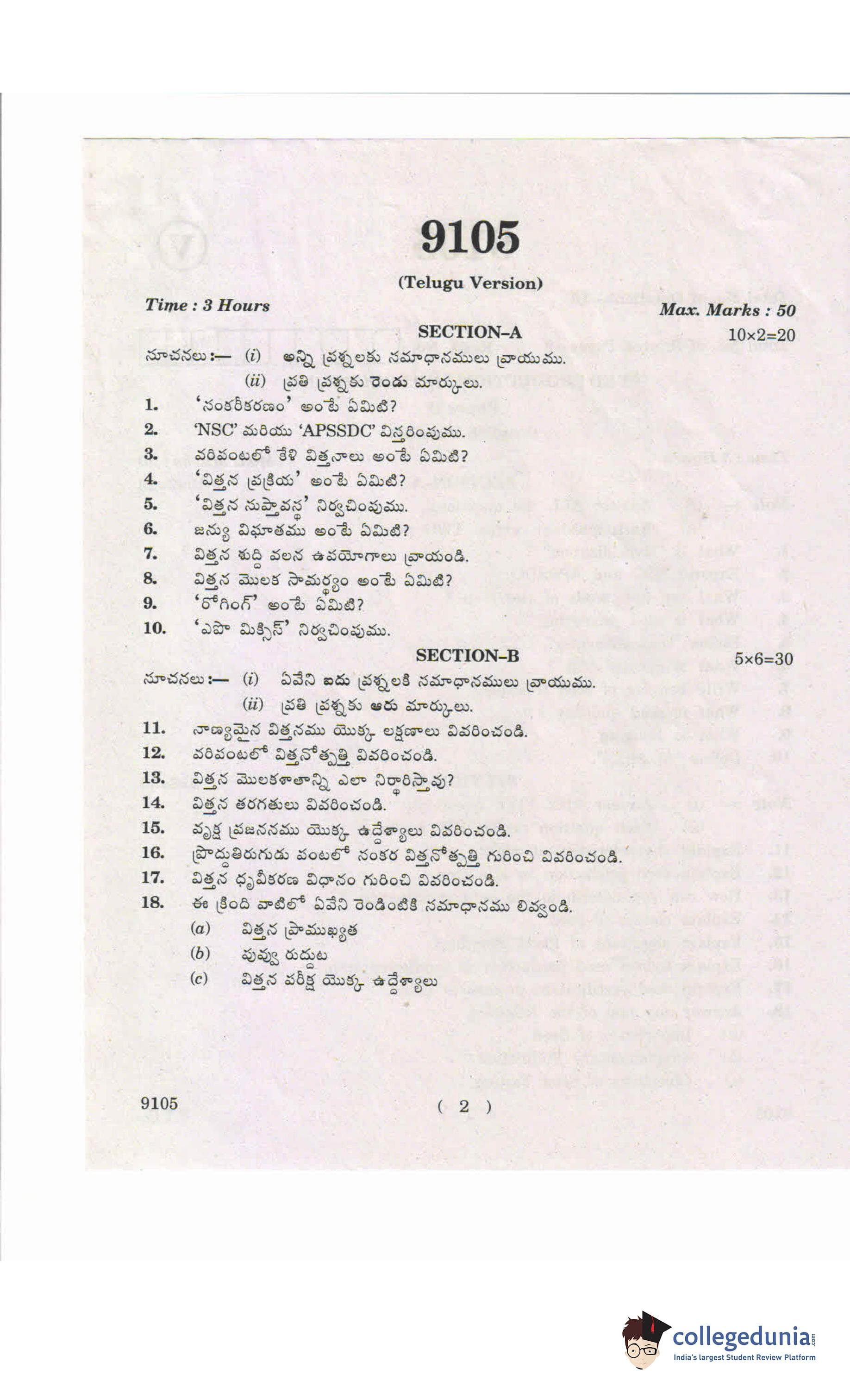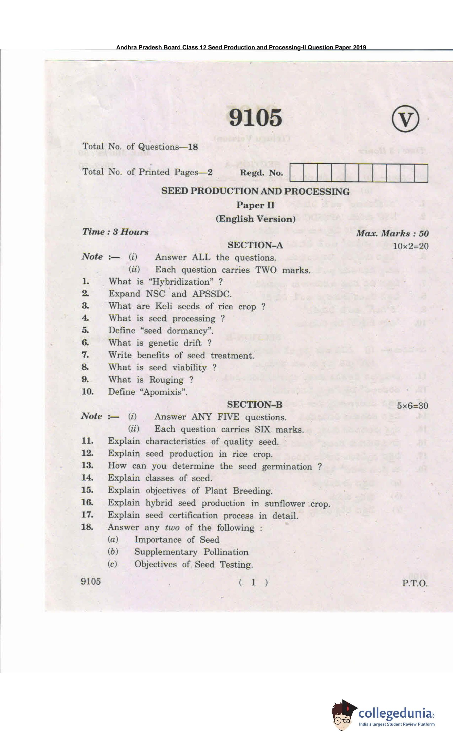 AP Intermediate 2nd year Seed Production and Processing Question Paper 2019 with Answer Key is available for download. The exam was conducted by the Andhra Pradesh Board of Intermediate Education (APBIE) . The medium of paper was English and Telugu.The question paper comprised a total of 18 questions divided among 2 sections.