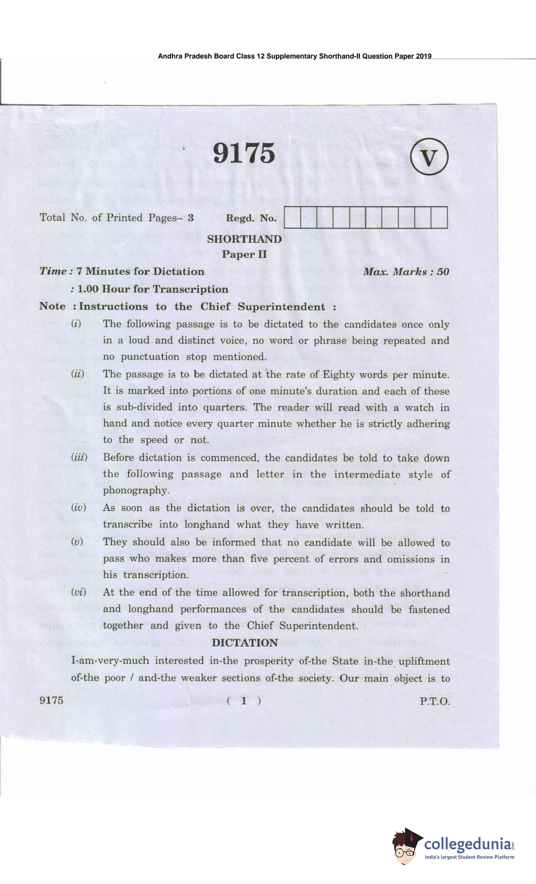 AP Intermediate 2nd year Shorthand Supplementary Question Paper 2019 with Answer Key 9175 is available for download. The exam was conducted by the Andhra Pradesh Board of Intermediate Education (APBIE). The medium of paper was English and Telugu. The question paper comprised a total of 18 questions divided among 2 sections.