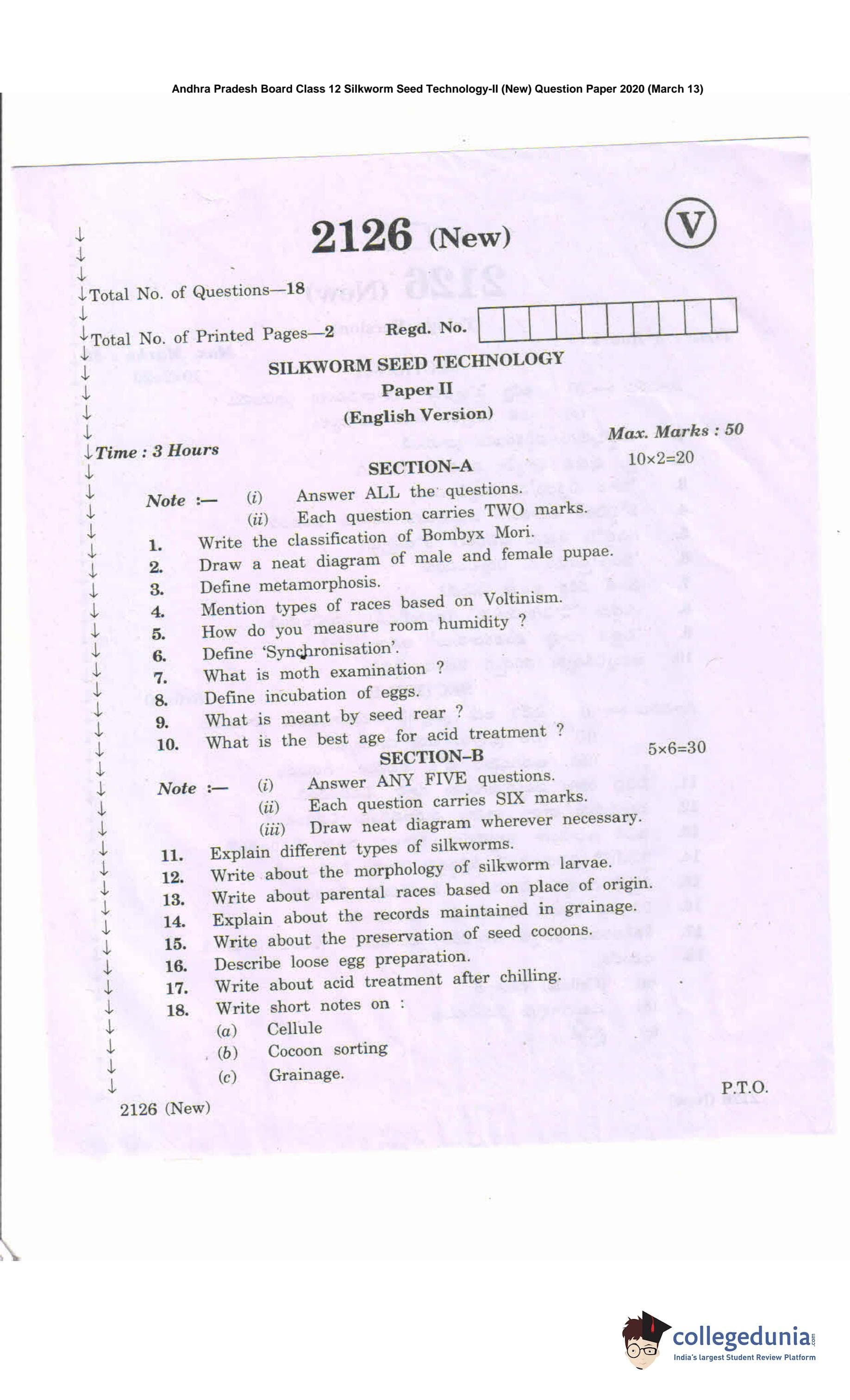 AP Intermediate 2nd year Silkworm Seed Technology (New) Question Paper 2020 with Answer Key (March 13)