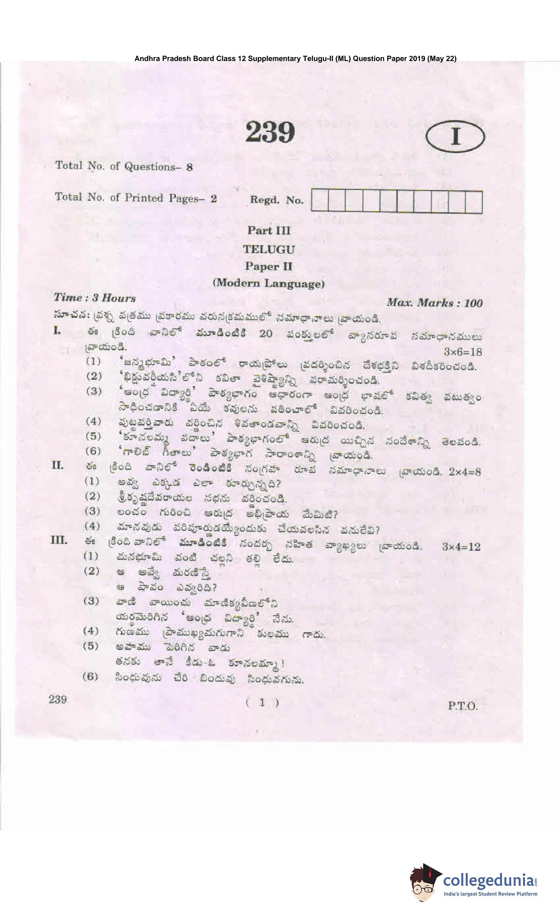 AP Intermediate 2nd year Telugu (ML) 239 Supplementary Question Paper 2019 (May 22)