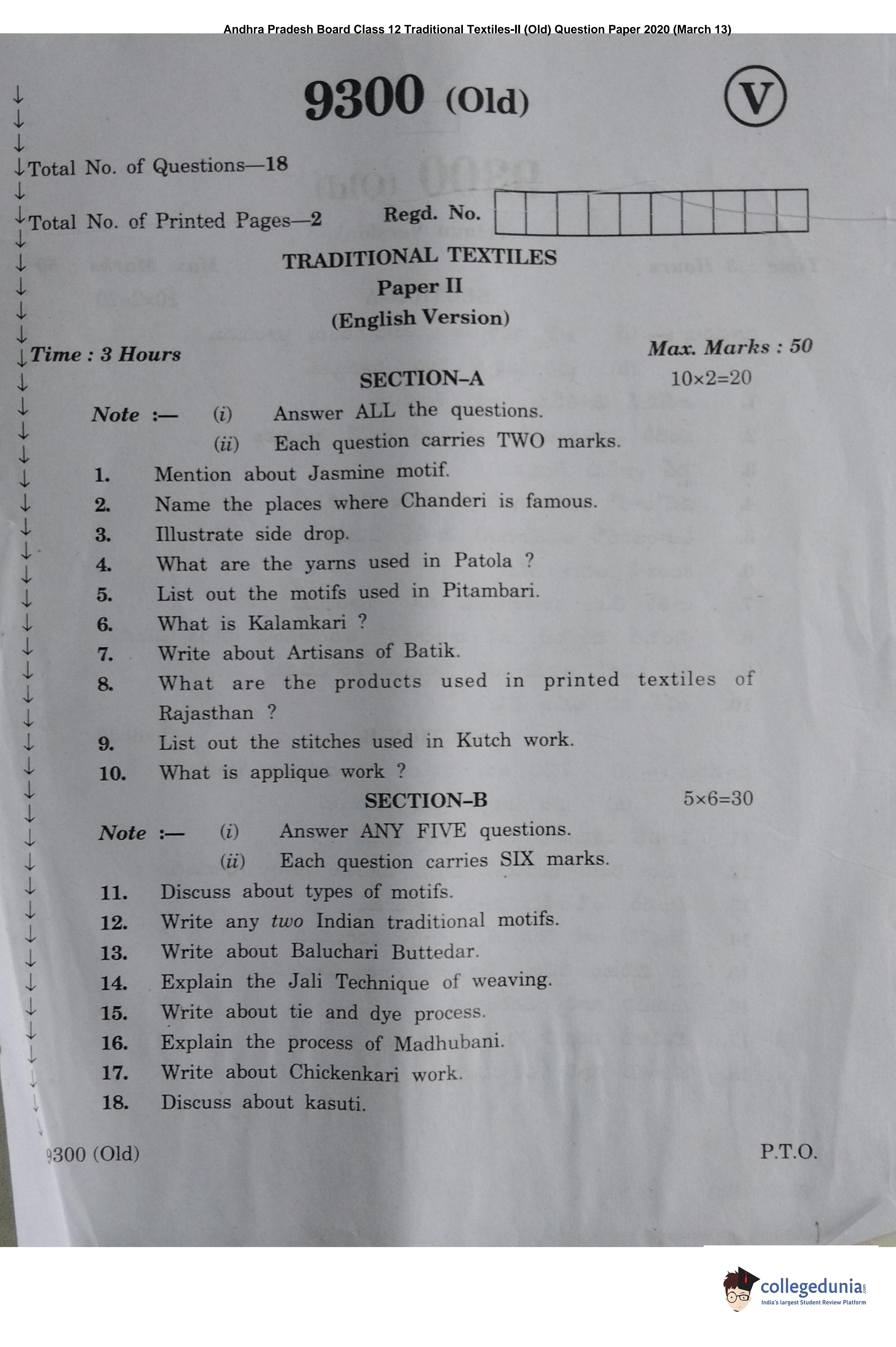 AP Intermediate 2nd year Traditional Textiles (Old) Question Paper 2020 with Answer Key (March 13)