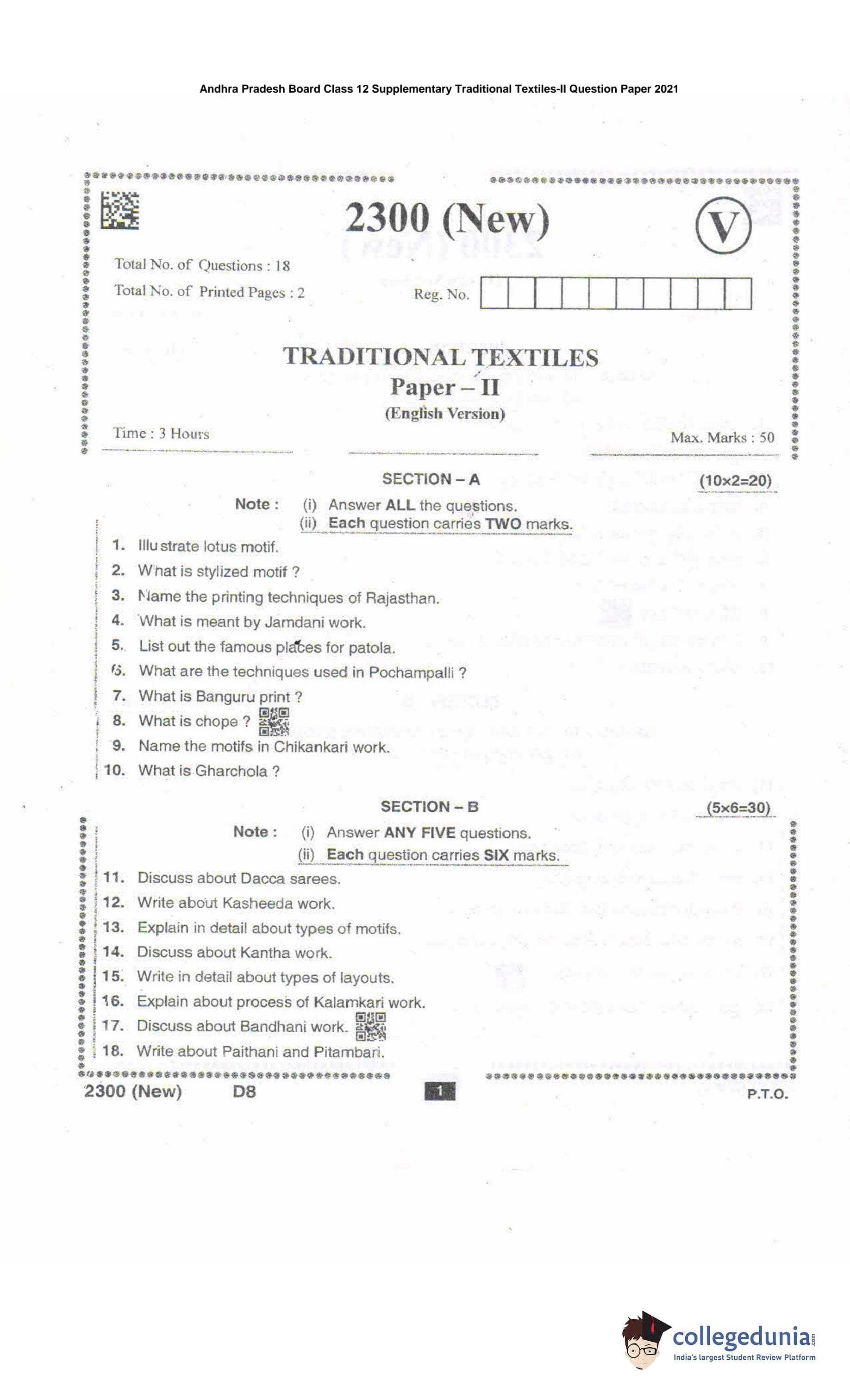 AP Intermediate 2nd year Traditional Textiles Supplementary Question Paper 2021 with Answer Key is available for download. The exam was conducted by the Andhra Pradesh Board of Intermediate Education (APBIE). The medium of paper was English and Telugu. The question paper comprised a total of 18 questions divided among 2 sections.