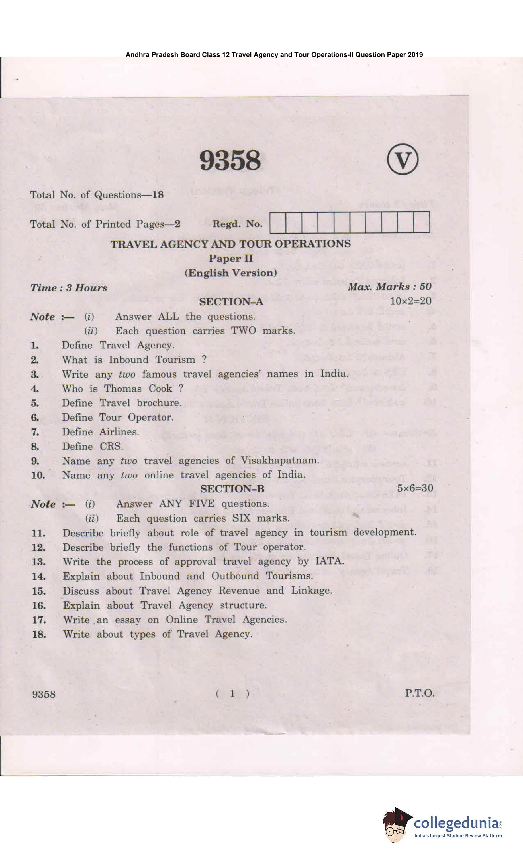 AP Intermediate 2nd year Travel Agency and Tour Operations Question Paper 2019 with Answer Key is available for download. The exam was conducted by the Andhra Pradesh Board of Intermediate Education (APBIE) . The medium of paper was English and Telugu.The question paper comprised a total of 18 questions divided among 2 sections.