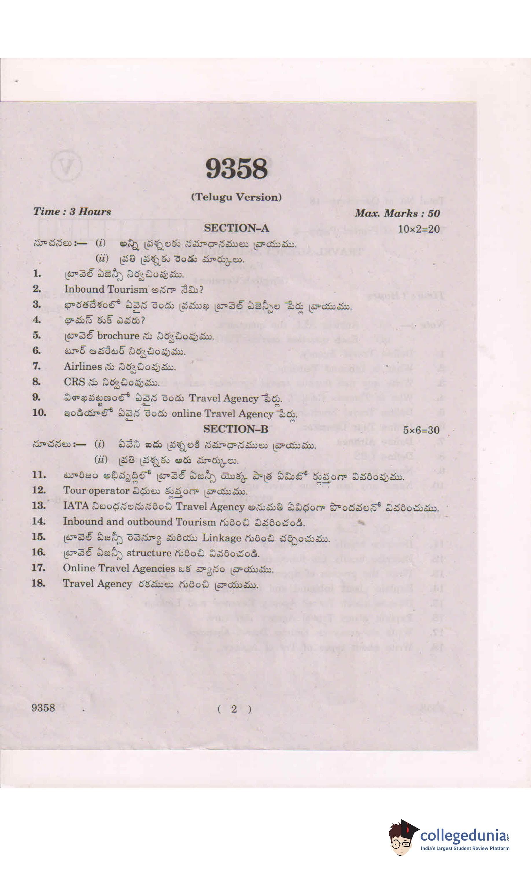 AP Intermediate 2nd year Travel Agency and Tour Operations Question Paper 2019 with Answer Key