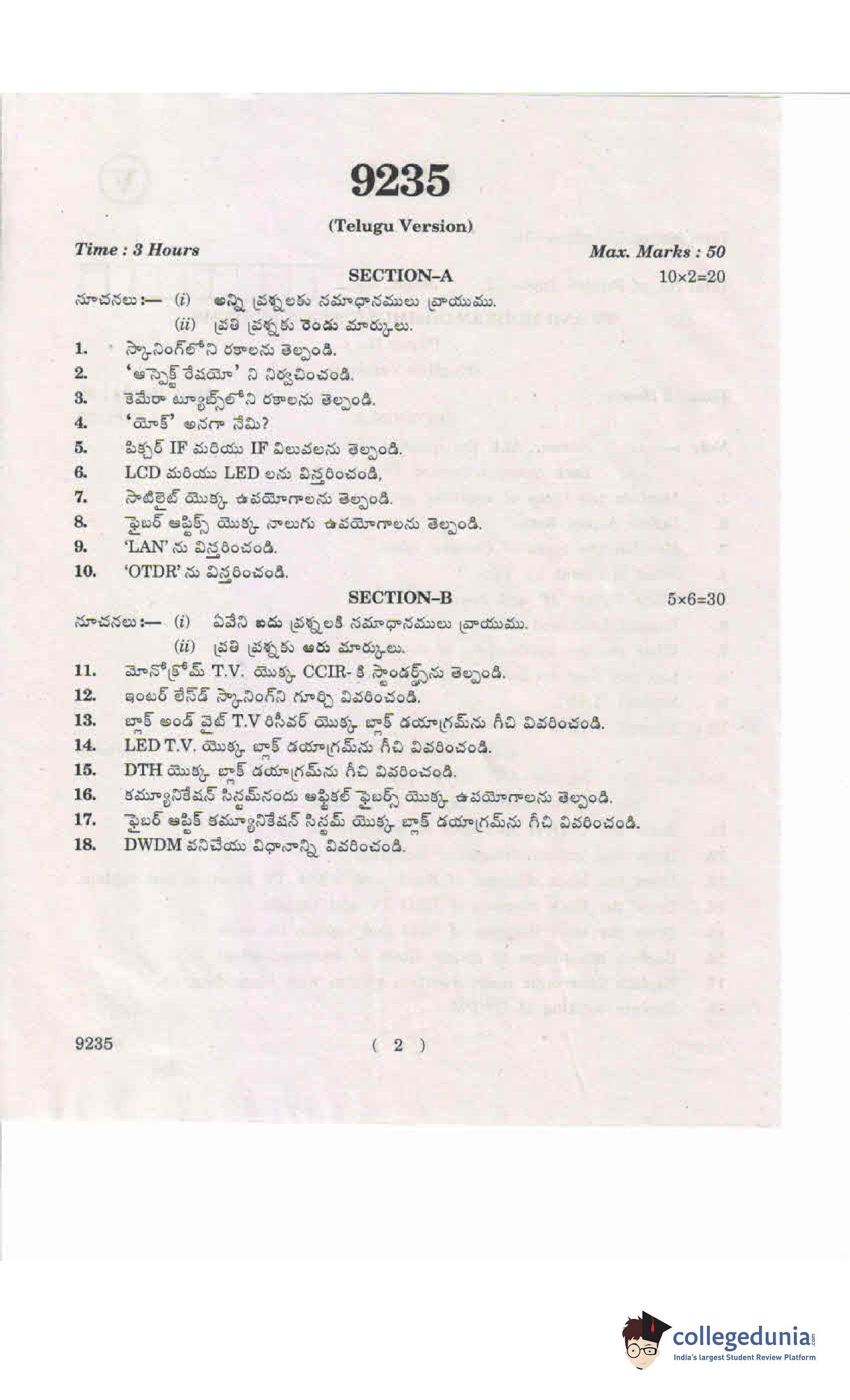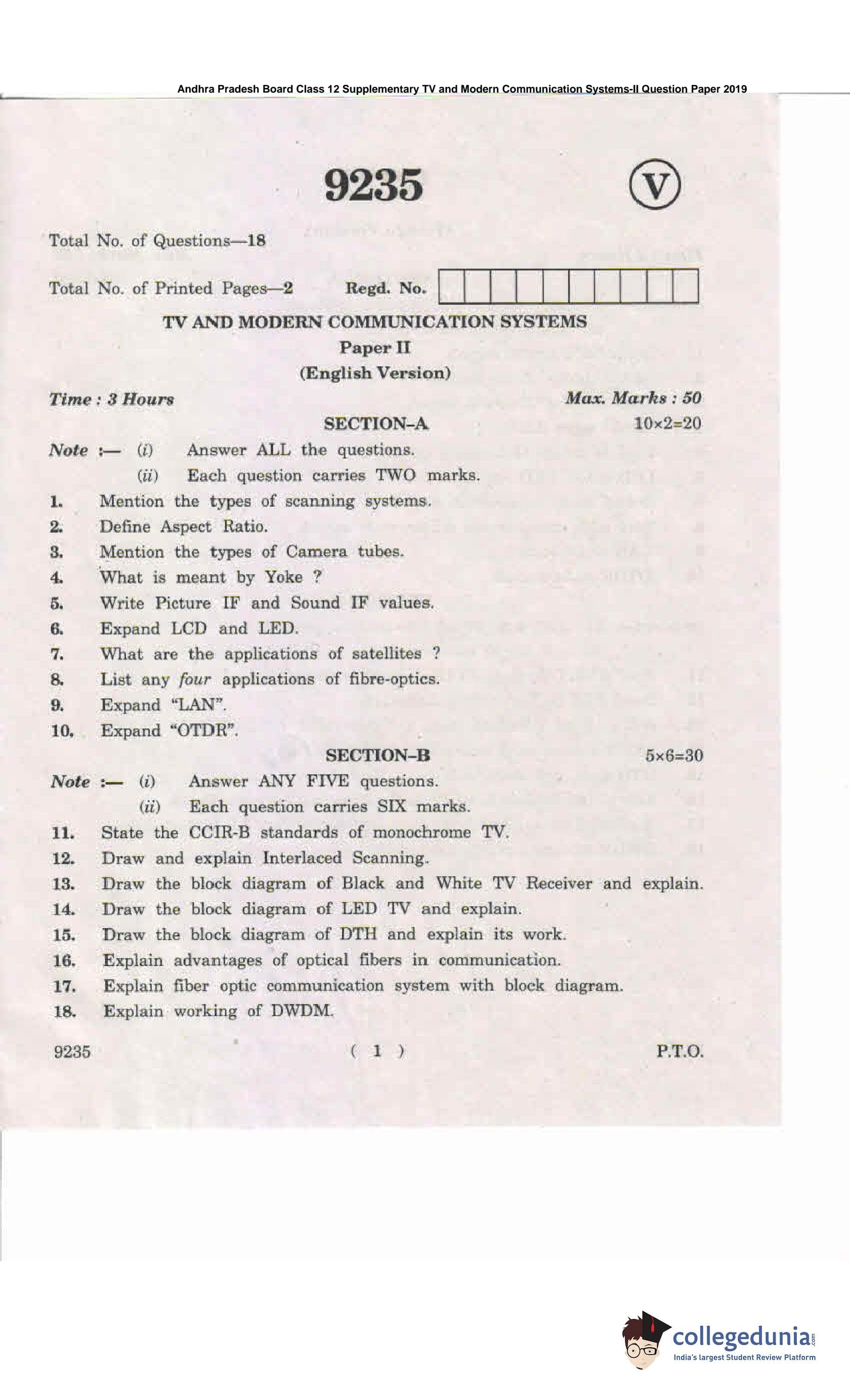 AP Intermediate 2nd year TV and Modern Communication Systems Supplementary Question Paper 2019 with Answer Key 9235 is available for download. The exam was conducted by the Andhra Pradesh Board of Intermediate Education (APBIE). The medium of paper was English and Telugu. The question paper comprised a total of 18 questions divided among 2 sections.