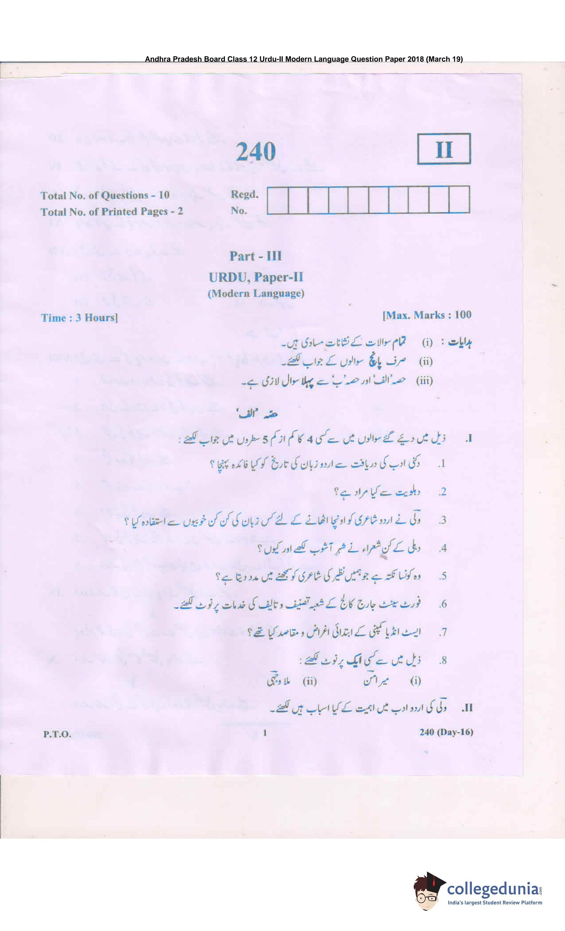 AP Intermediate 2nd year Urdu Modern Language Question Paper 2018 with Answer Key is available for download. The exam was conducted by the Andhra Pradesh Board of Intermediate Education (APBIE) on March 19, 2018 in the Morning Session 9 AM to 12 PM. The medium of paper was Urdu.The question paper comprised a total of 10 questions.