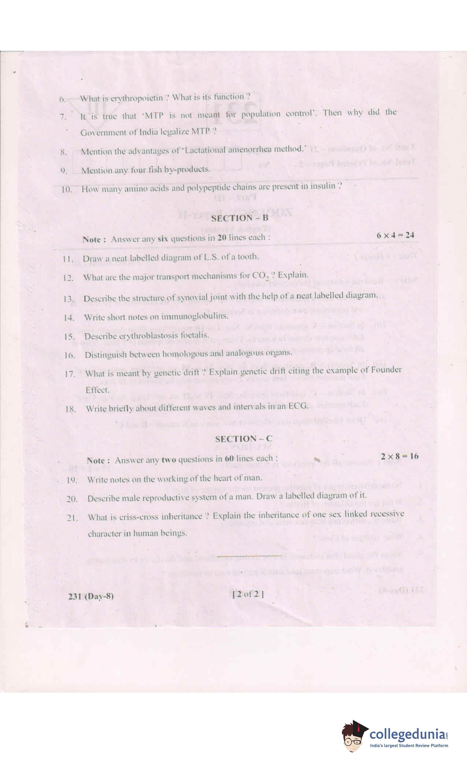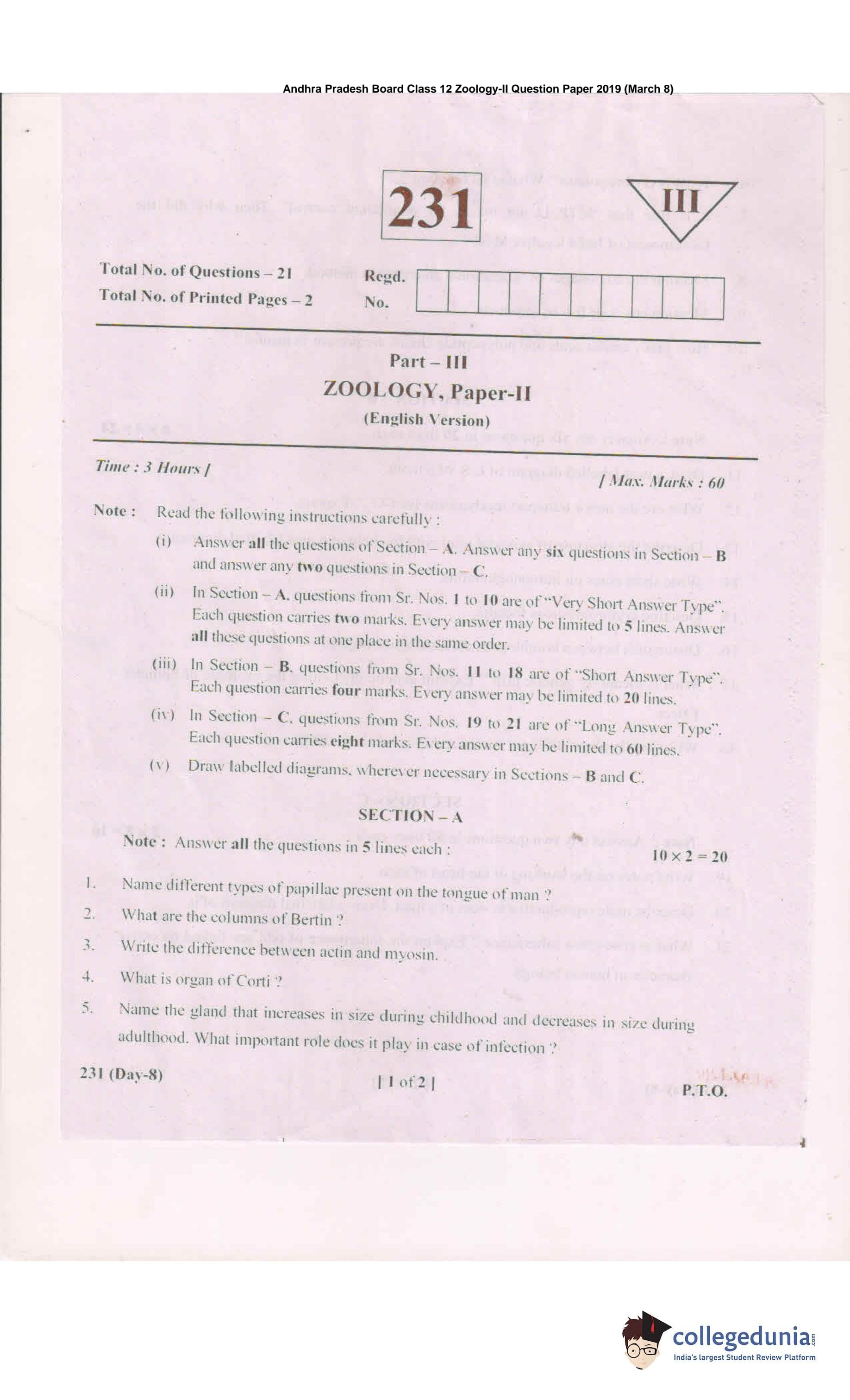 AP Intermediate 2nd year Zoology Question Paper 2019 with Answer Key 231 is available for download. The exam was conducted by the Andhra Pradesh Board of Intermediate Education (APBIE) on March 8, 2019 in the Morning Session 9 AM to 12 PM. The medium of paper was English.The question paper comprised a total of 21 questions divided among 3 sections.