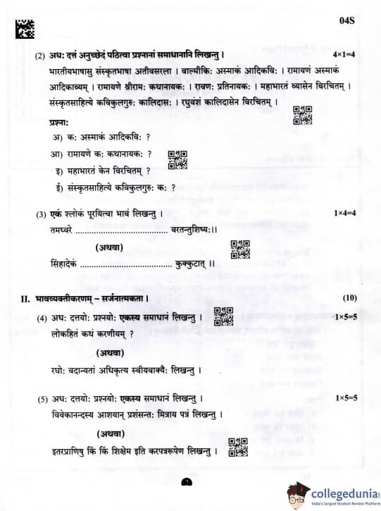 The question paper includes a mix of multiple-choice questions (1 mark each), short-answer questions (2 and 3 marks each), and long-answer questions (4 and 8 marks each), collectively evaluating students' understanding of Sanskrit literature, grammatical concepts, and written expression.