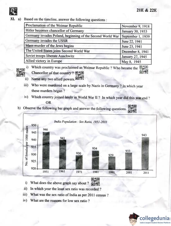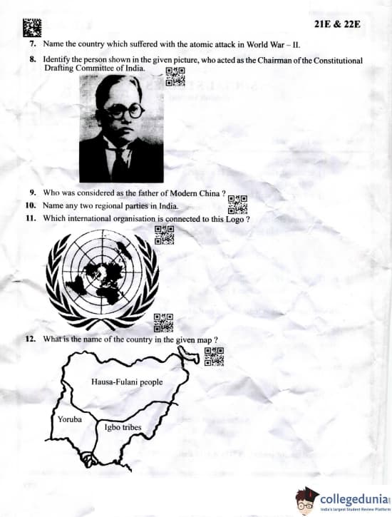 The question paper includes a mix of multiple-choice questions (1 mark each), short-answer questions (2 and 4 marks each), and long-answer questions (6 and 8 marks each), collectively evaluating students' knowledge, analytical thinking, and ability to interpret historical and contemporary issues.