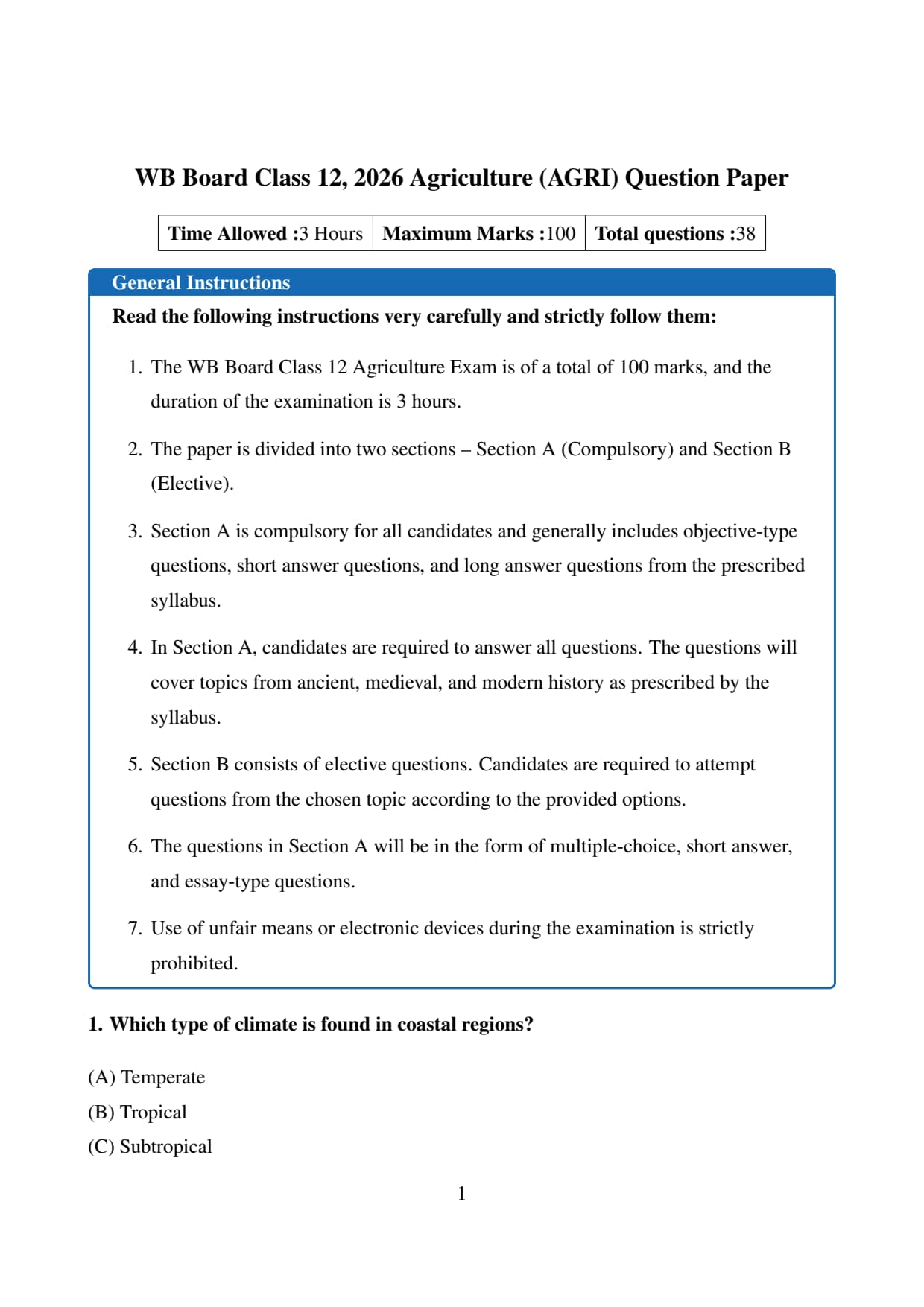 The official question paper of WB Board Class 12 Agriculture (AGRI) Board Exam 2026 is provided below. Students can download the official paper in PDF format for reference.