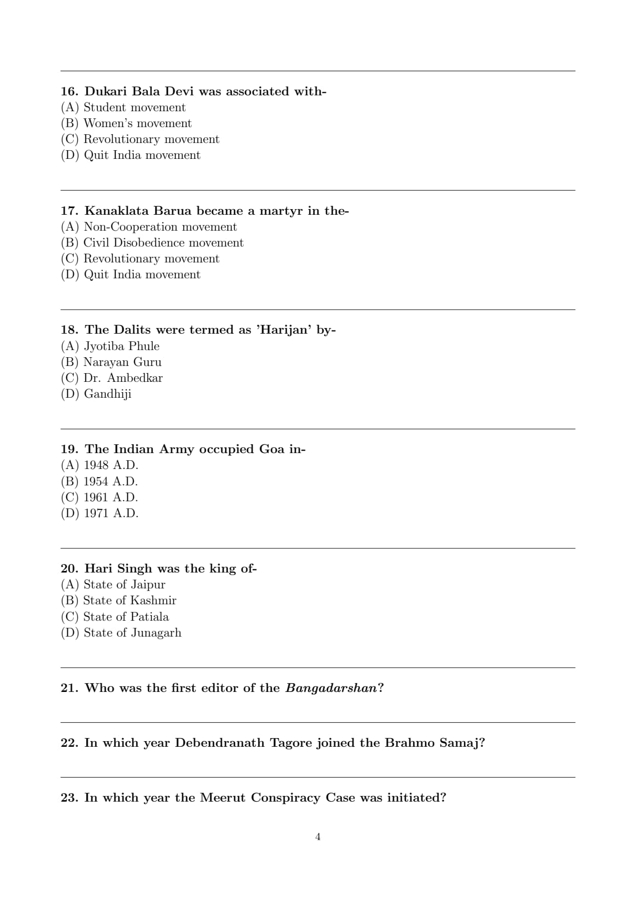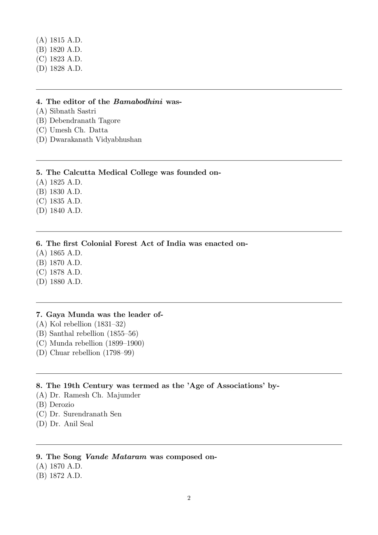 Option (D) corresponds to 1828 A.D. Quick Tip: The Brahmosabha founded by Raja Rammohan Roy in 1828 later developed into the Brahmo Samaj, a key movement in the Bengal Renaissance.