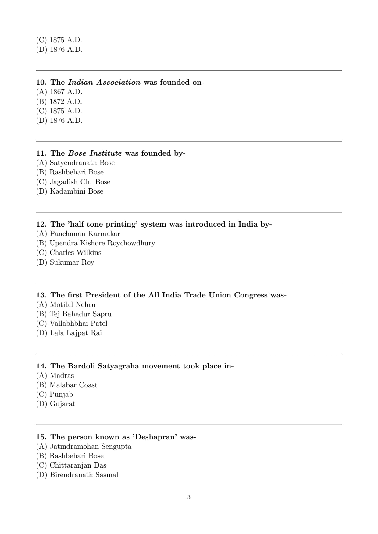 Option (D) corresponds to 1876 A.D. Quick Tip: The Indian Association (1876), founded by Surendranath Banerjee, was a precursor to the Indian National Congress.