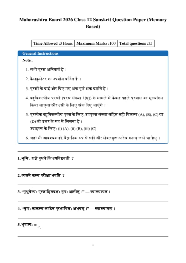 | Maharashtra Board 2026 Class 12 Sanskrit (33) Question Paper with Solution PDF | Download | Check Solutions |