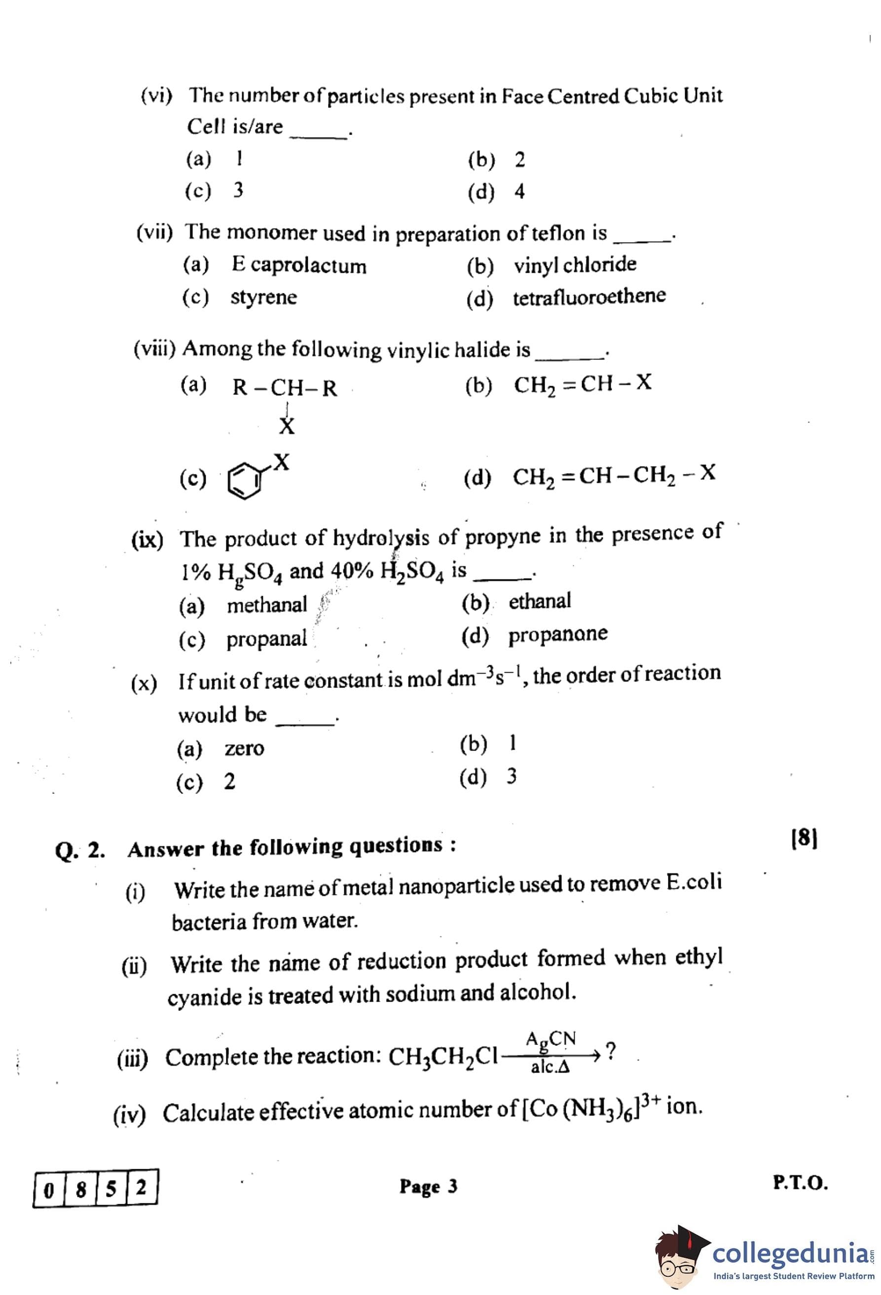 (x) If the unit of rate constant is mol \(dm^{-3}s^{-1}\), the order of the reaction would be \underline{\hspace{1cm.