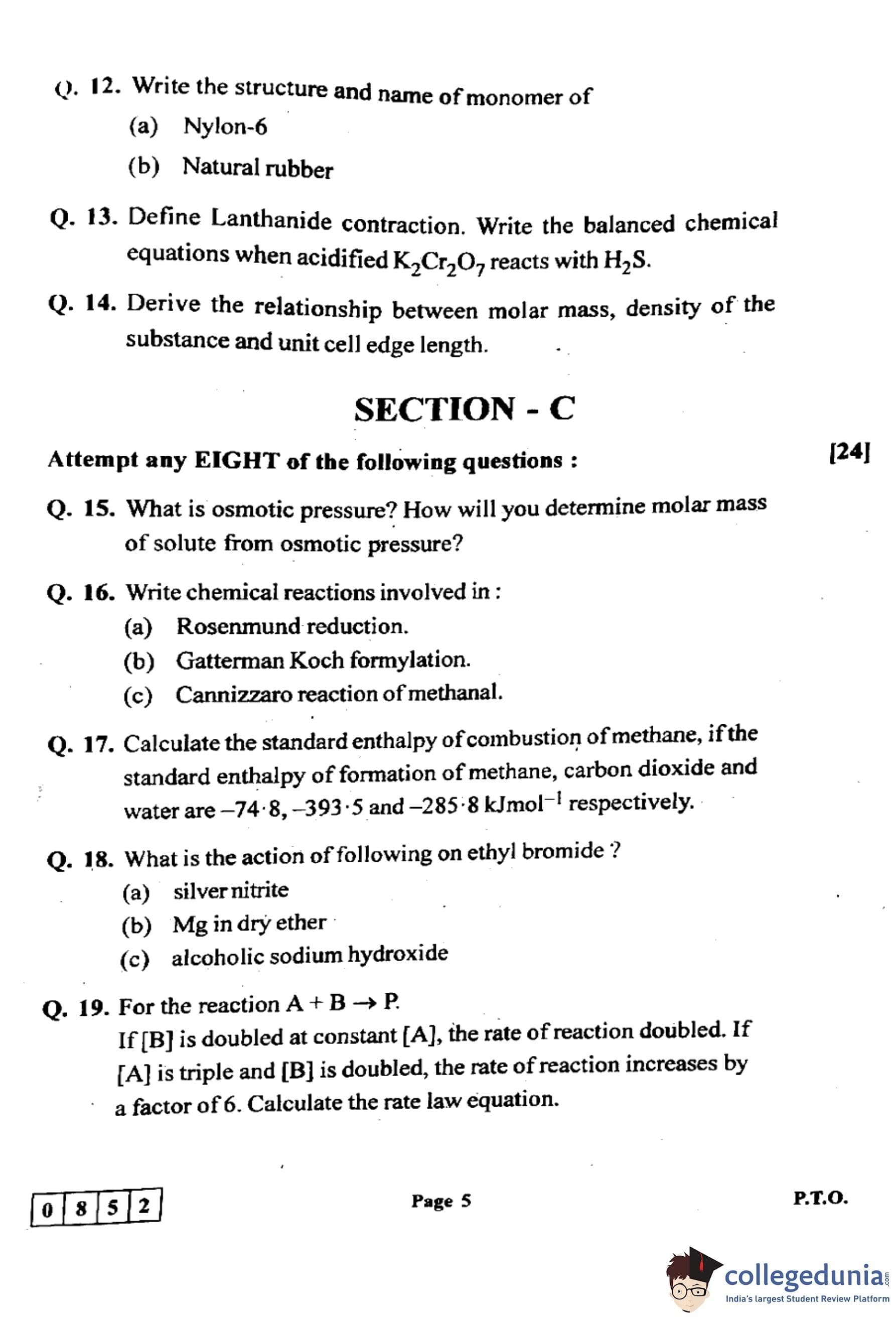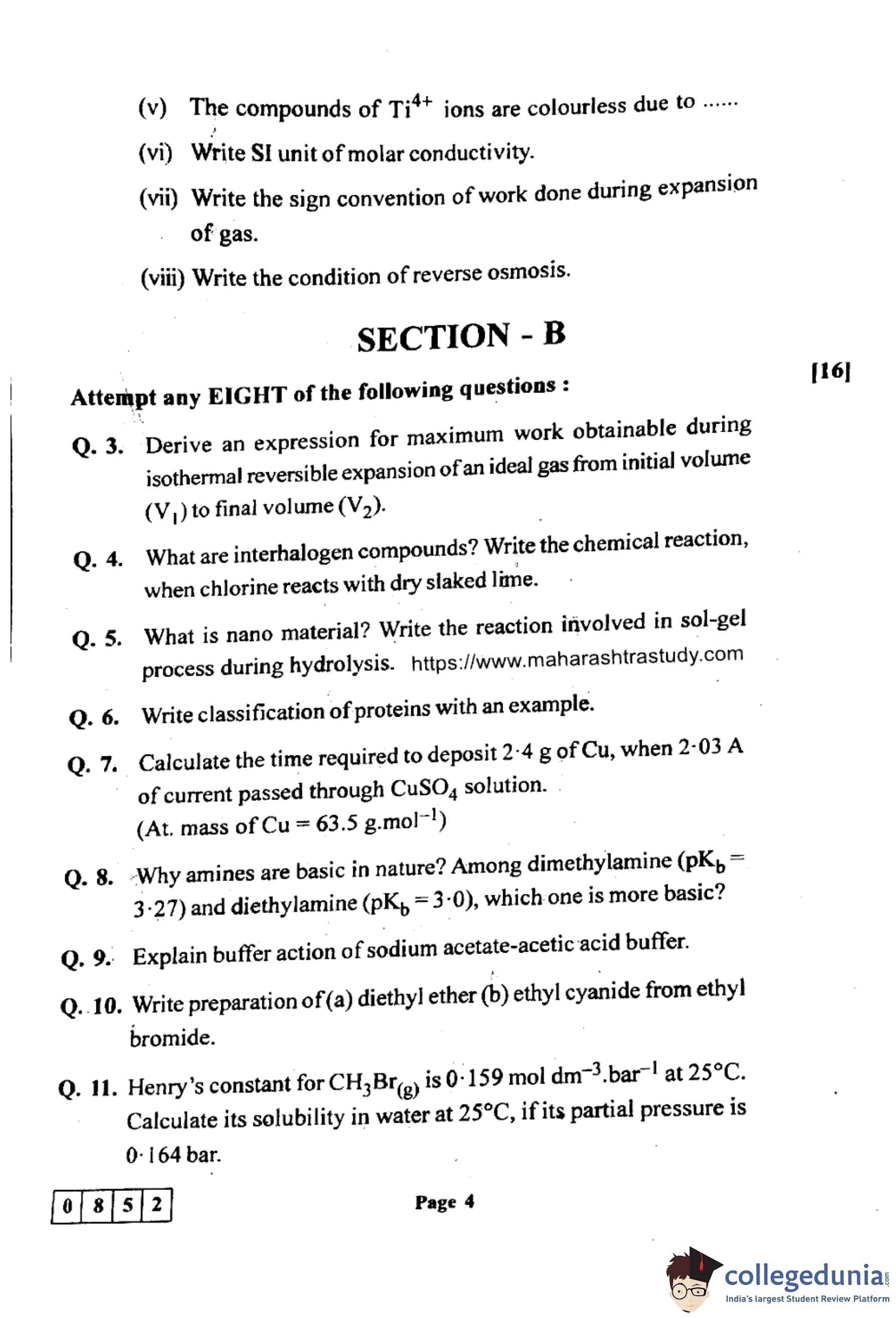 Maharashtra Board Class 12 Chemistry (55-J-852) Question Paper 2024 with Answer Key