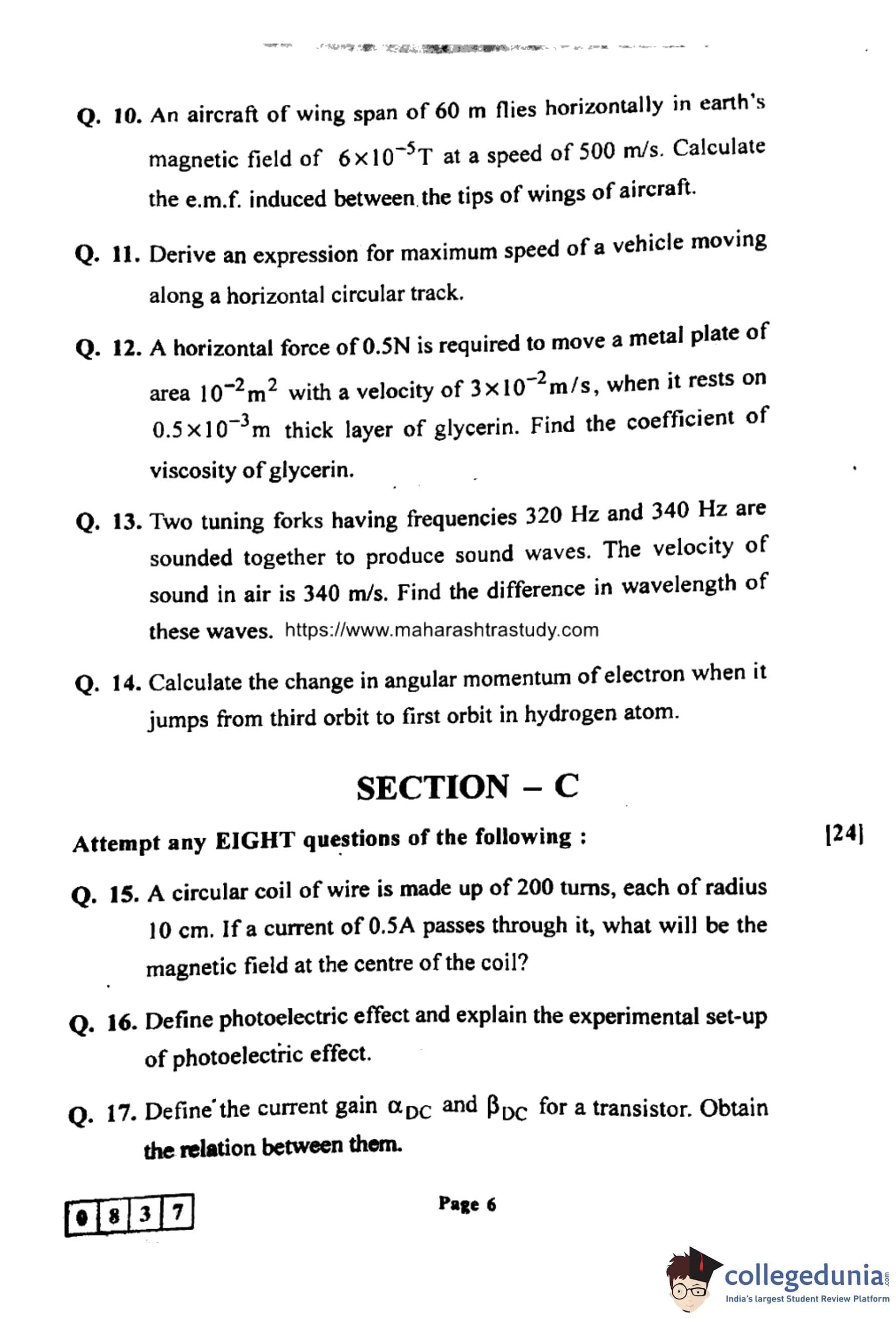 Maharashtra Board Class 12 Physics (54-J-837) Question Paper 2024 with Answer Key
