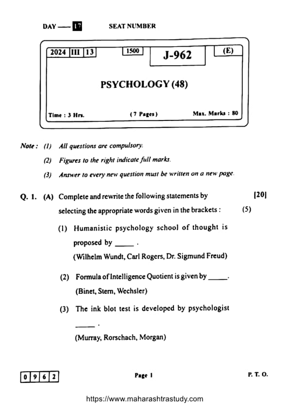 The Maharashtra Board 2024 Class 12th Psychology (48-J-962) Question Paper PDF is now available for download. The Maharashtra State Board of Secondary and Higher Secondary Education (MSBSHSE) conducted the Class 12 Psychology for 3 hours, and the question paper carries a total of 80 marks.