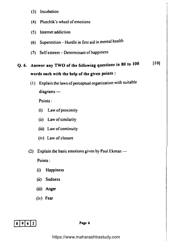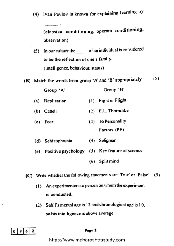 Maharashtra Board Class 12 Psychology (48-J-962) Question Paper 2024 with Answer Key