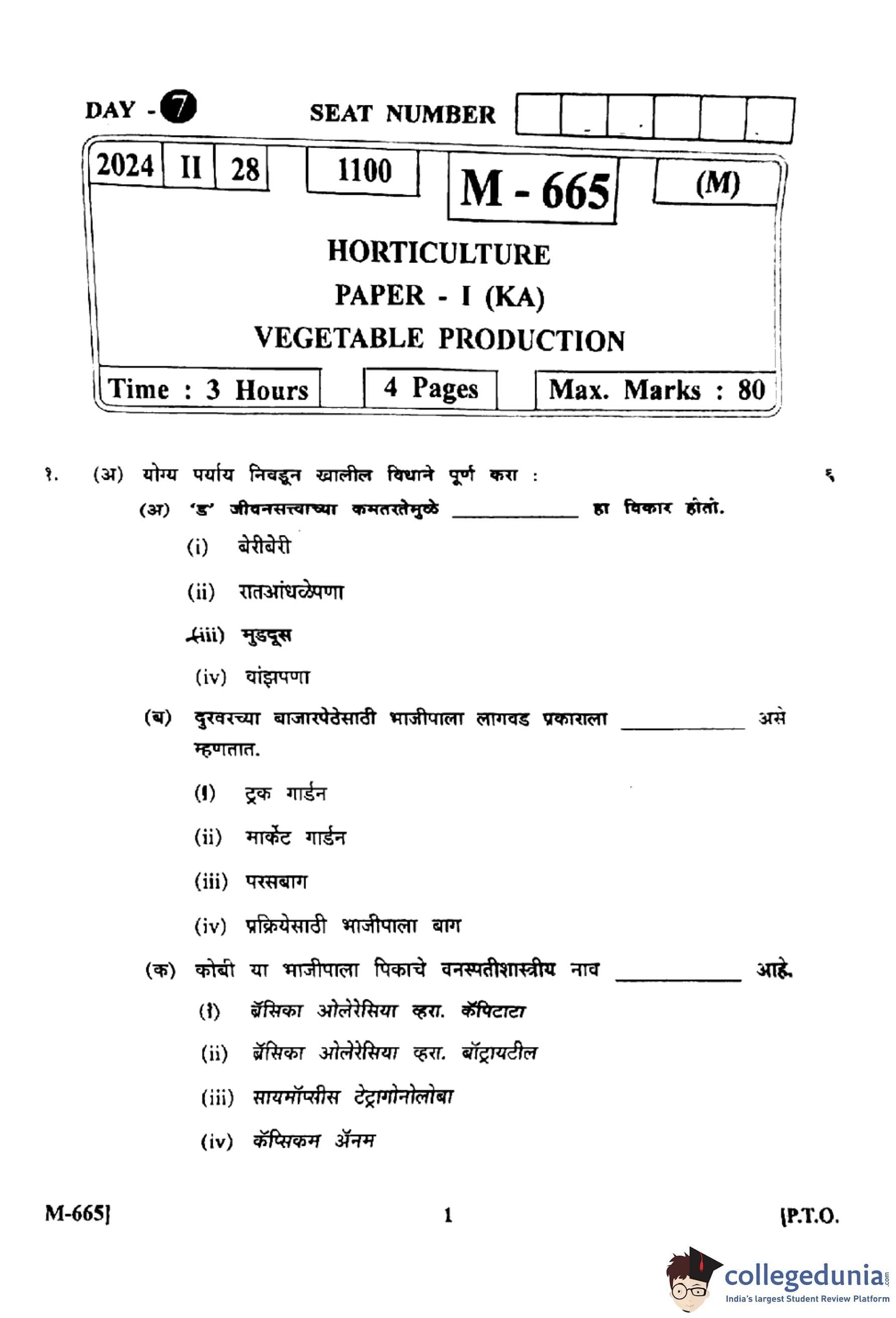 | Maharashtra Class 12 2024 Horticulture Vegetable Production Question Paper With Answer Key | Check Solution |