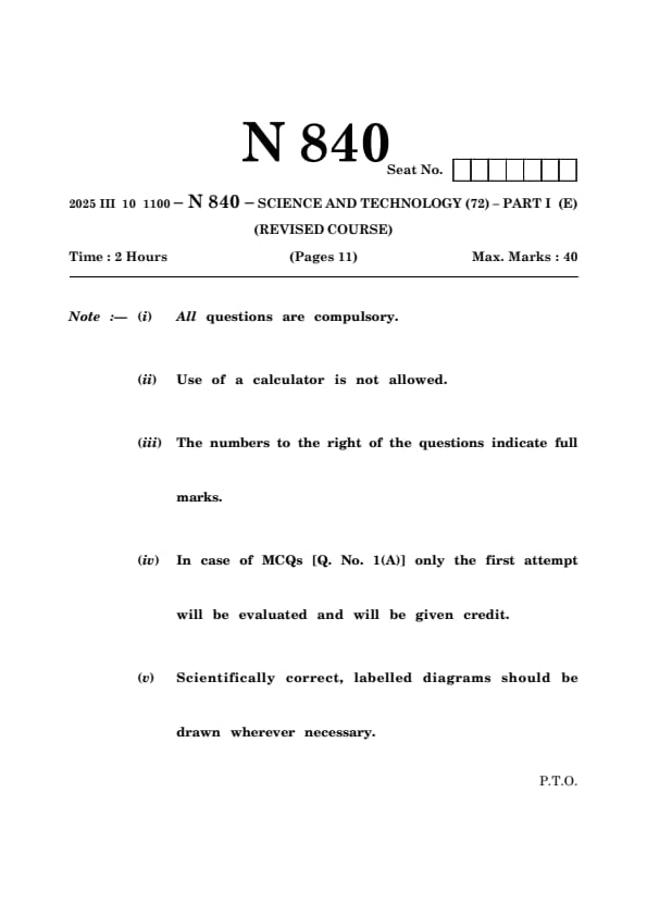 Maharashtra Board Class 10 Science and Technology Part-1 Question Paper 2025 PDF (Code N 840) is available for download here. The Science and Technology exam was conducted on March 11, 2025 from 11:00 AM to 2:00 PM. The Maharashtra State Board of Secondary and Higher Secondary Education (MSBSHSE) conducted the Class 10 examination for a total duration of 3 hours, and the question paper had a total of 80 marks.