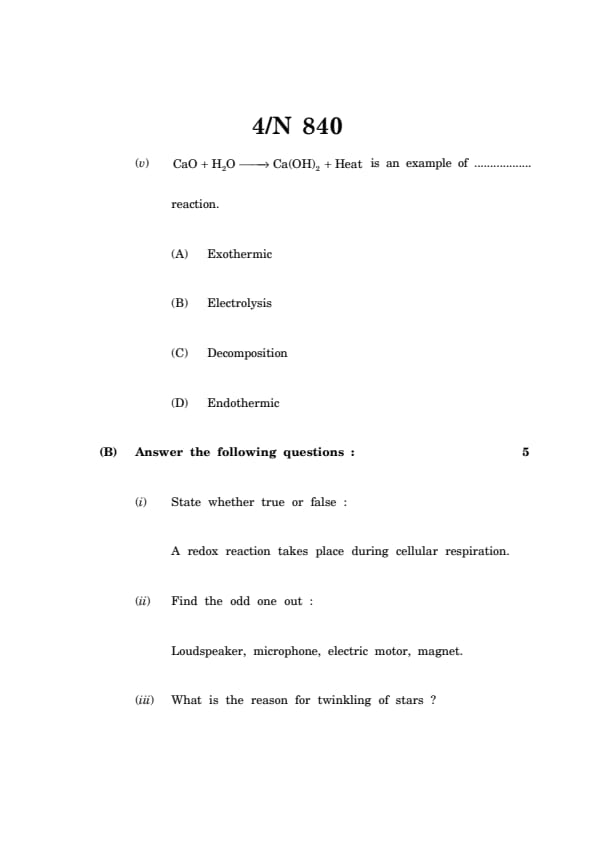 (v) CaO + H\(_2\)O \(\rightarrow\) Ca(OH)\(_2\) + Heat is an example of ................. reaction.