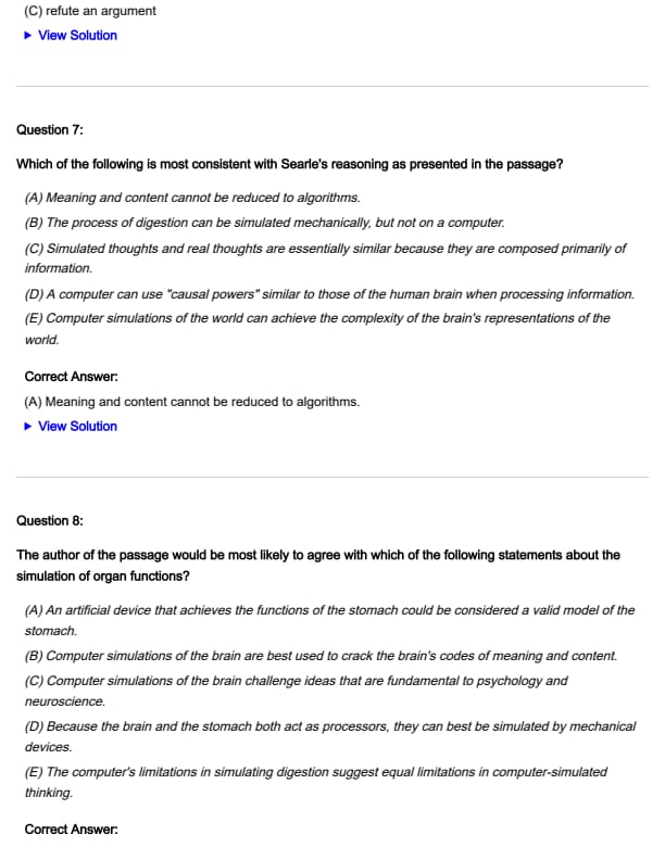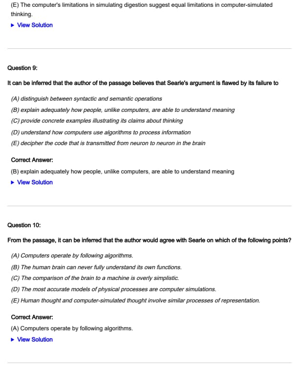 - (E) The computer's limitations in simulating digestion suggest equal limitations in computer-simulated thinking.