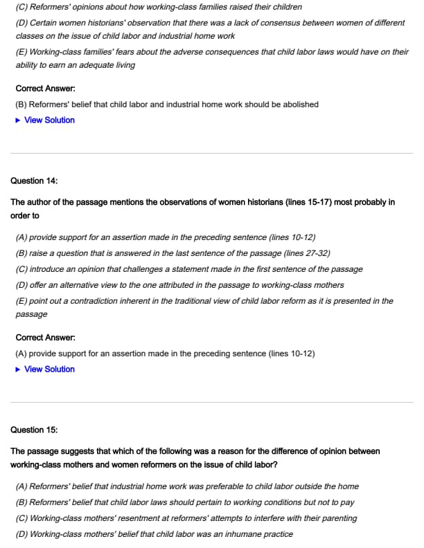 - (D) Certain women historians' observation that there was a lack of consensus between women of different classes on the issue of child labor and industrial home work