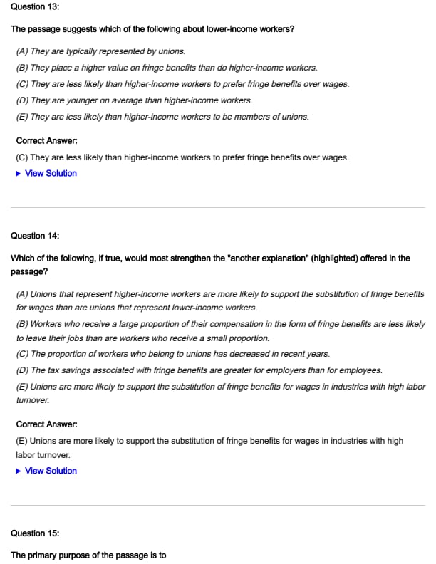 - (A) Unions that represent higher-income workers are more likely to support the substitution of fringe benefits for wages than are unions that represent lower-income workers.