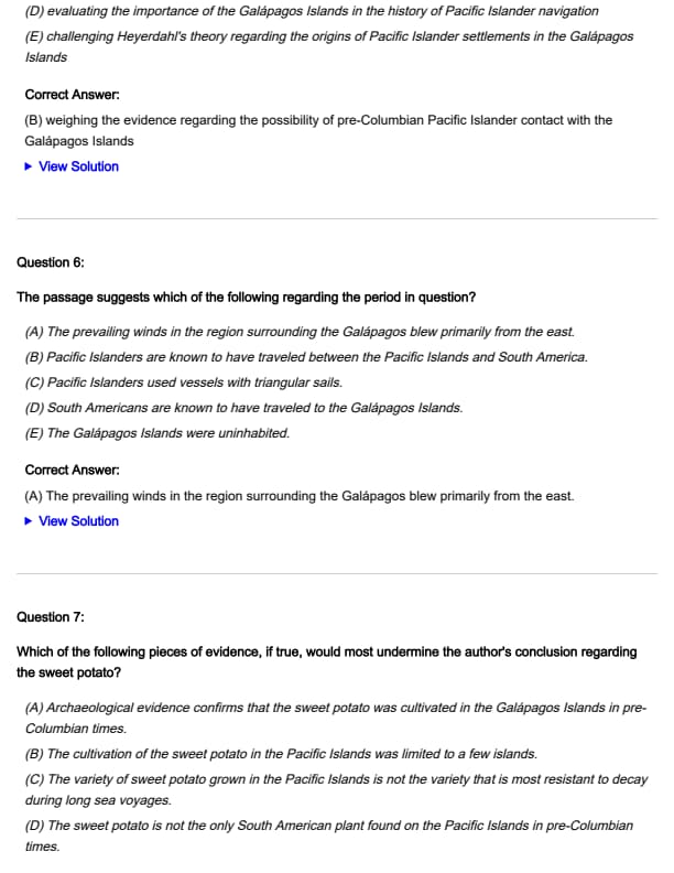 - (A) Archaeological evidence confirms that the sweet potato was cultivated in the Galápagos Islands in pre-Columbian times.