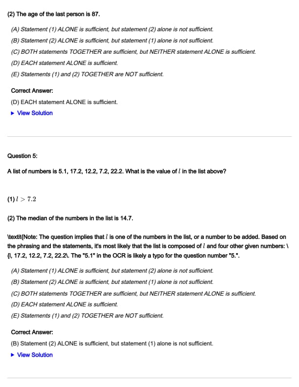 \textit{Note: The question implies that \(l\) is one of the numbers in the list, or a number to be added. Based on the phrasing and the statements, it's most likely that the list is composed of \(l\) and four other given numbers: \{l, 17.2, 12.2, 7.2, 22.2\. The "5.1" in the OCR is likely a typo for the question number "5.".