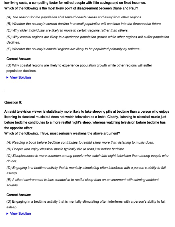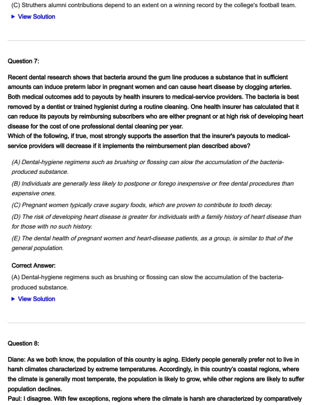 Diane: As we both know, the population of this country is aging. Elderly people generally prefer not to live in harsh climates characterized by extreme temperatures. Accordingly, in this country’s coastal regions, where the climate is generally most temperate, the population is likely to grow, while other regions are likely to suffer population declines.