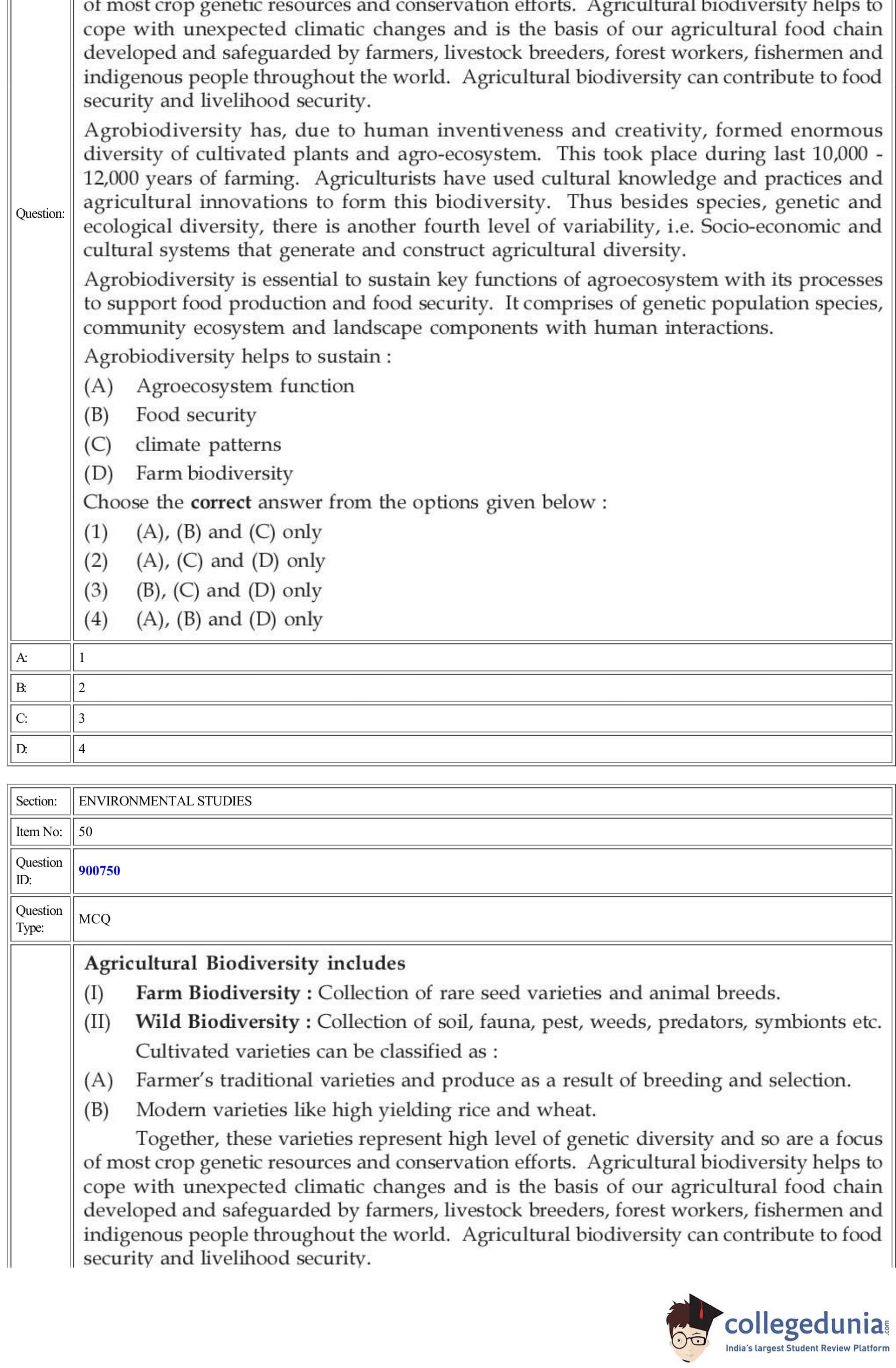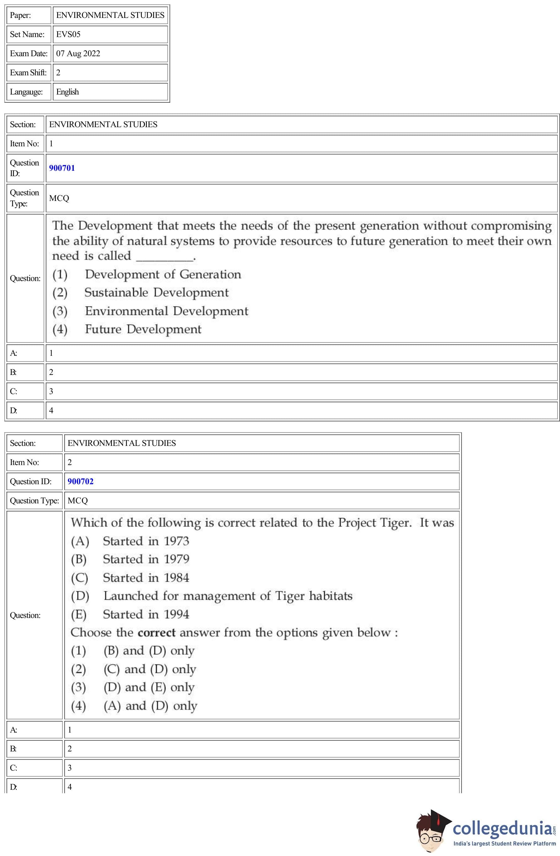 CUET Environmental Studies Question Paper 2022 is available for download. CUET 2022 Environmental Studies paper was conducted by National Testing Agency (NTA) on August 7, 2022 in Shift 1. The question paper comprised a total of 50 questions.