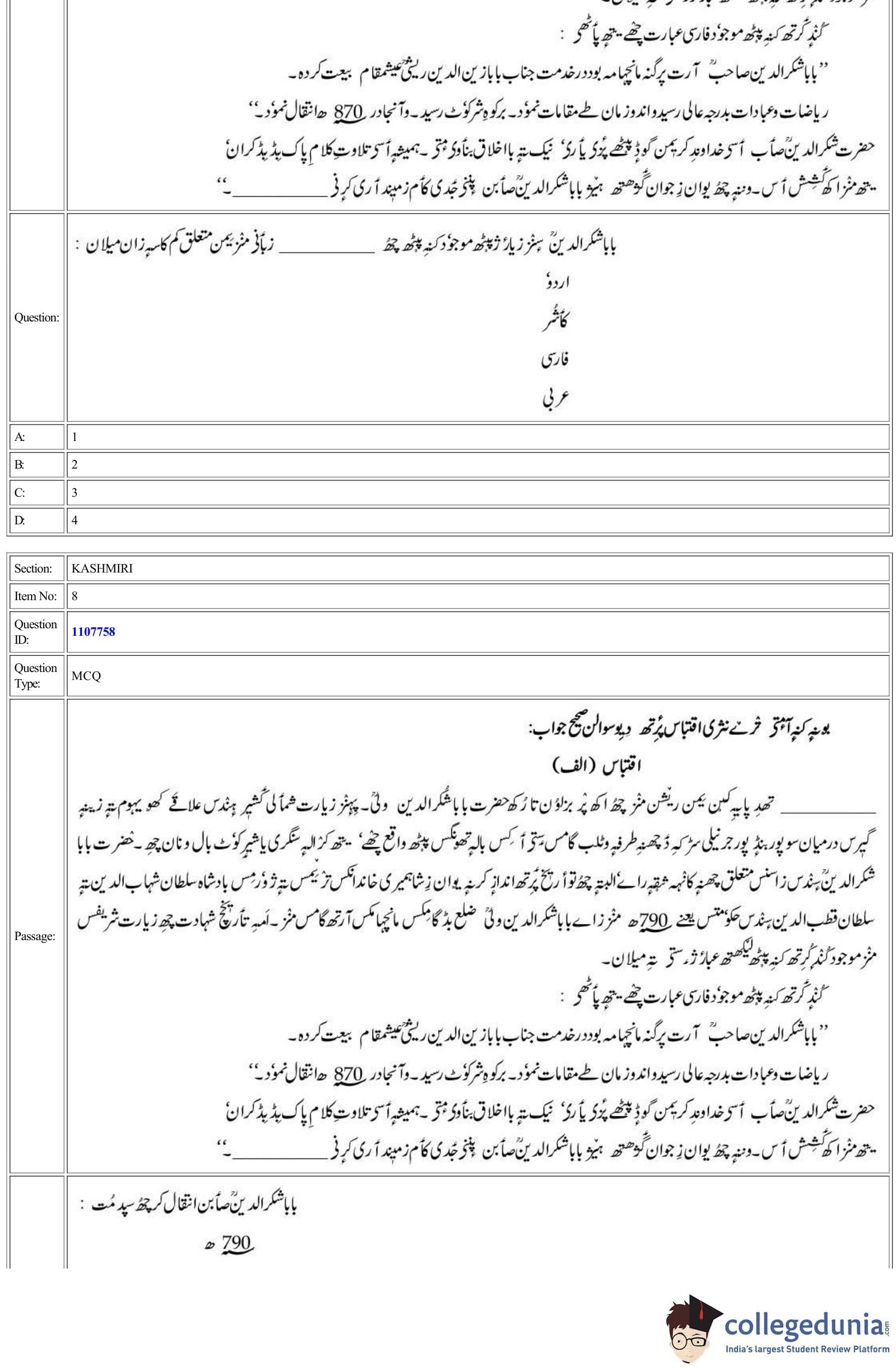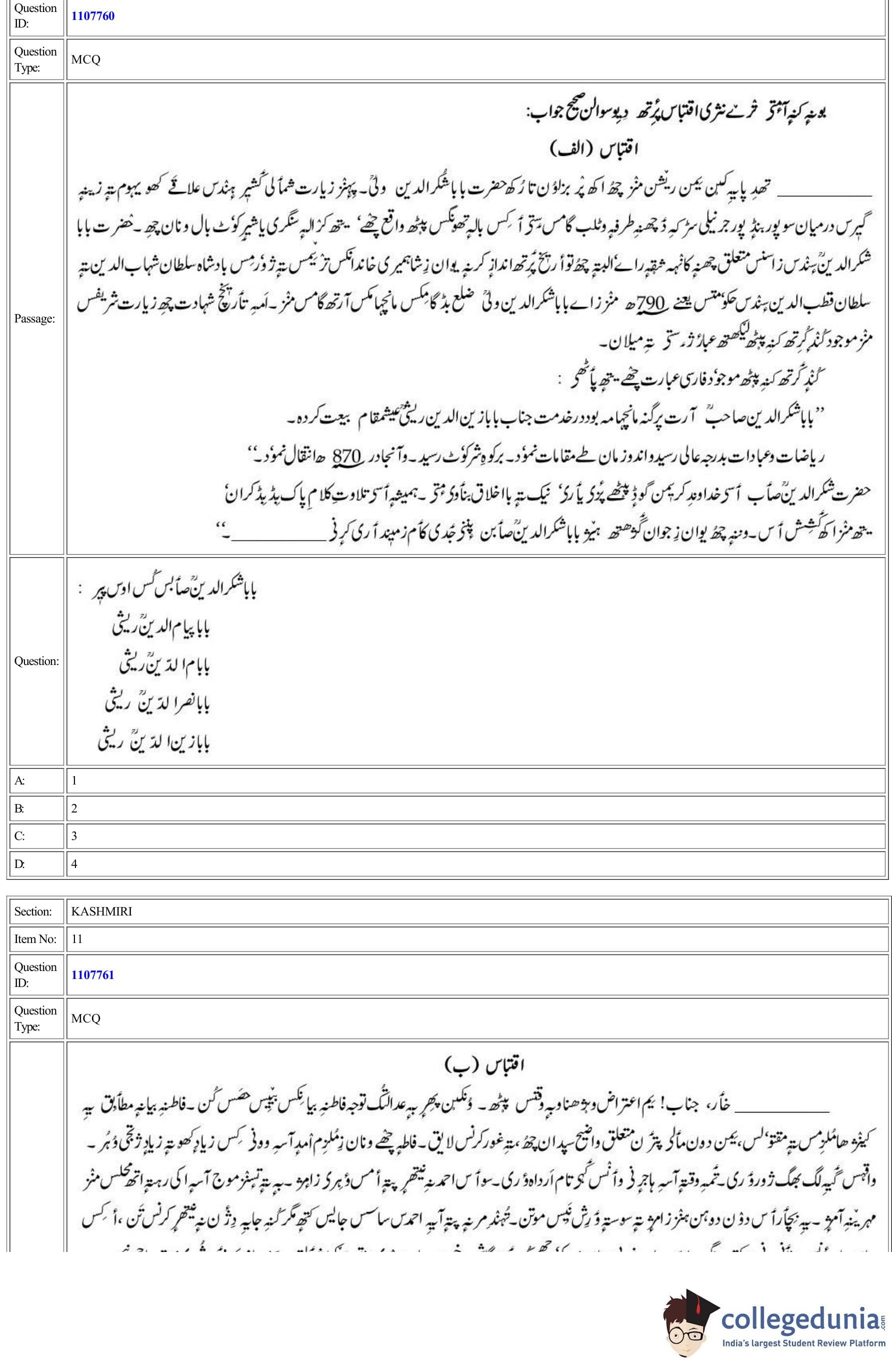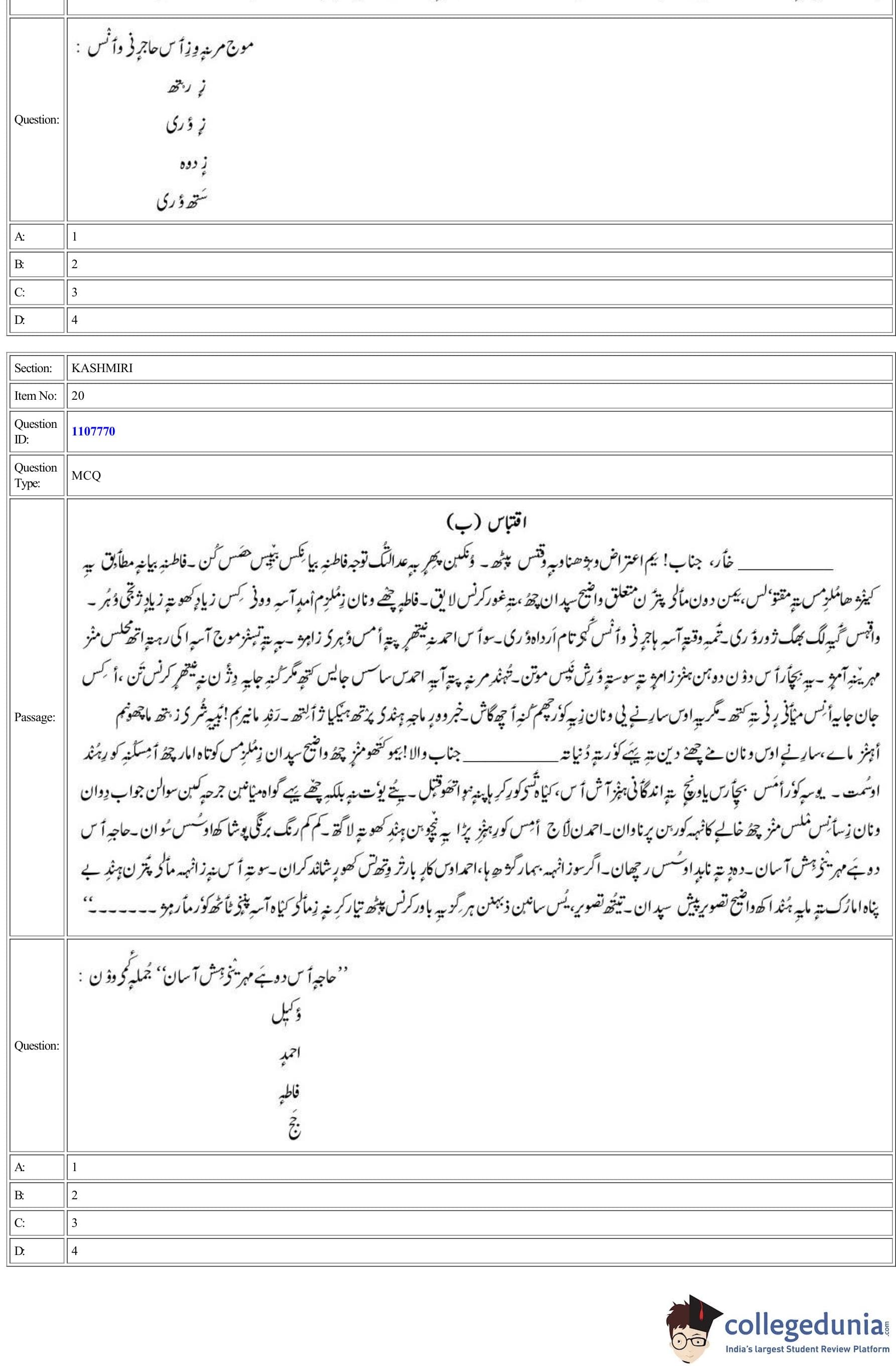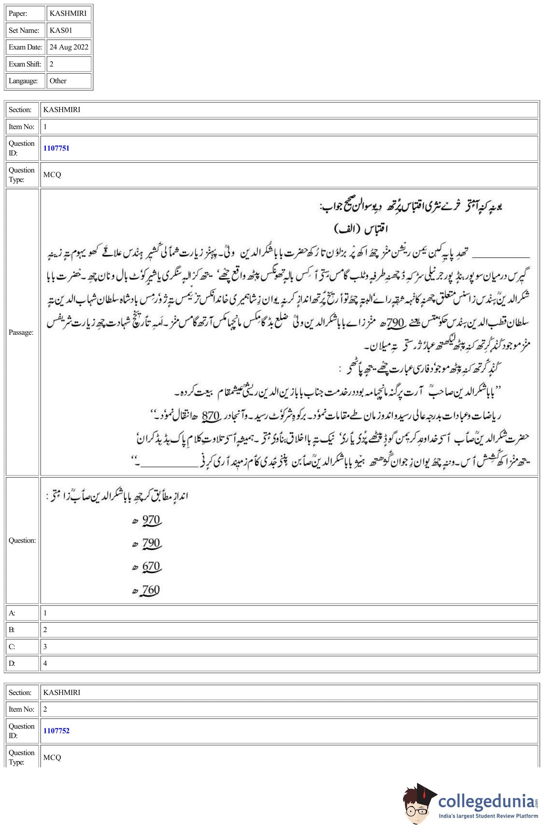 CUET 2022 Kashmiri Question Paper with Answer Key PDF