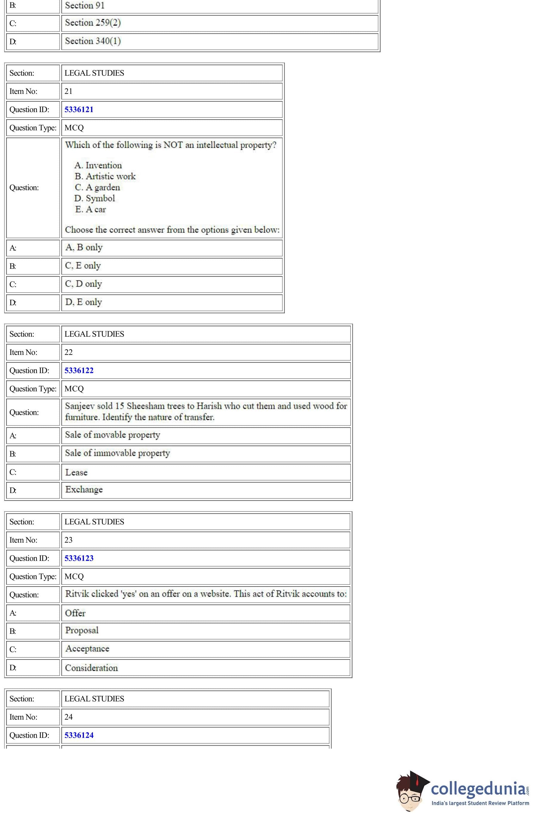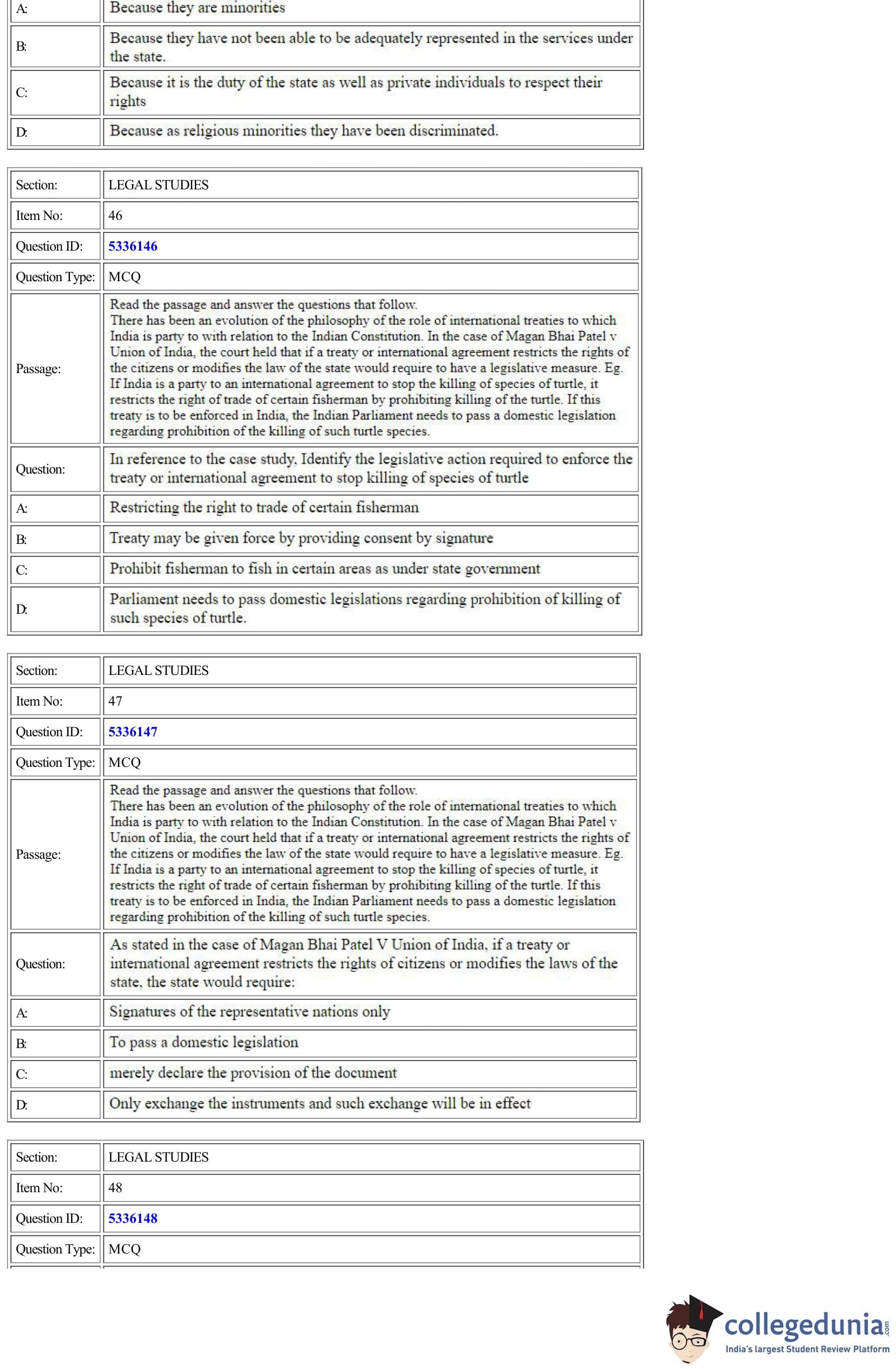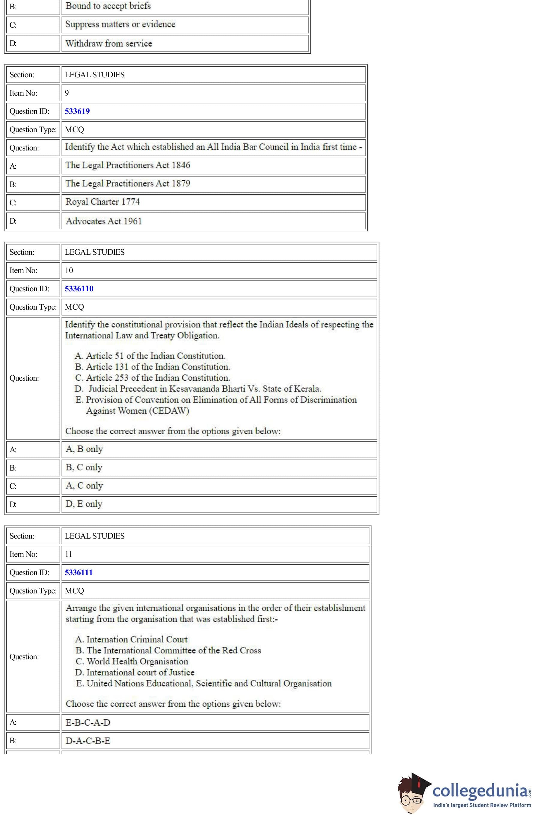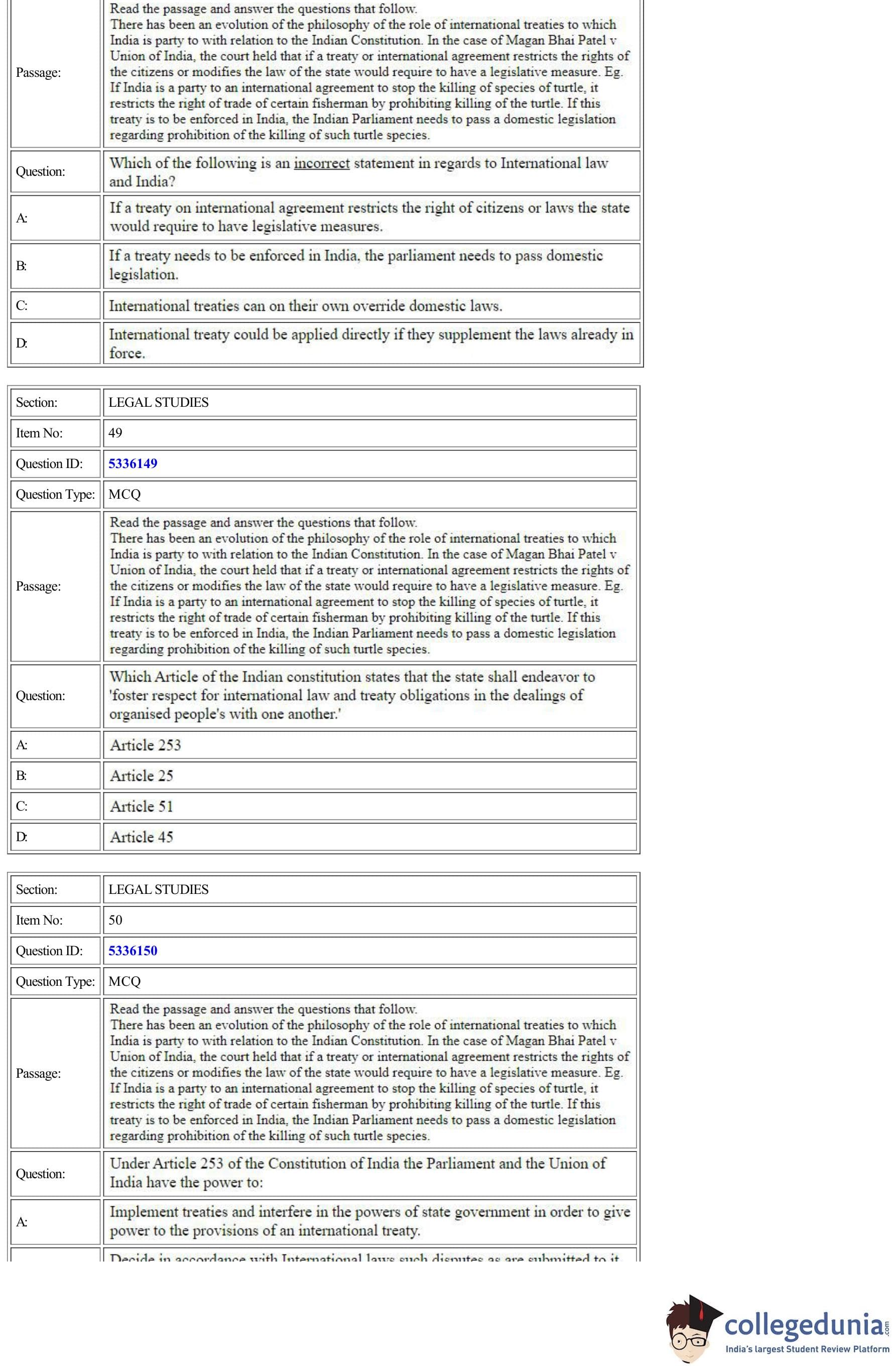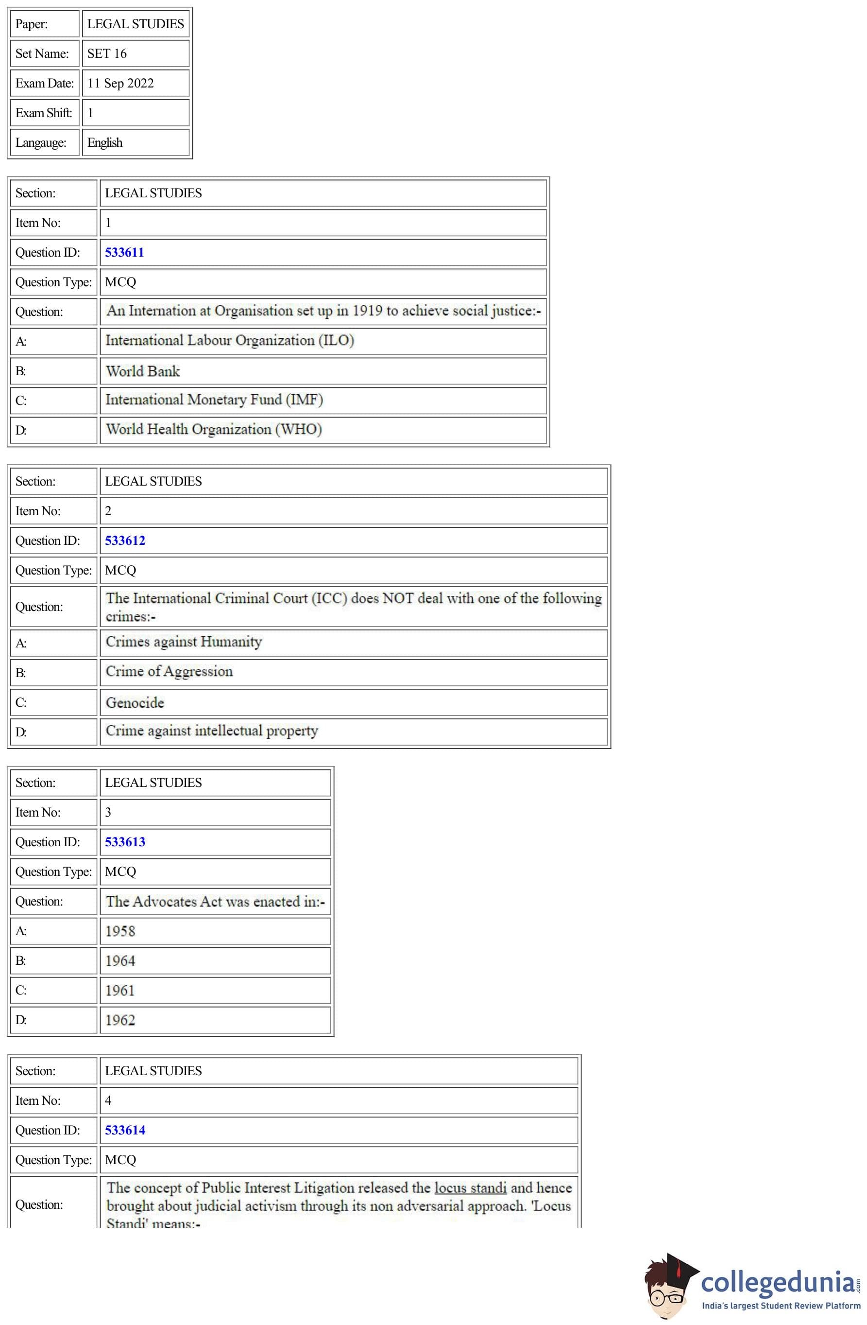 CUET Legal Studies Question Paper 2022 is available for download. CUET 2022 Legal Studies paper was conducted by National Testing Agency (NTA) on September 11, 2022 in Shift 1. The question paper comprised a total of 50 questions.