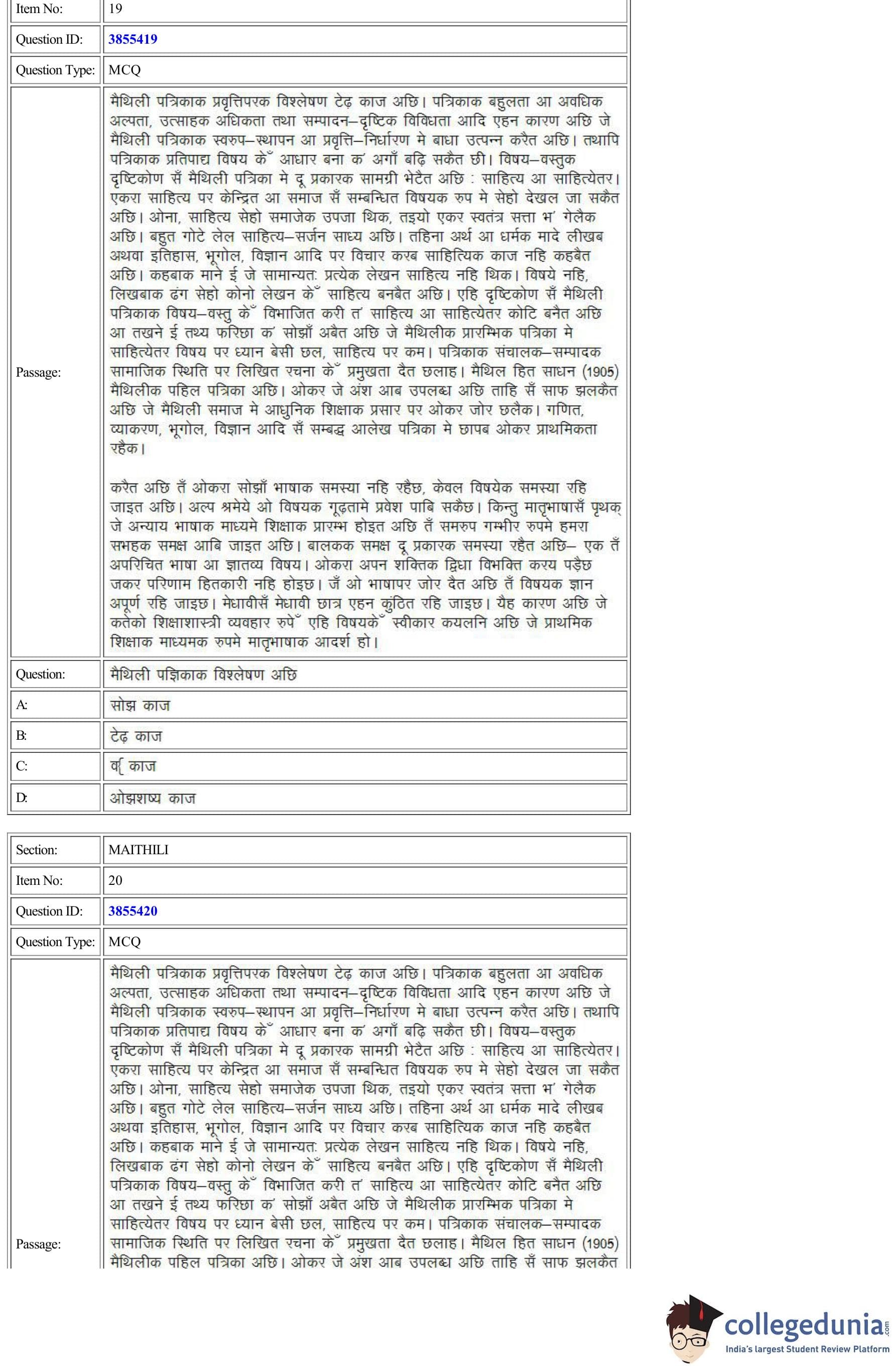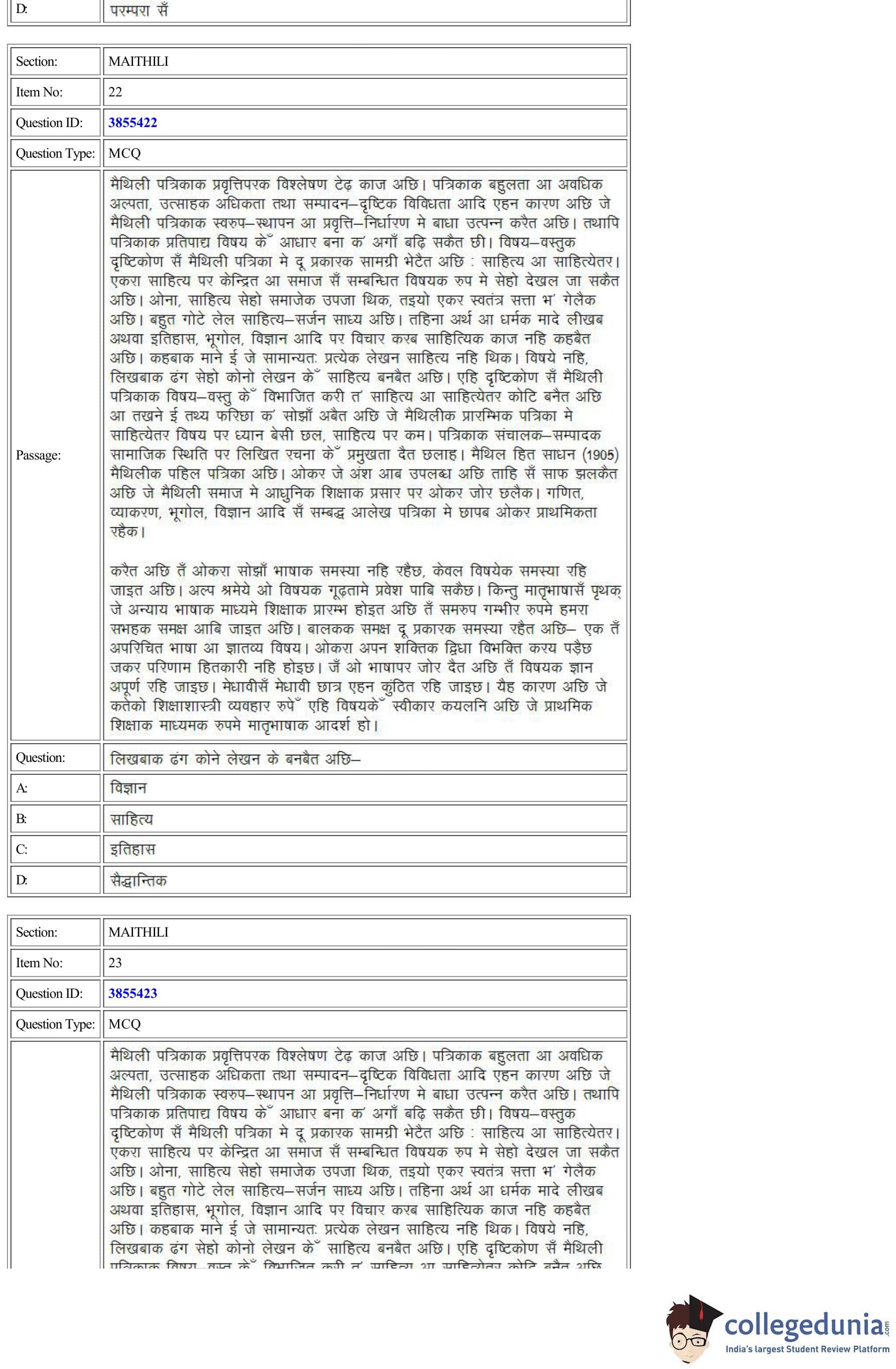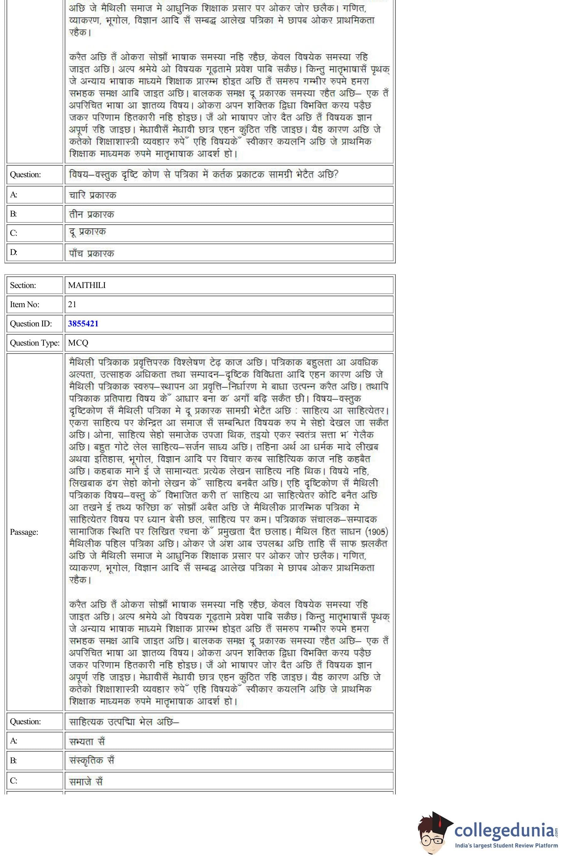 CUET Maithili Question Paper 2022 is available for download. CUET 2022 Maithili paper was conducted by National Testing Agency (NTA) on August 30, 2022 in Shift 2. The question paper comprised a total of 50 questions.