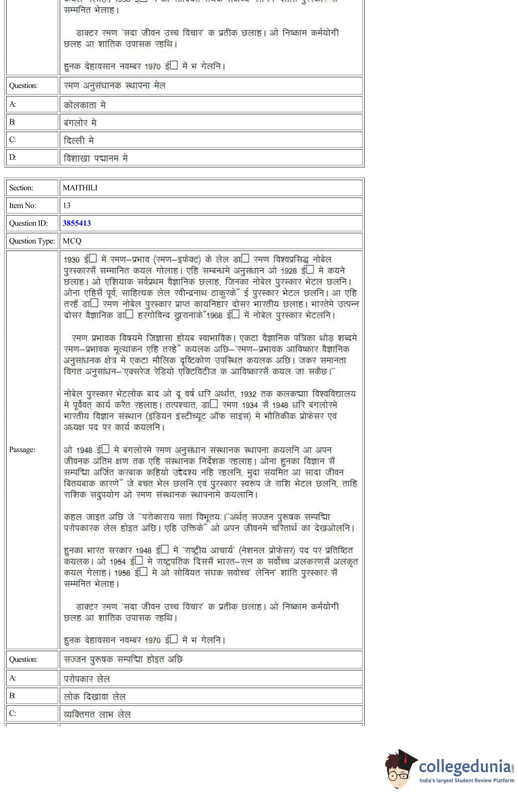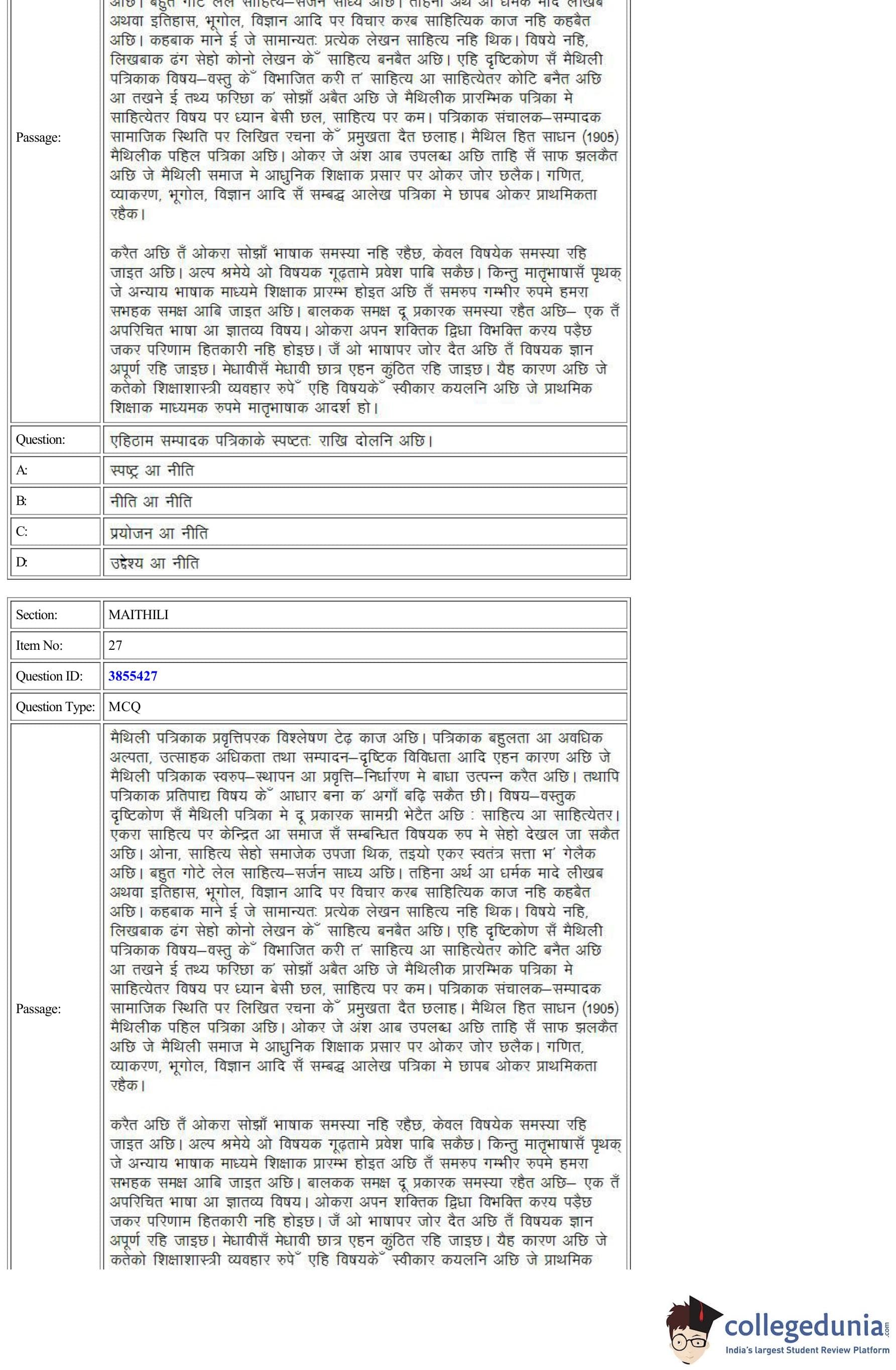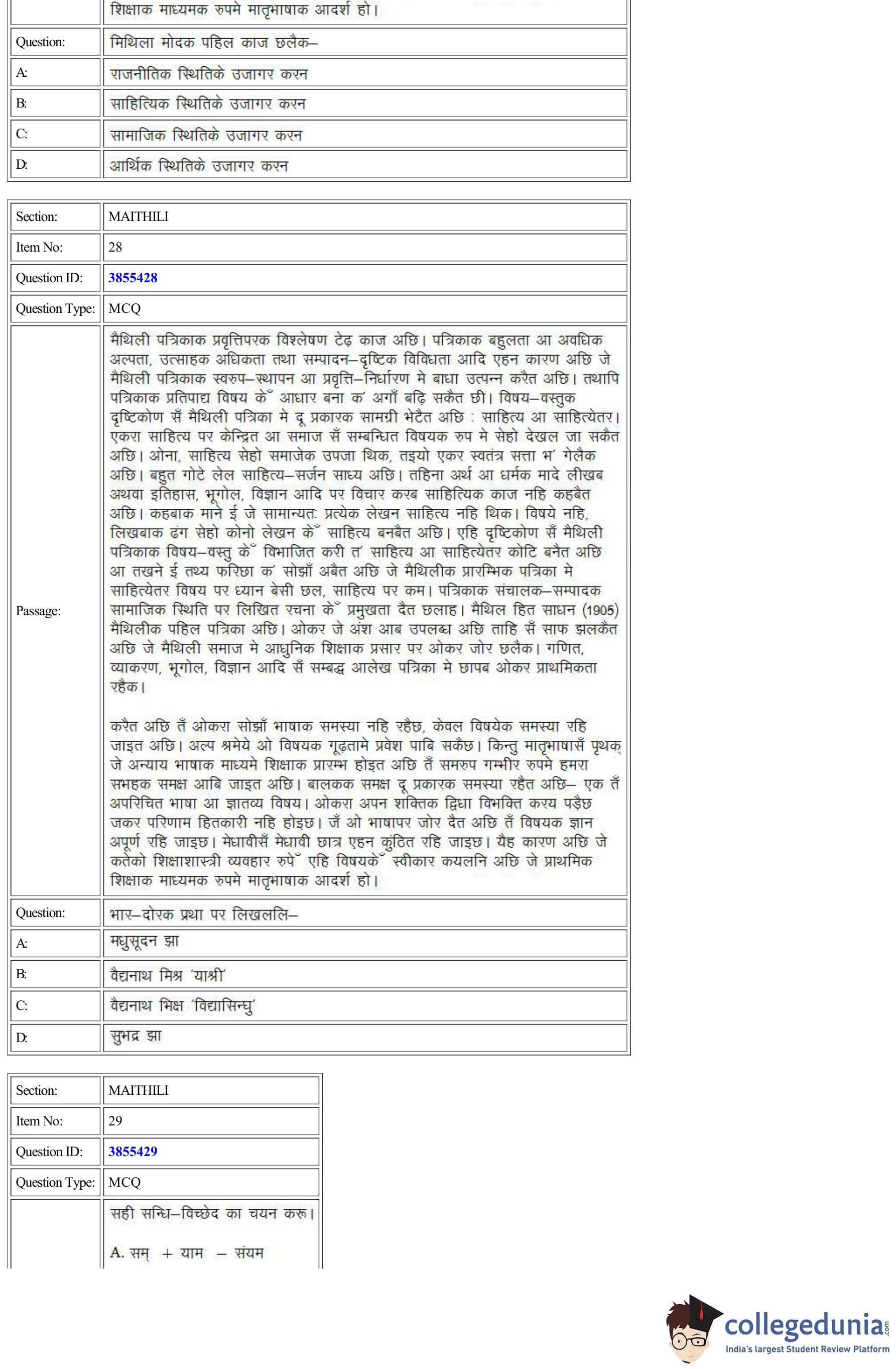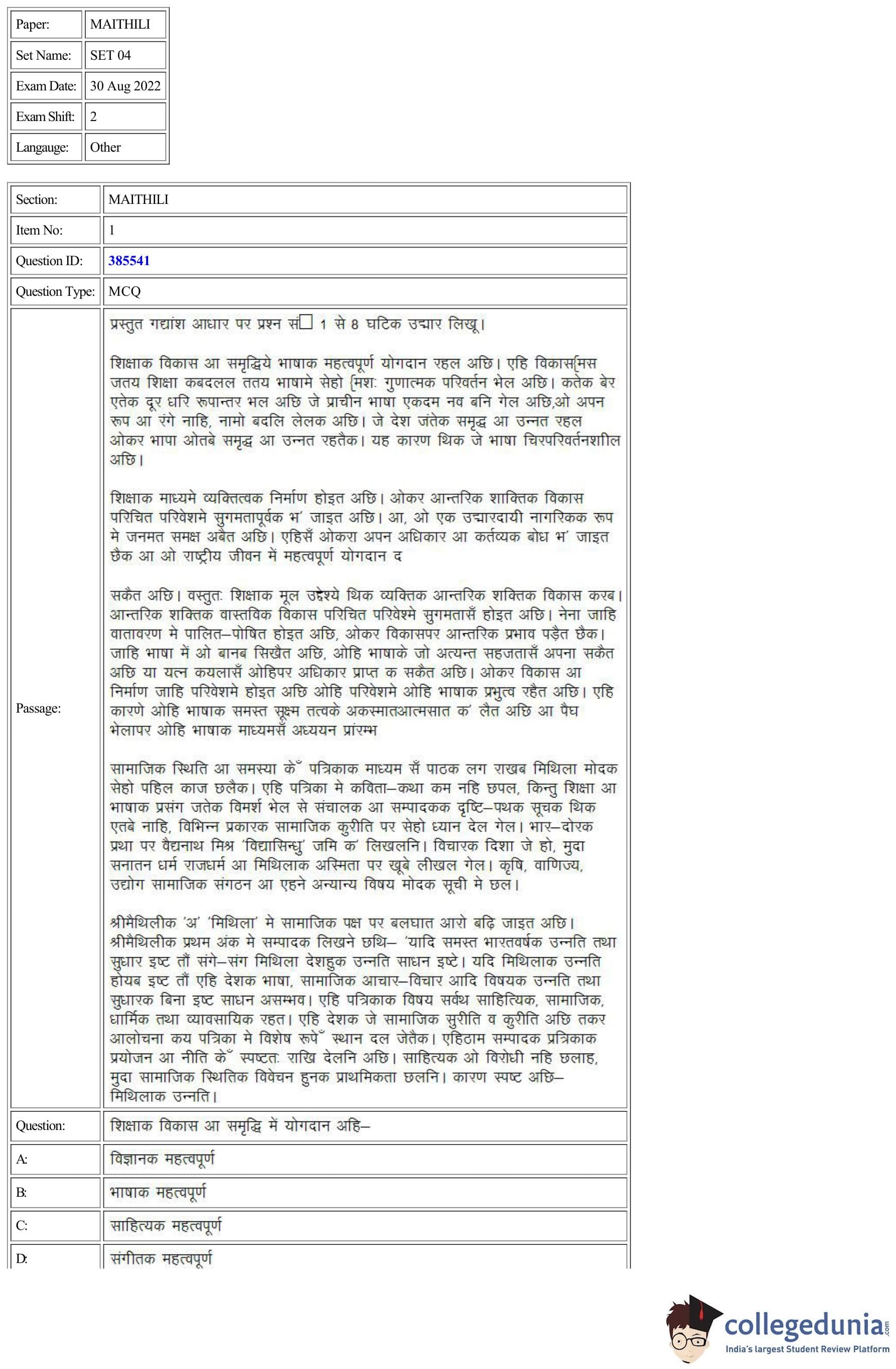 CUET Maithili Question Paper 2022 is available for download. CUET 2022 Maithili paper was conducted by National Testing Agency (NTA) on August 30, 2022 in Shift 2. The question paper comprised a total of 50 questions.