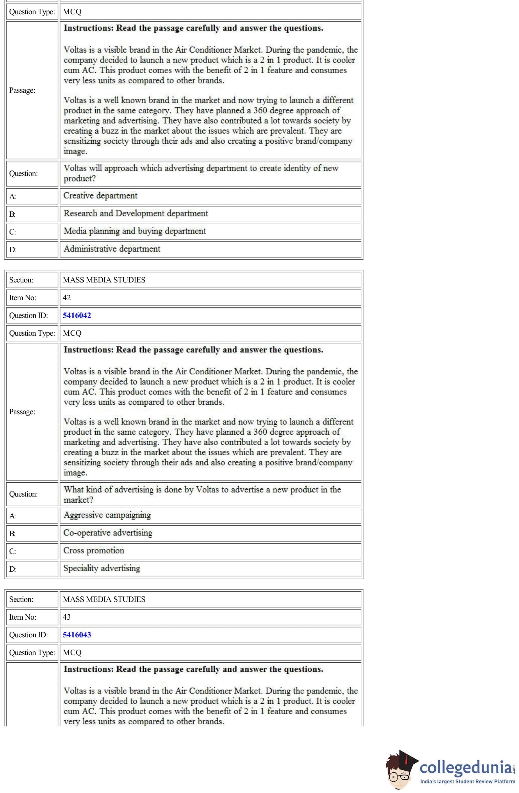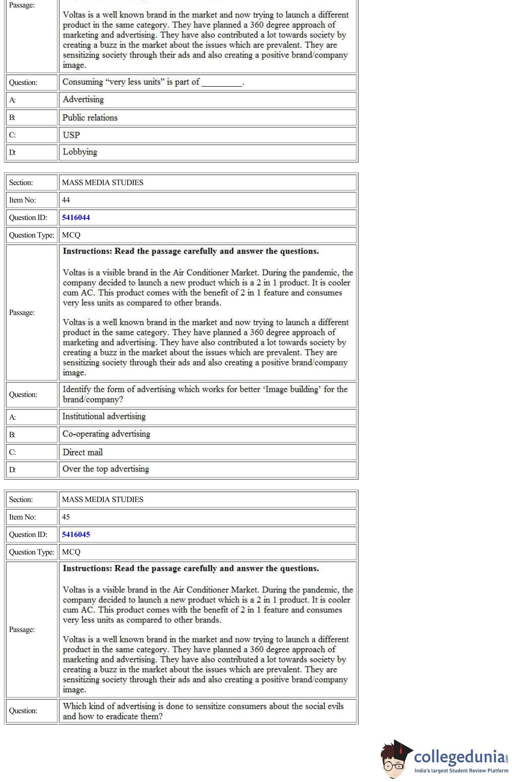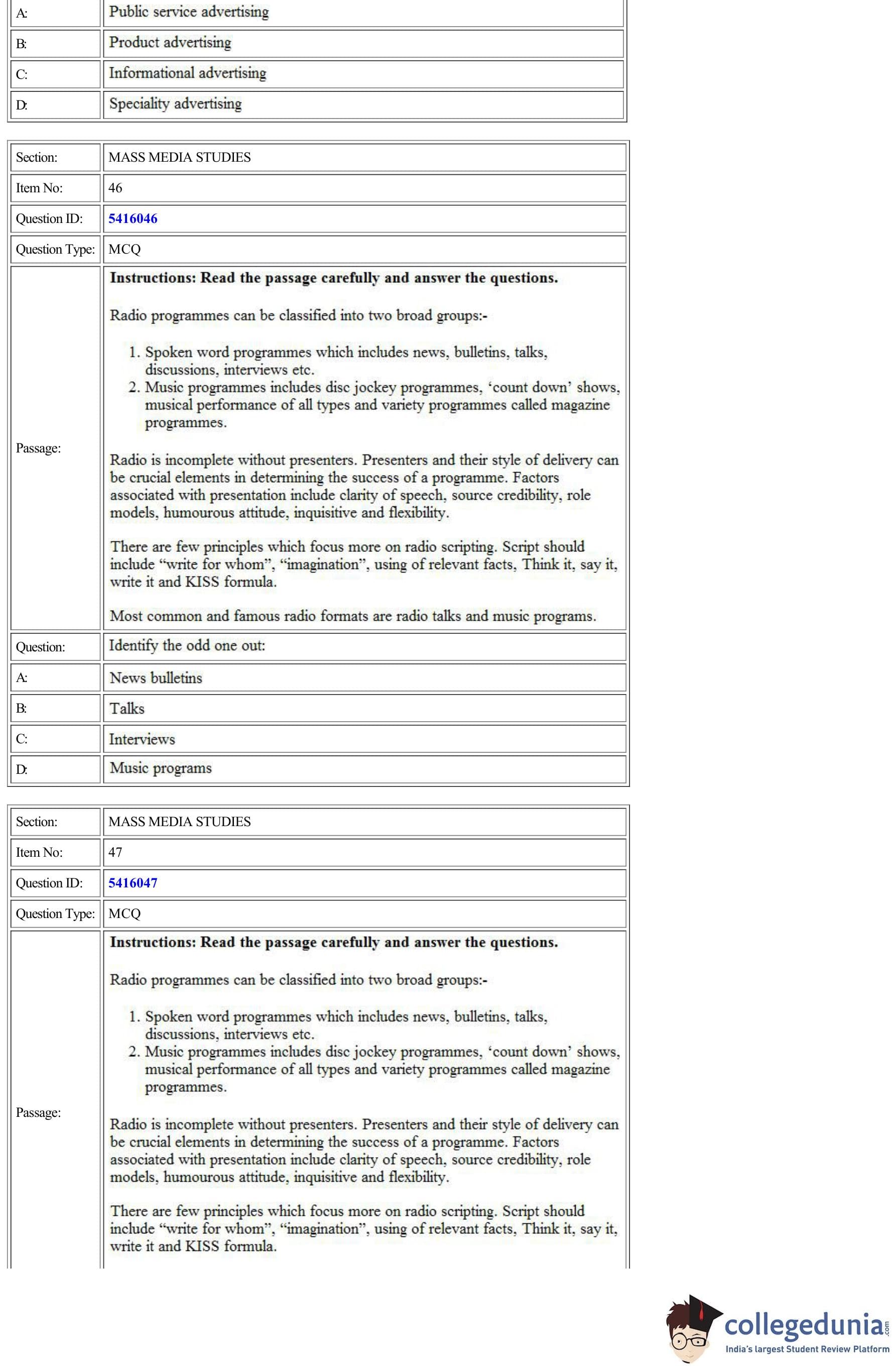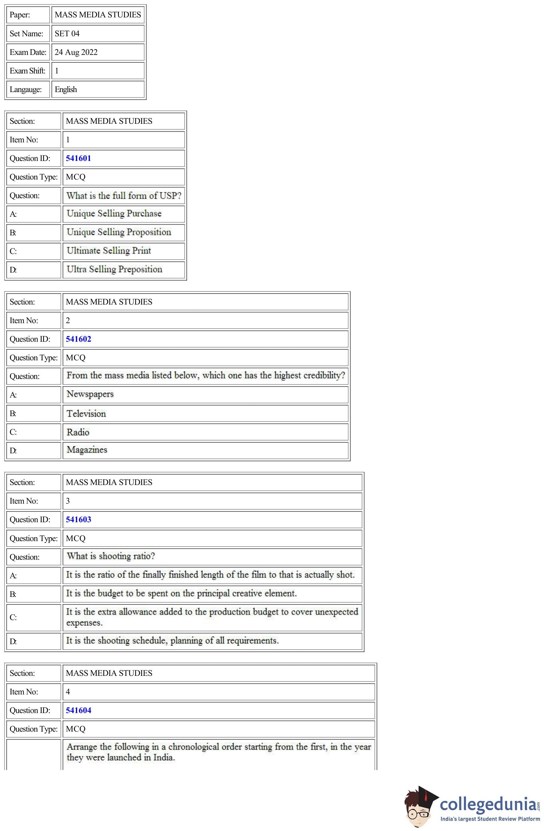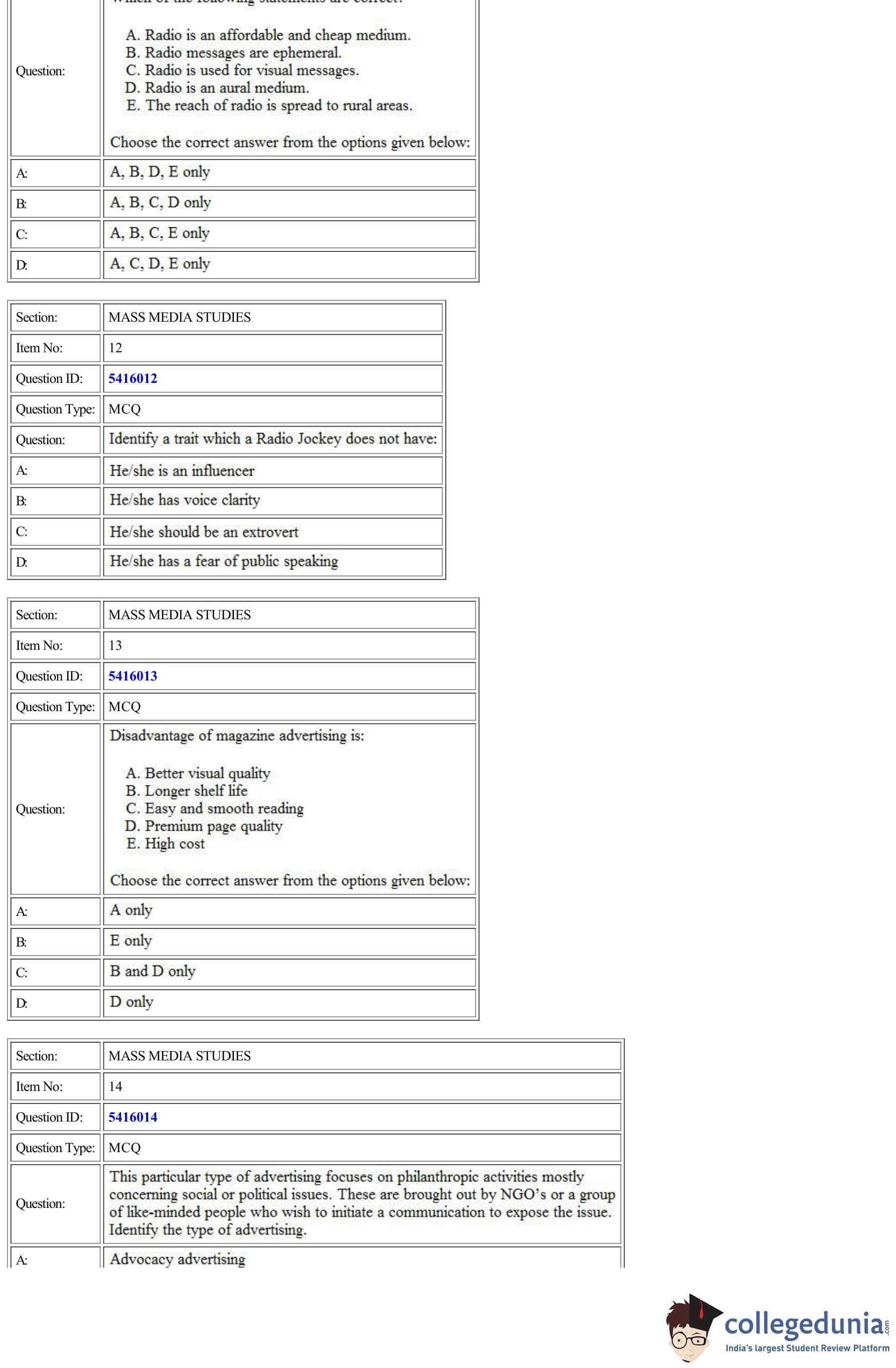 CUET Mass Media Studies Question Paper 2022 is available for download. CUET 2022 Mass Media Studies paper was conducted by National Testing Agency (NTA) on August 24, 2022 in Shift 1. The question paper comprised a total of 50 questions.