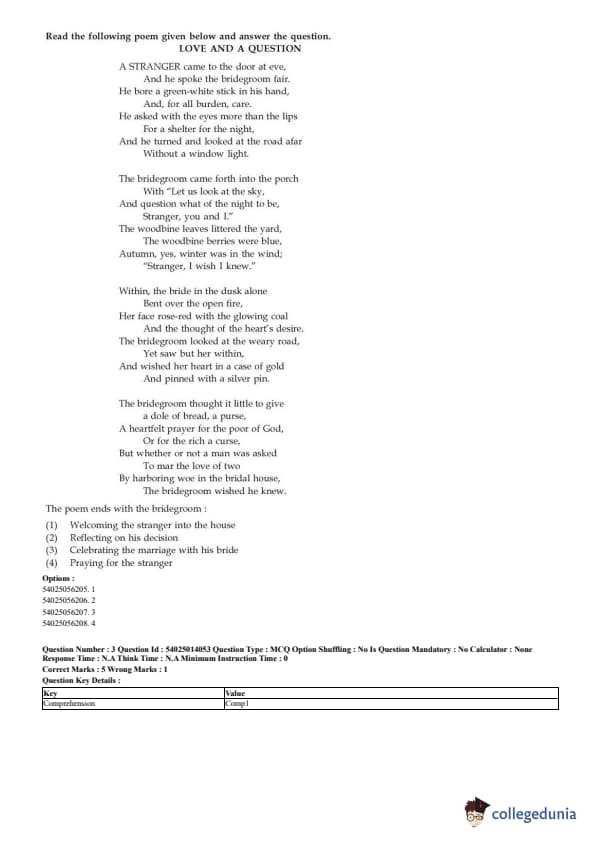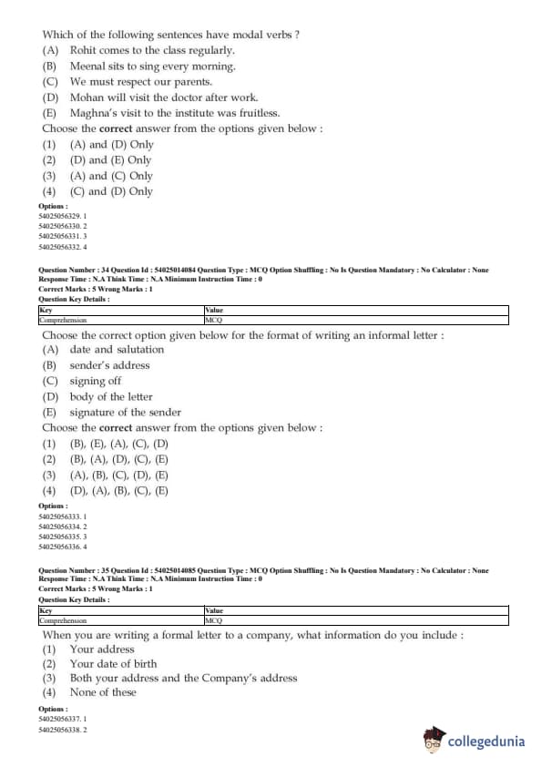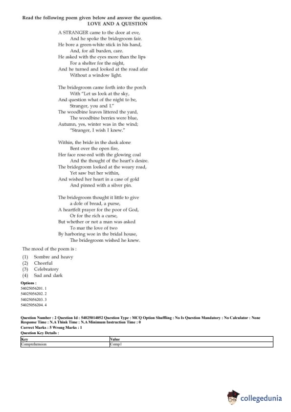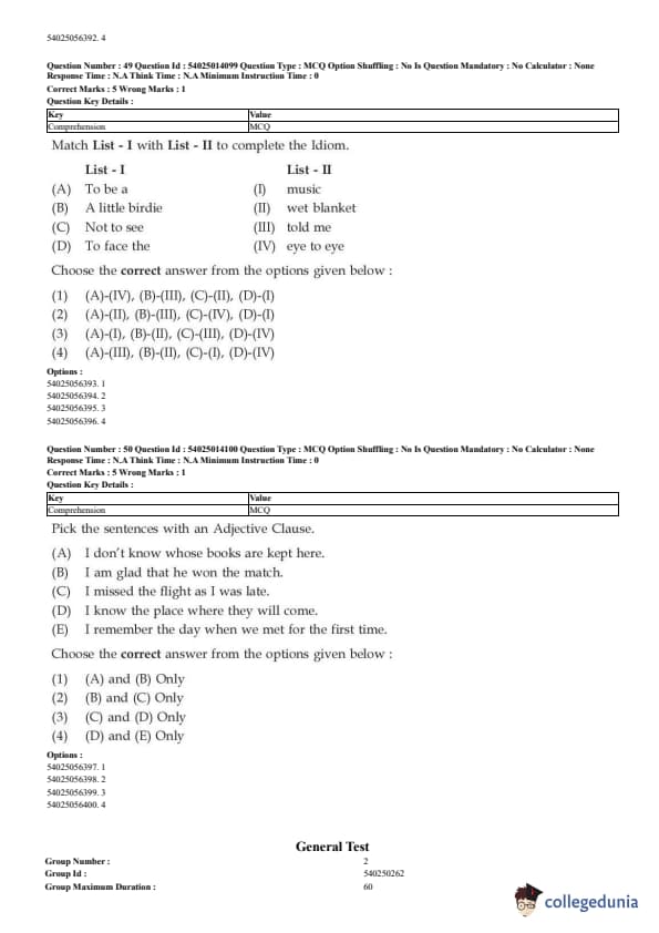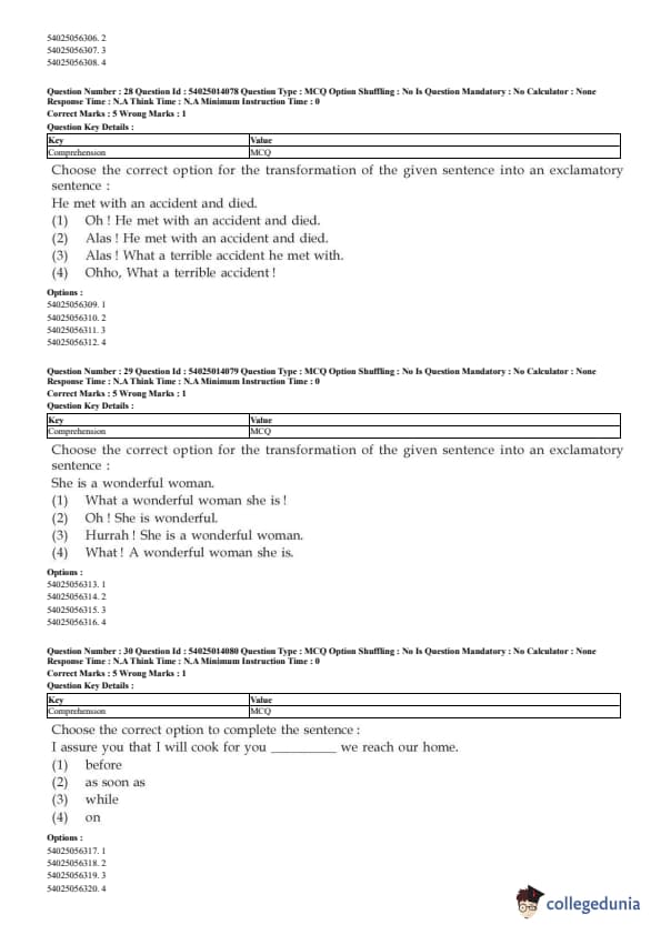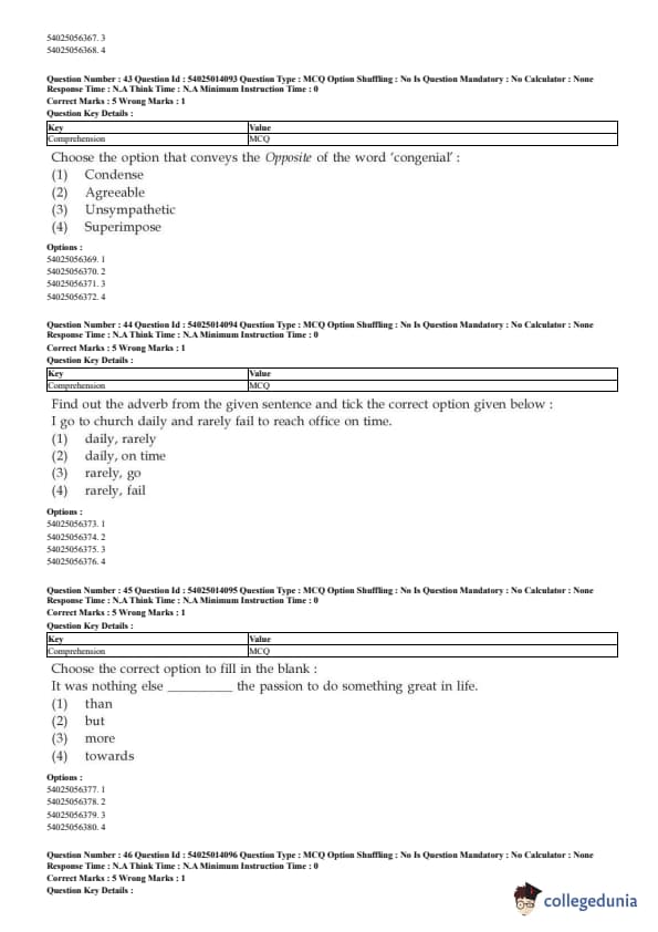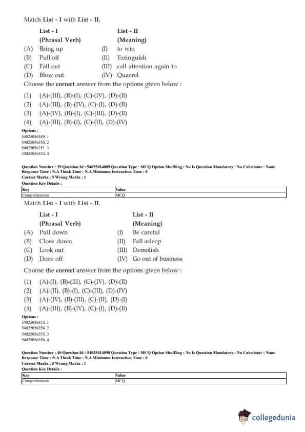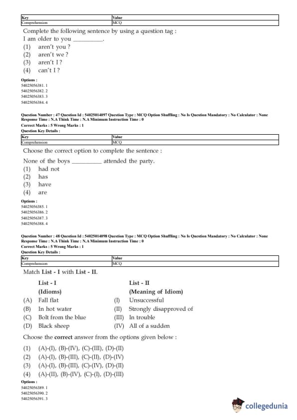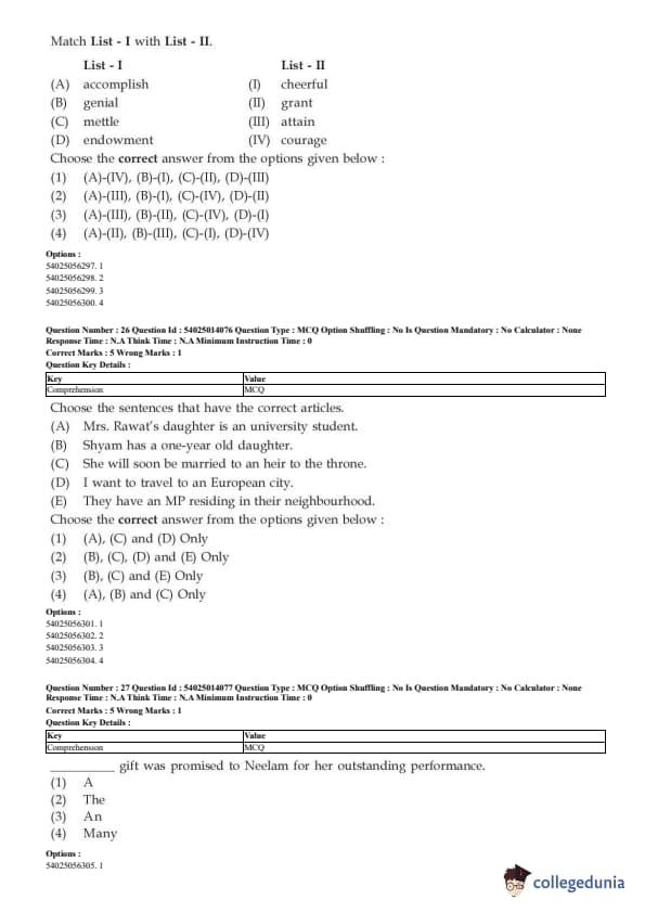 CUET English Question Paper 2023 is available here for June 1, May 31, 28, 27, 26, 24, 23, 22 and 21 . CUET English Question Paper 2023 is based on objective-type questions (MCQs). Candidates get 45 minutes to solve 50 MCQs out of 40 in CUET English question paper 2023.
